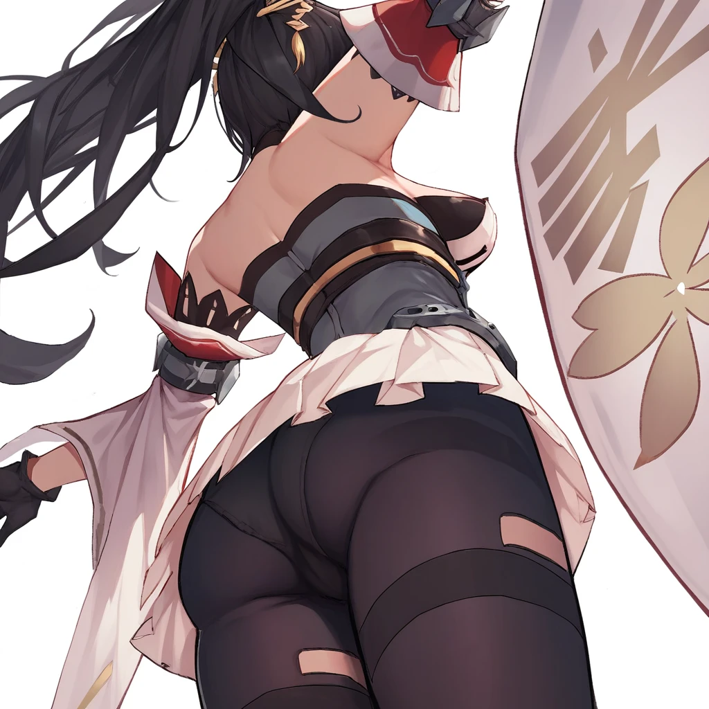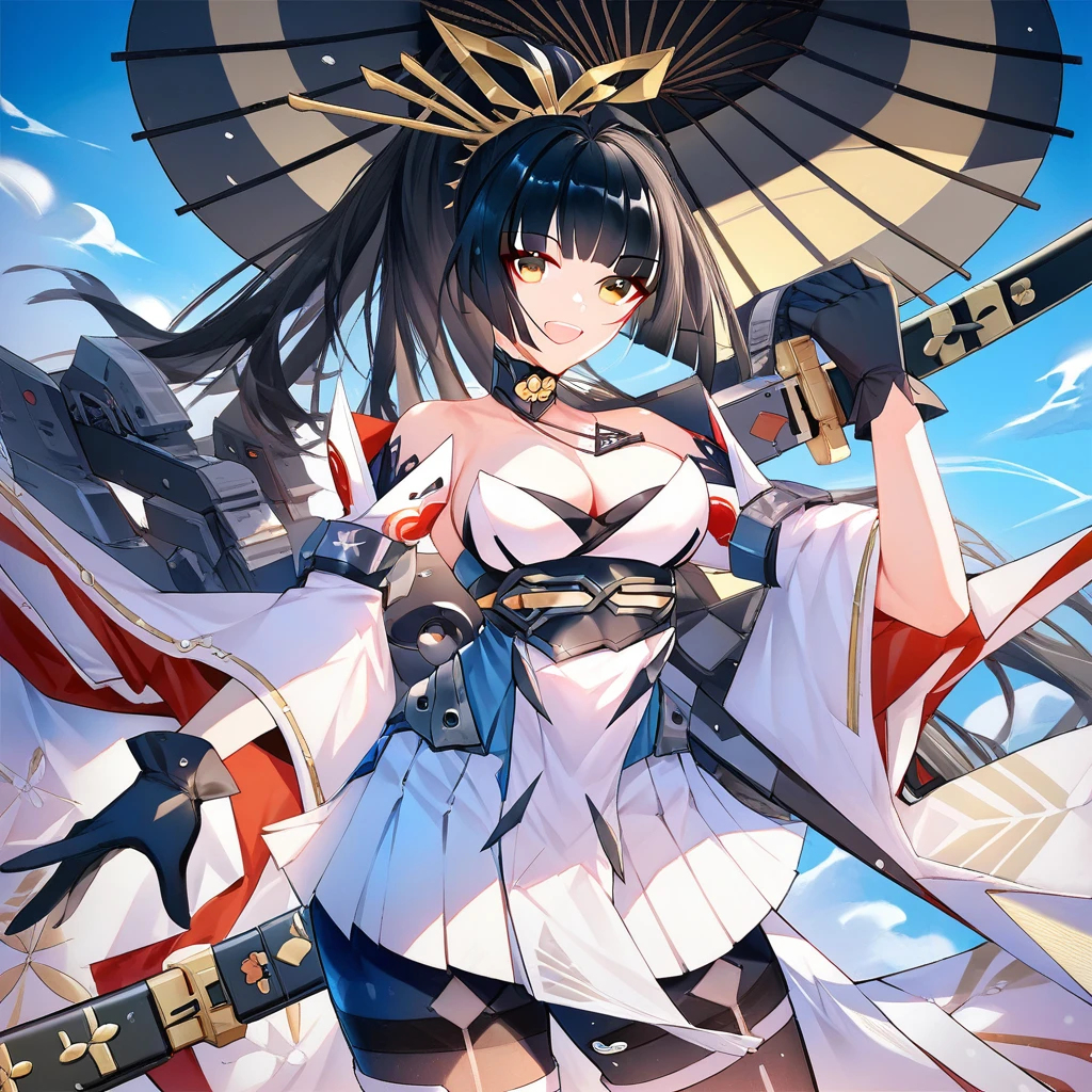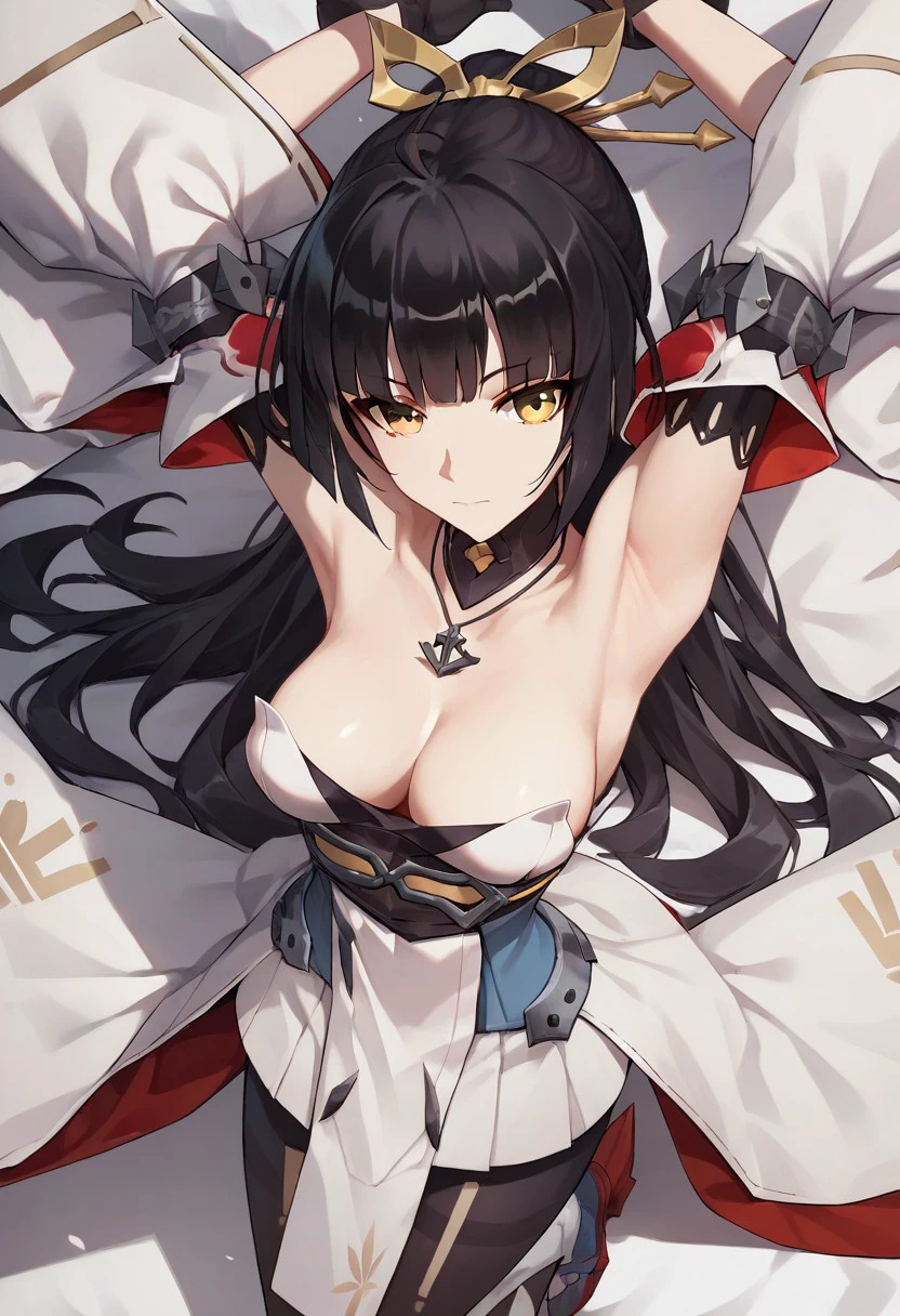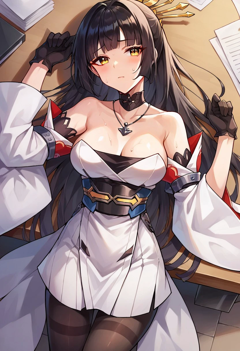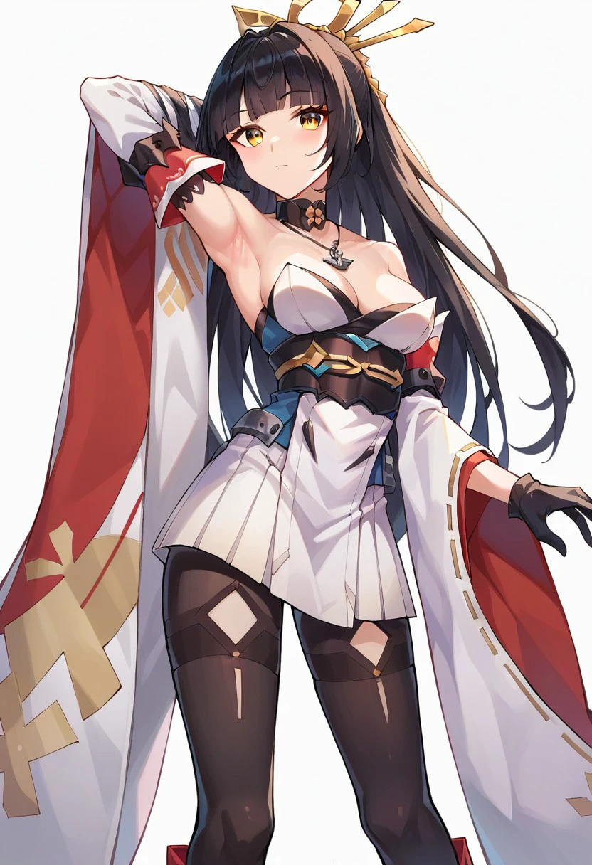 akagi_default, gloves, black gloves, breasts, necklace, strapless, japanese clothes, white dress, detached sleeves, wide sleeves, sash, black pantyhose,in full body (if need) :