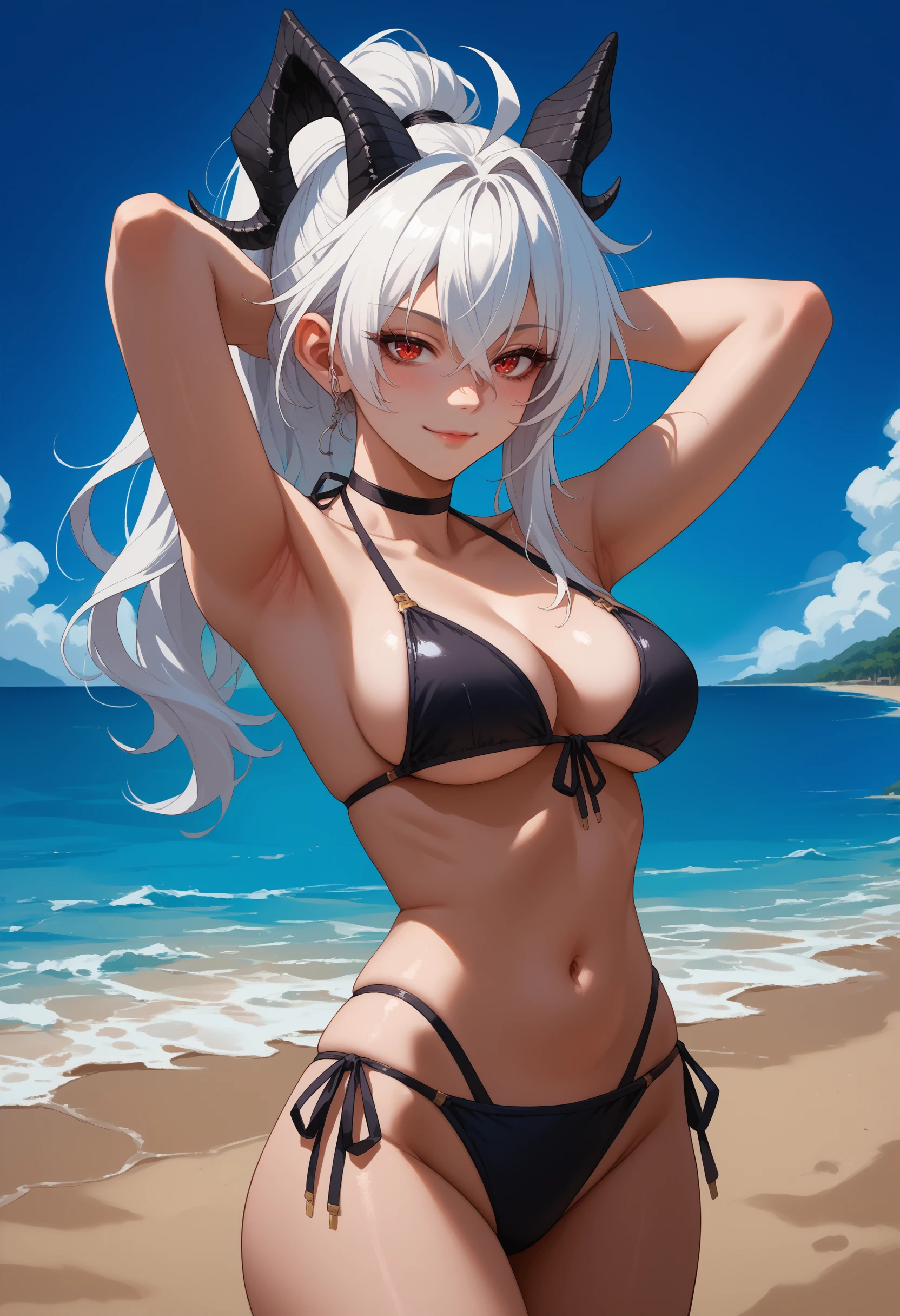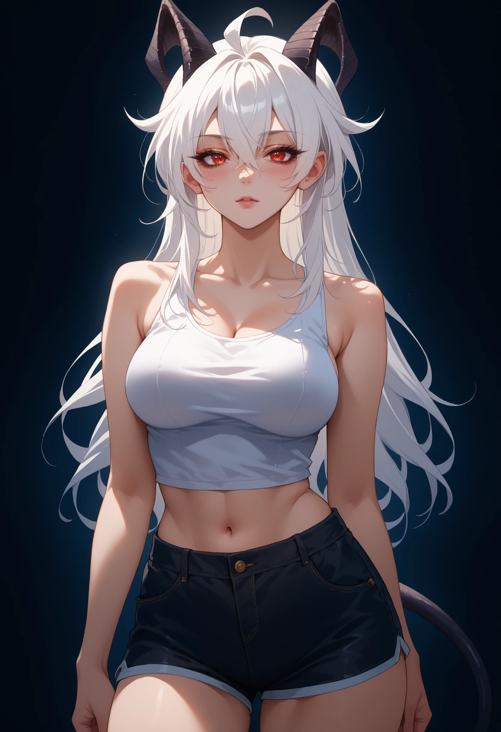 Trigger: wrnchwuwazani, horns, hair between eyes, red eyes, long hair, large breasts, white hair, demon horns, ahoge, demon tail