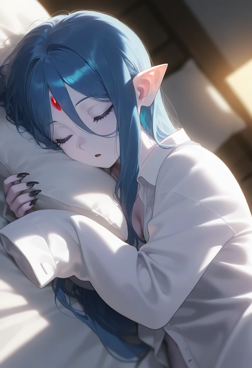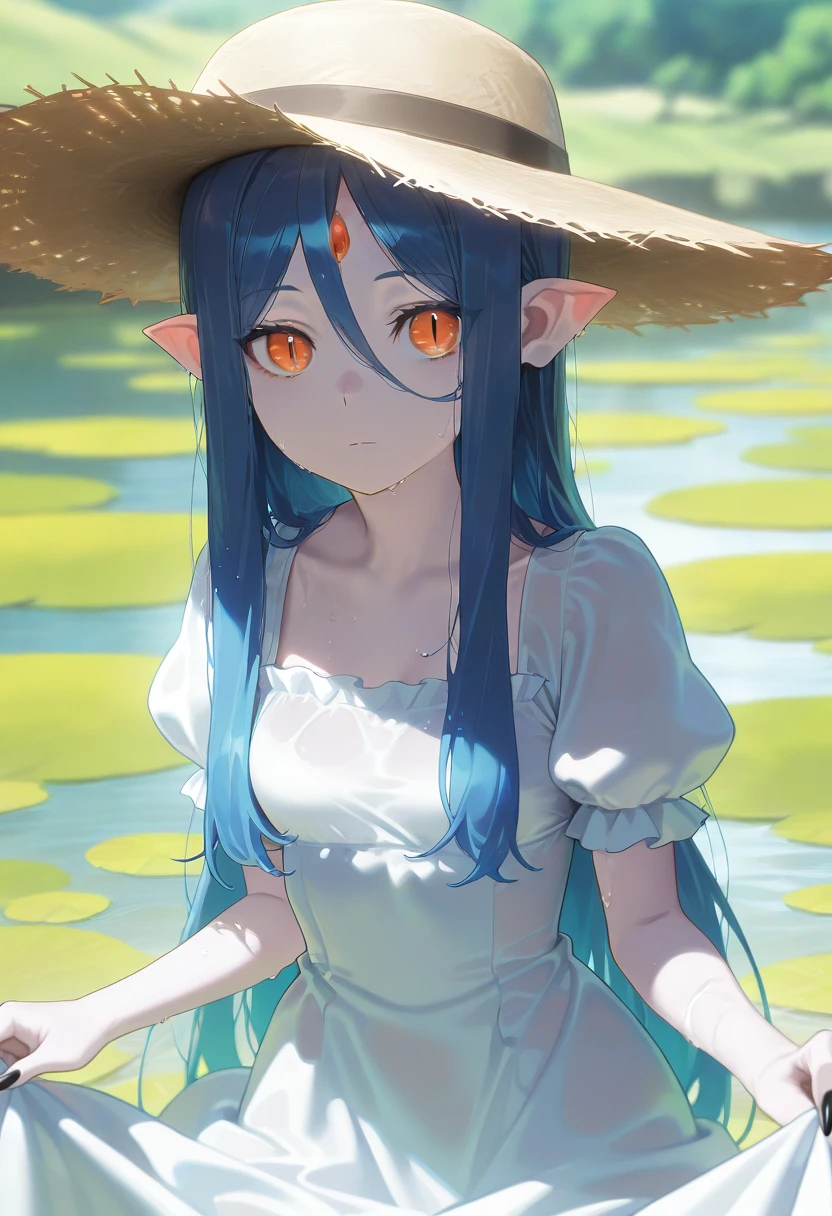 1girl, solo, long hair, small breasts, hair between eyes, blue hair, pointy ears, orange eyes, colored skin, black nails, slit pupils, monster girl, pale skin, long fingernails, sharp fingernails, forehead jewel,