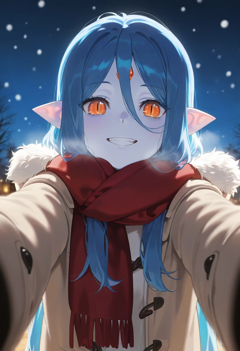 Tags for her look: 1girl, solo, long hair, small breasts, hair between eyes, blue hair, pointy ears, orange eyes, colored skin, black nails, slit pupils, monster girl, pale skin, long fingernails, sharp fingernails, forehead jewel,