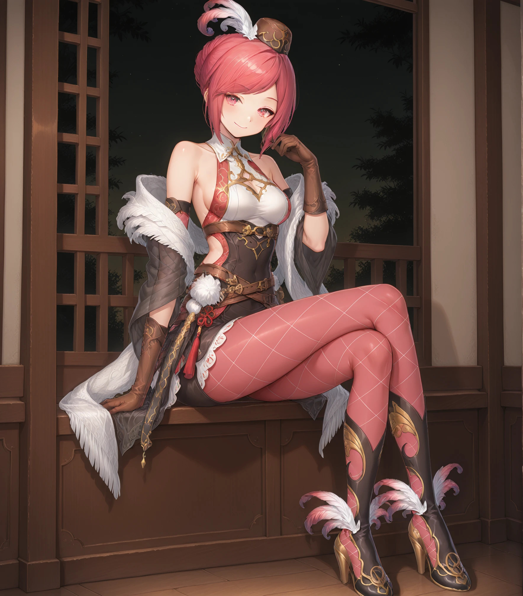 fl4mmy,red hair,mini hat, feathers,red eyes 1girl, solo, , looking at viewer, smile, short hair, bangs, simple background, gloves, hat,,tight skirt, tight clothes, single hair bun, night, tassel, brown gloves, white collar, black white shawl, white tassels shawl,