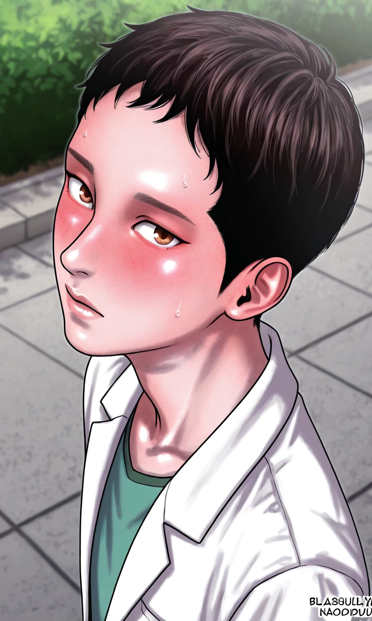 naodoujin, black hair, very short hair, blush, brown eyes