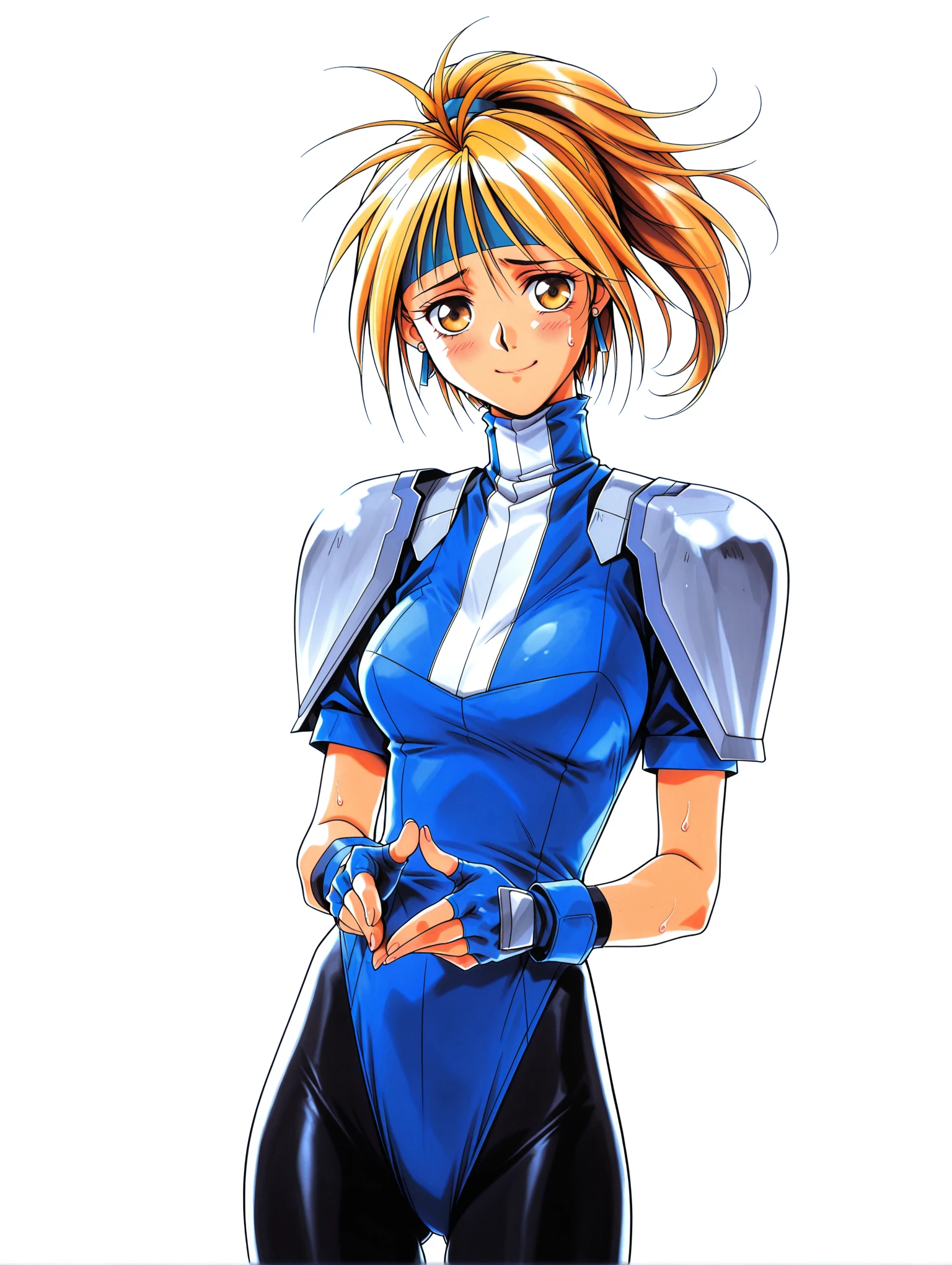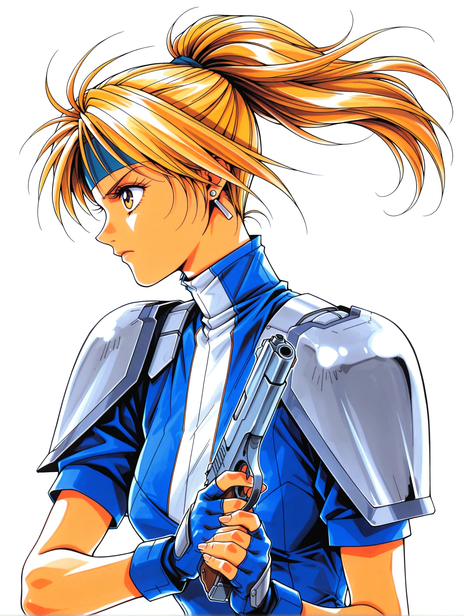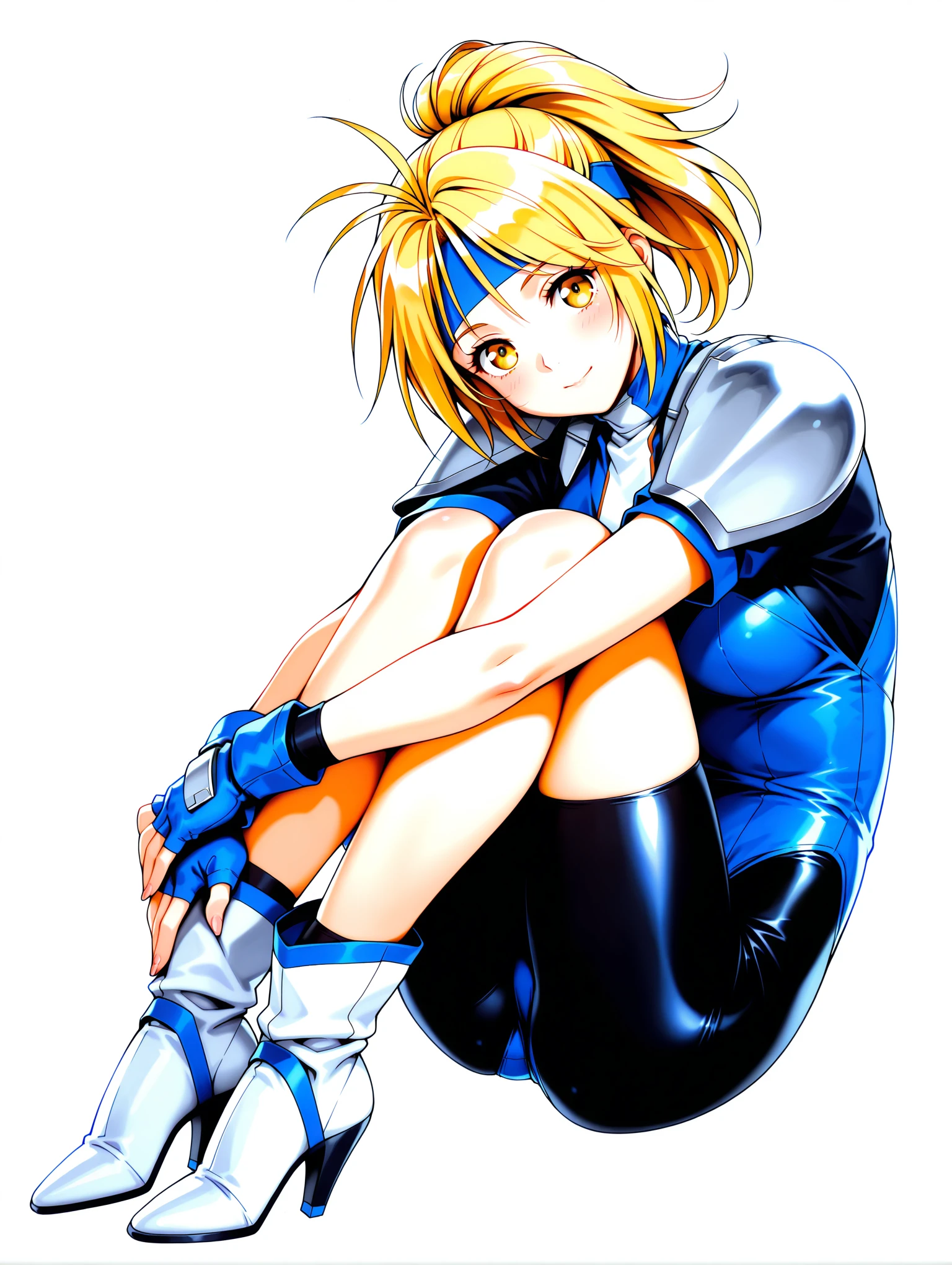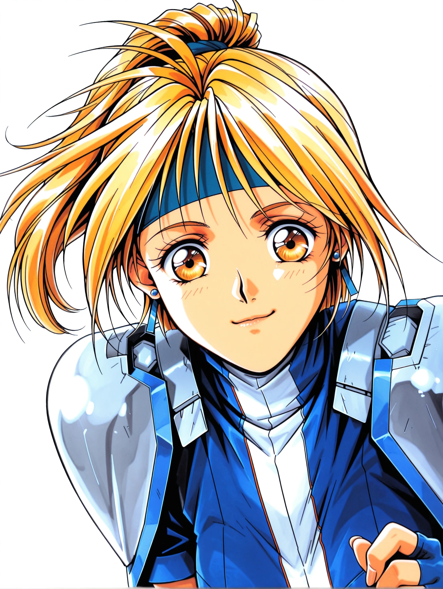 faith_smollet,earrings,antenna hair,blue headband,high ponytail,blonde hair,yellow eyes,