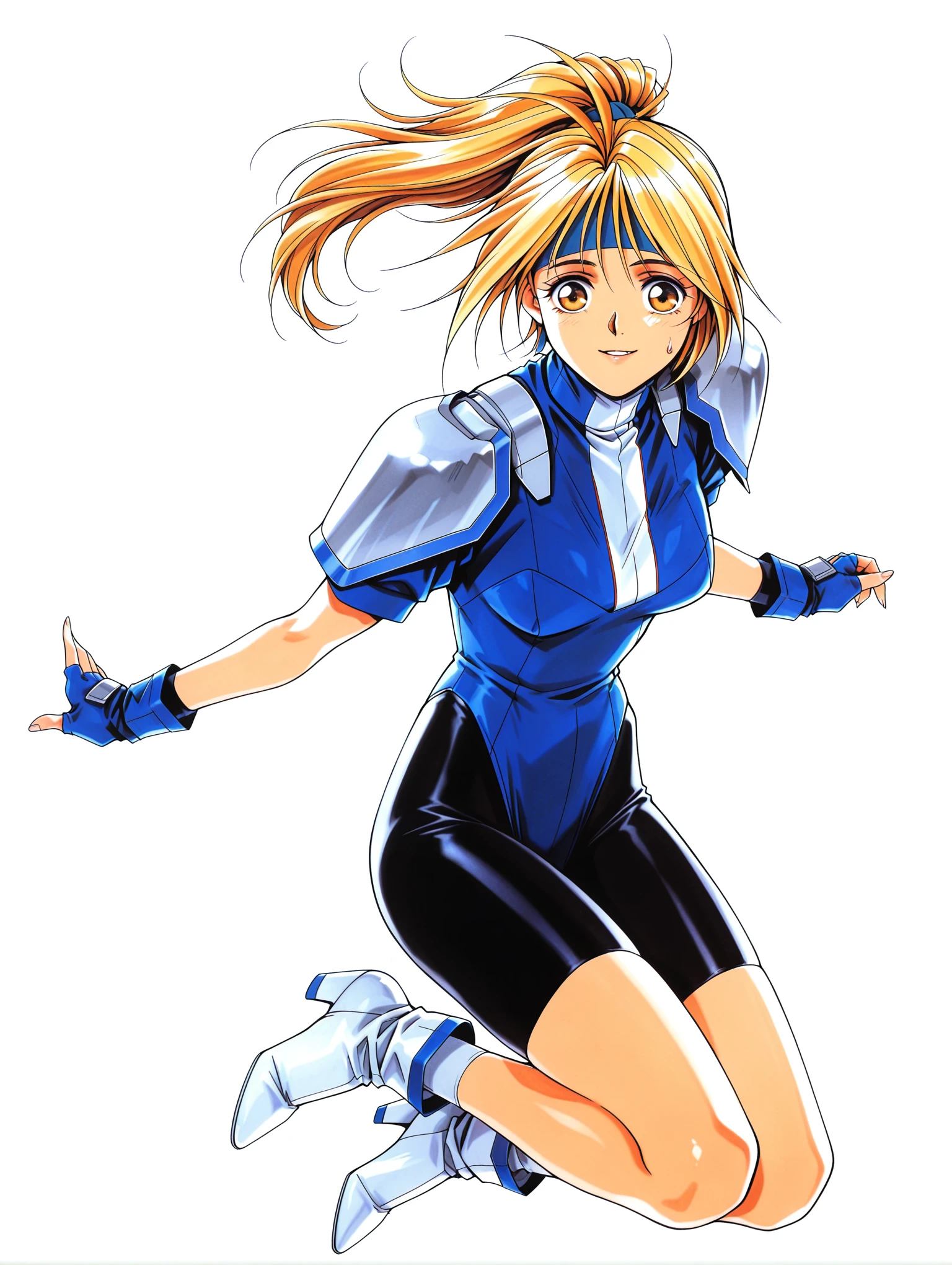f_suit,turtleneck,pauldrons,,short sleeves,blue fingerless gloves,blue leotard,spandex,bike shorts,ankle boots,high heels,