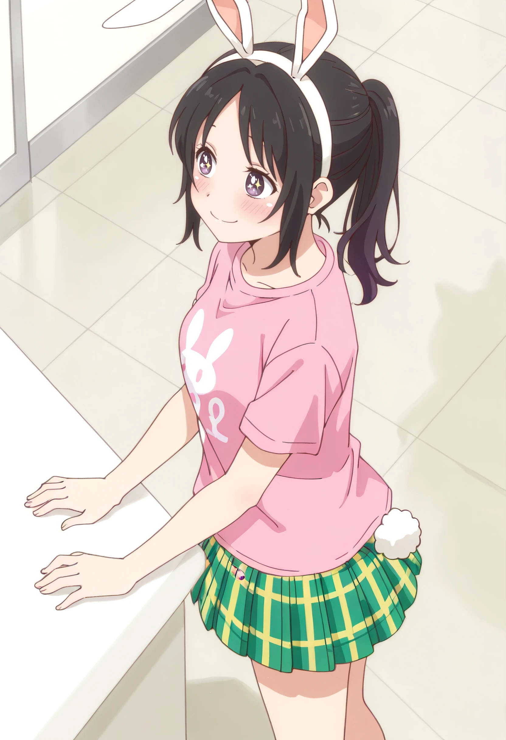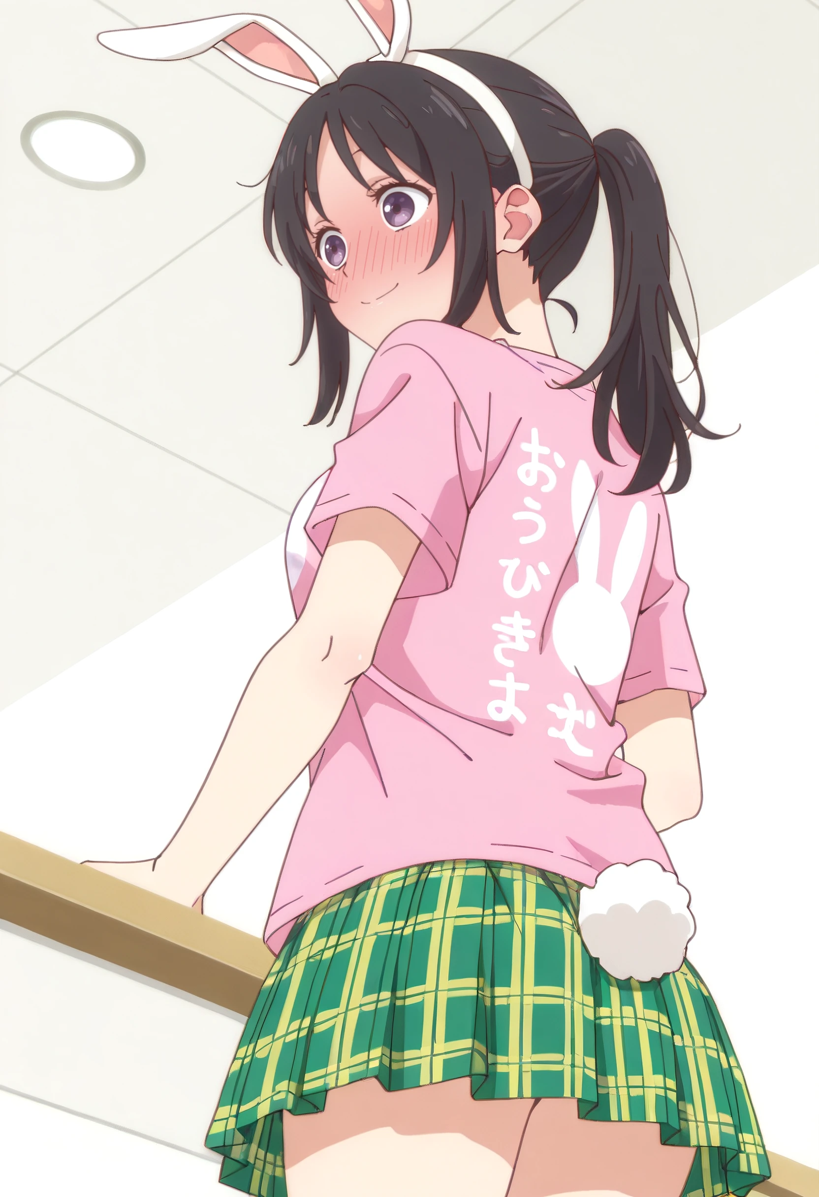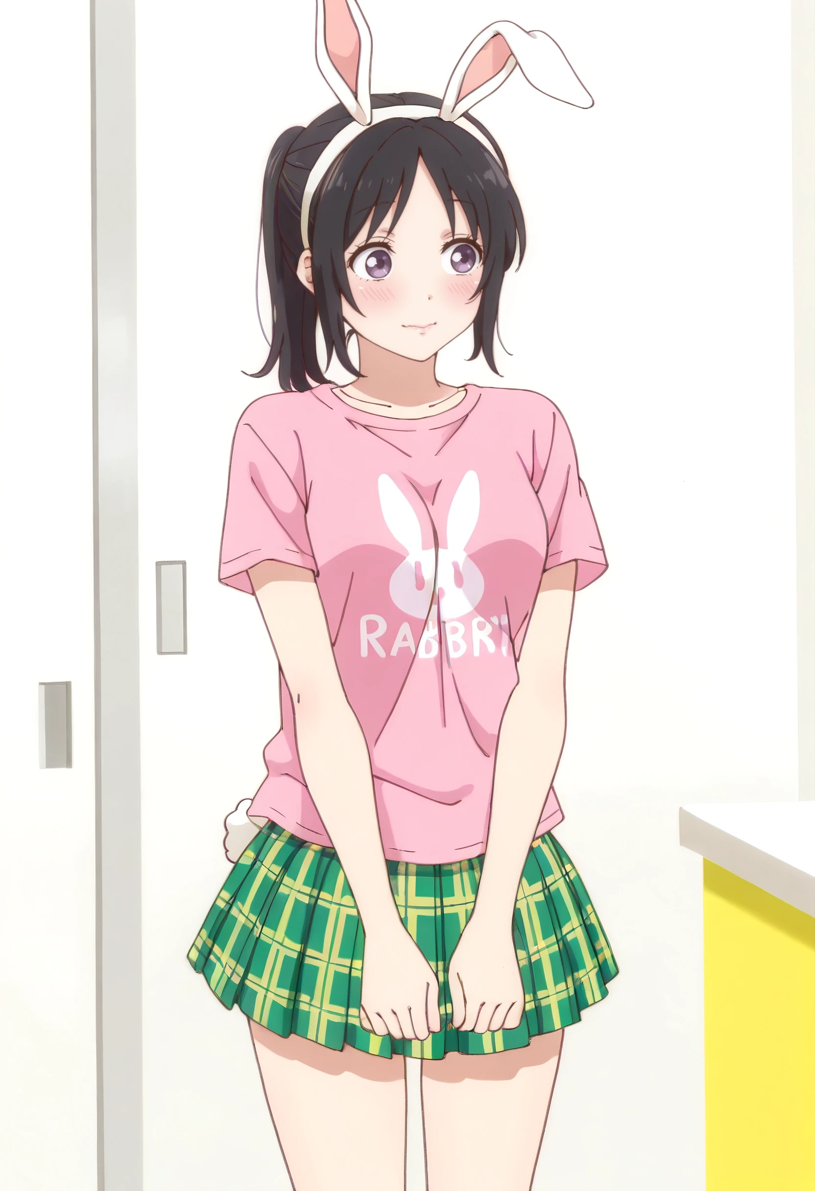 AkariShirt, animal ears, rabbit ears, shirt, pink shirt, t-shirt, fake animal ears, skirt, plaid skirt, plaid clothes, short sleeves, pleated skirt, rabbit tail, tail, clothes writing, rabbit girl, rabbit print, animal print, green skirt, hairband, white hairband, miniskirt, yellow skirt,