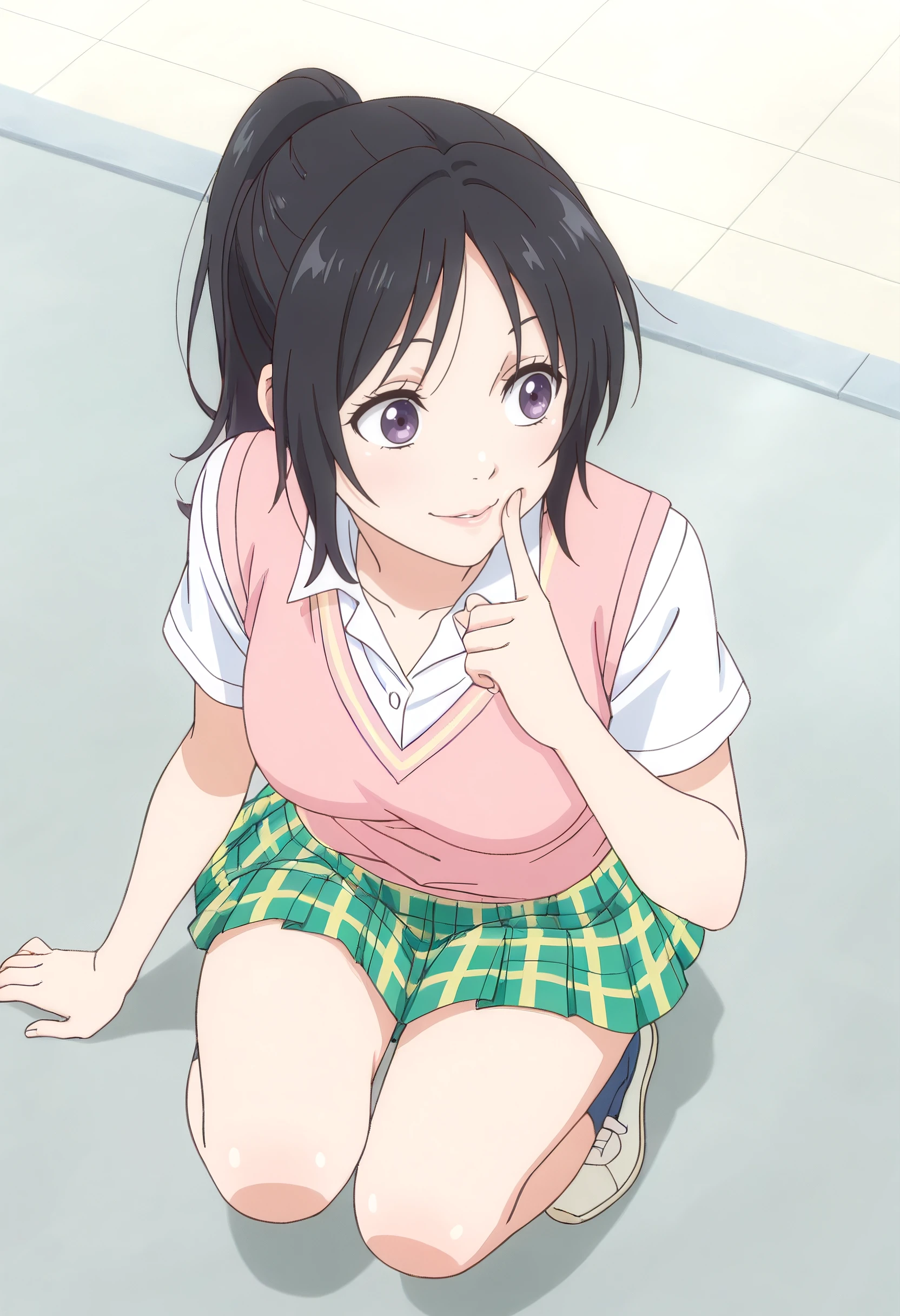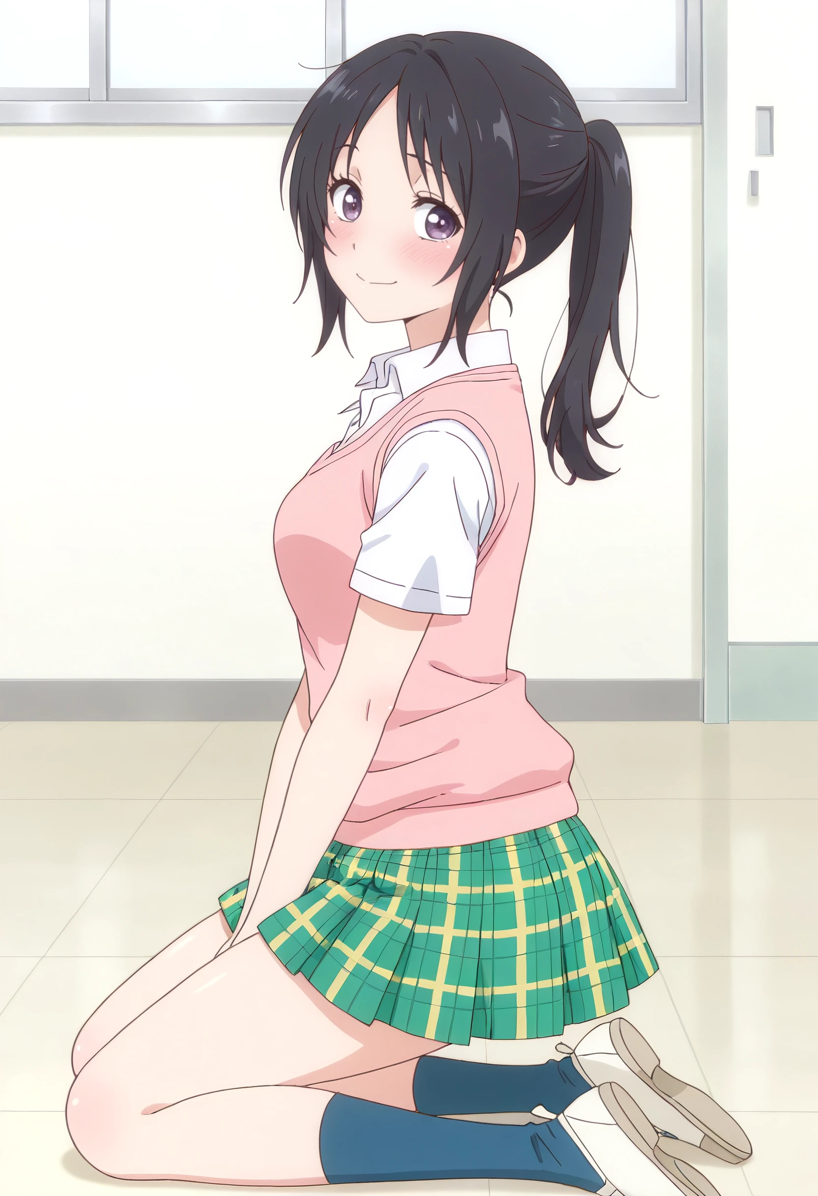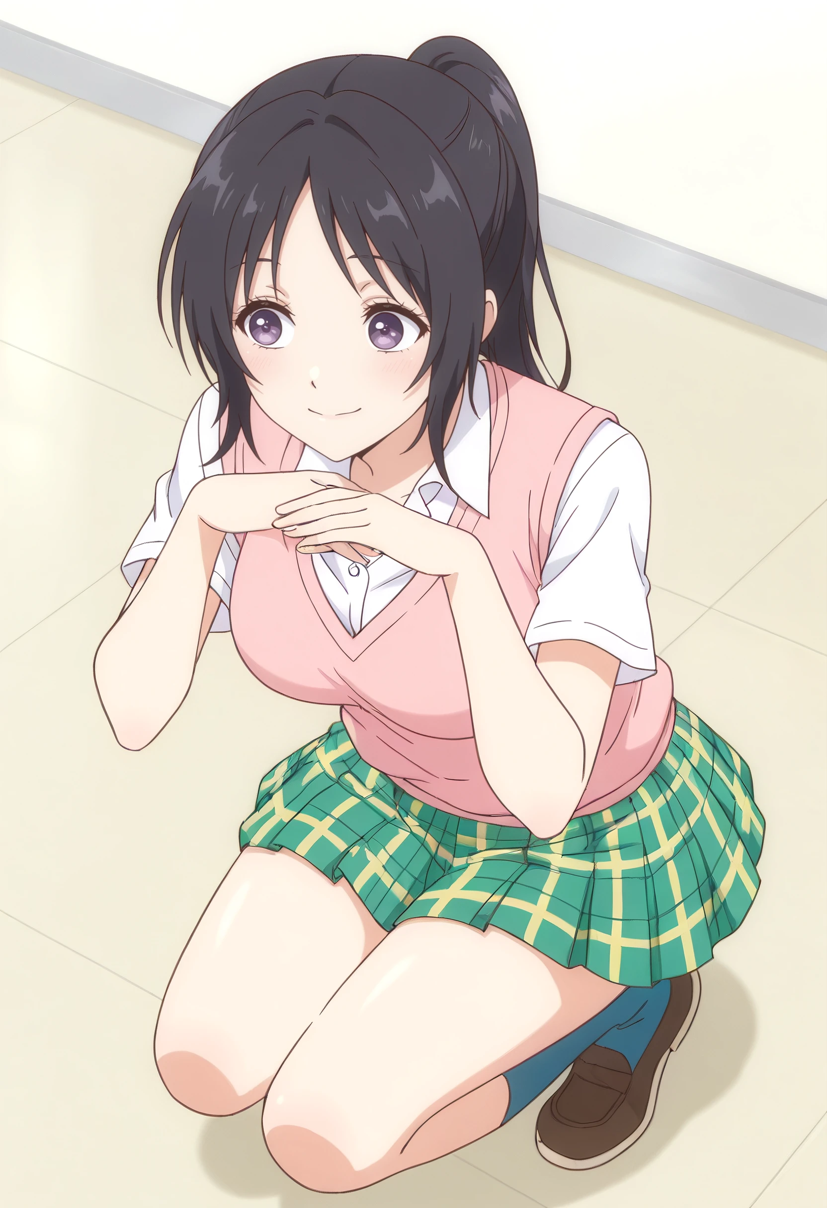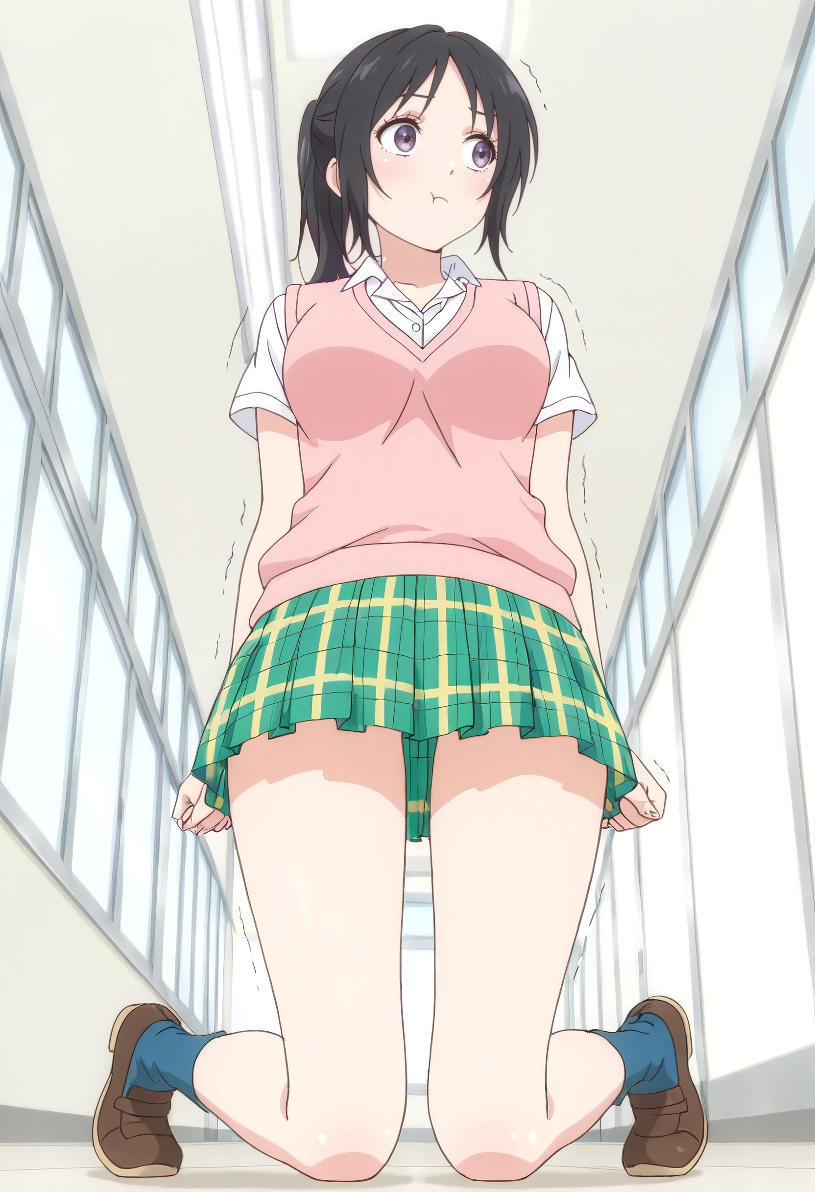 AkariSkirt, shirt, school uniform, white shirt, collared shirt, sweater vest, vest, pink sweater vest, skirt, plaid clothes, plaid skirt, short sleeves, pink vest, pleated skirt, green skirt, yellow skirt, miniskirt, socks, shoes, blue socks,