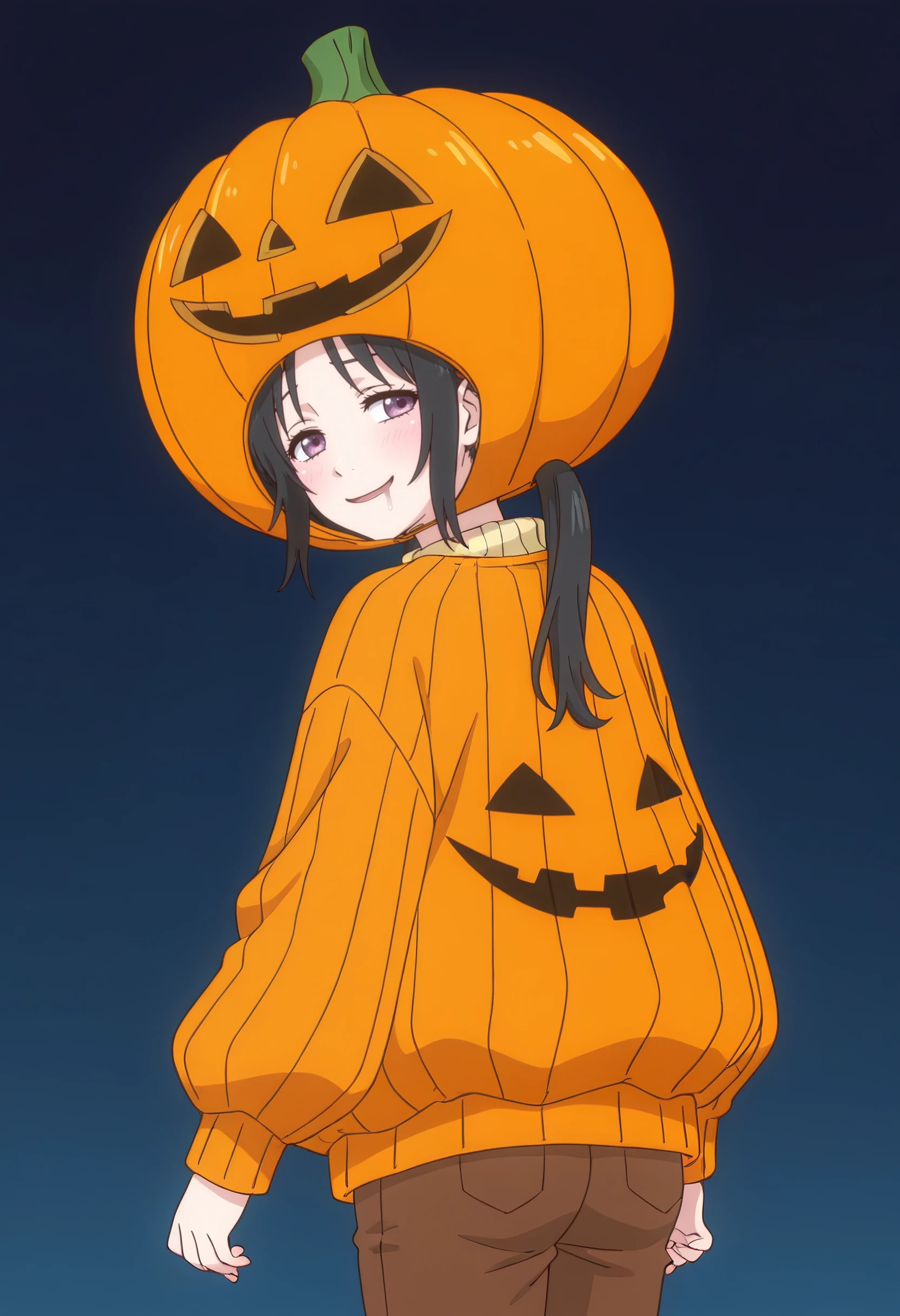 AkariHalloween, halloween, jack-o'-lantern, pumpkin, halloween costume, pumpkin hat, costume, short hair, long sleeves, orange headwear, pants, orange dress, trick or treat, helmet, sweater, brown pants, ribbed sweater, orange jacket,