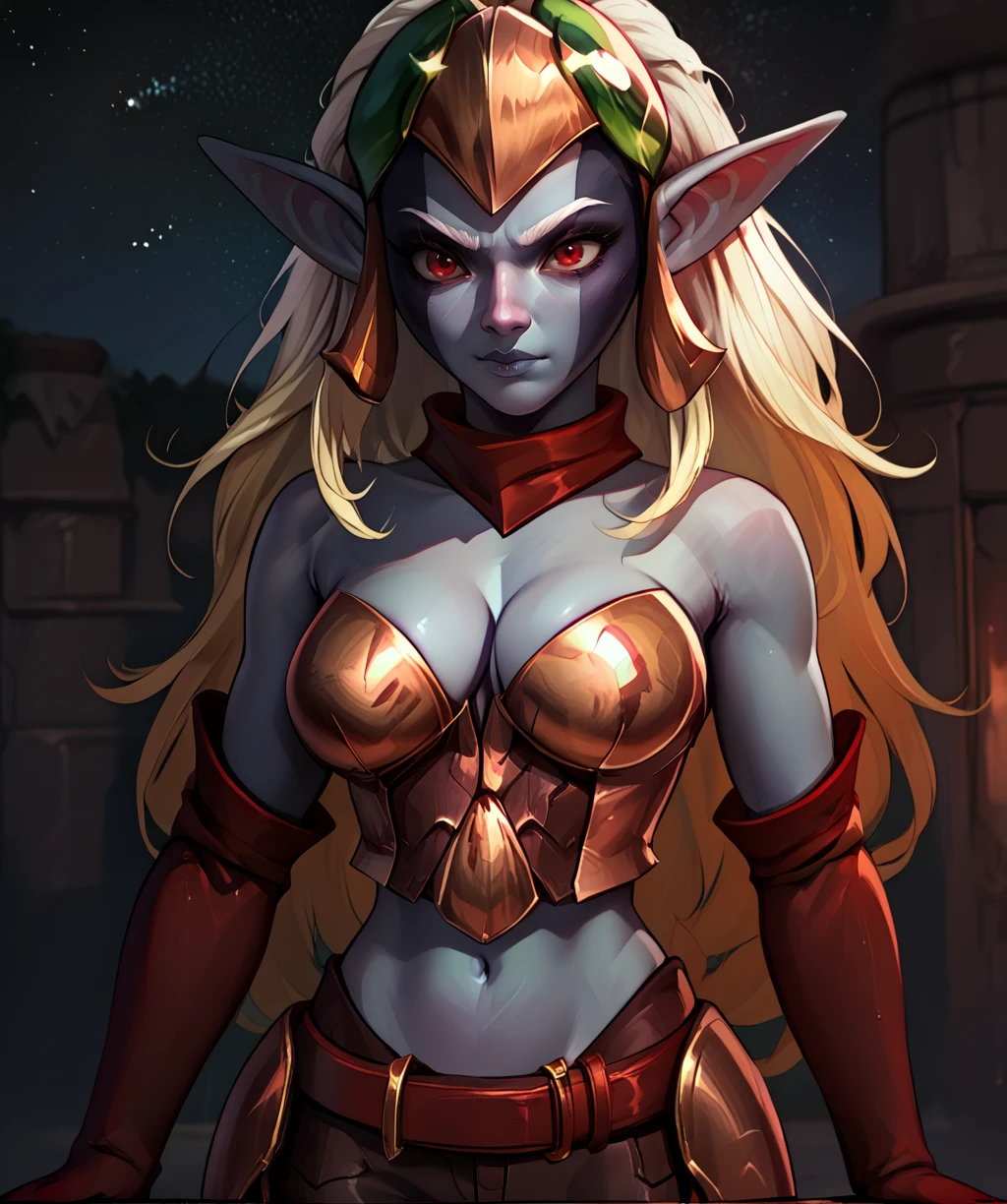 elbow gloves, cleavage, armor, helmet, red neck collar, or scarf, belt, pants, midriff, or crop top,