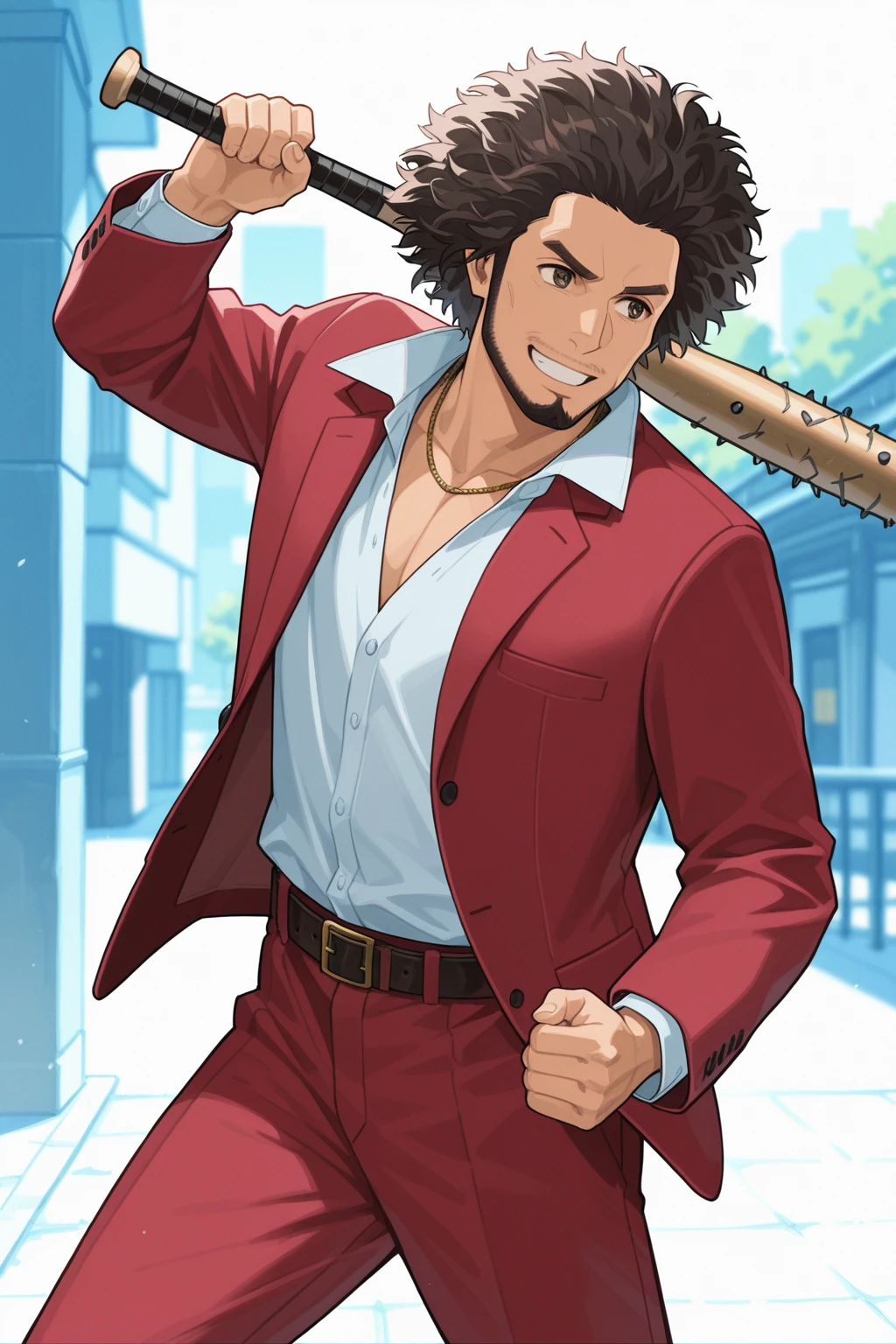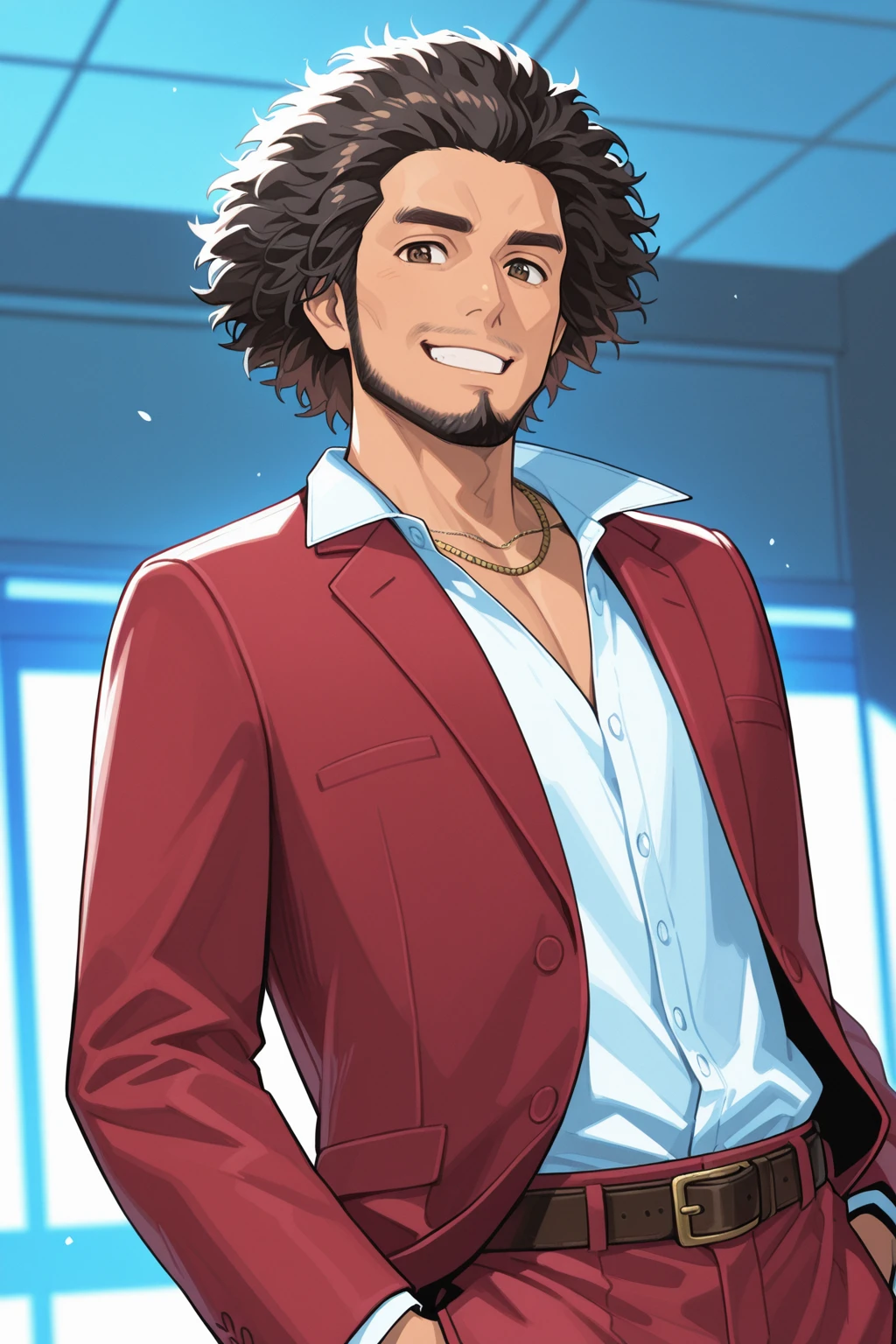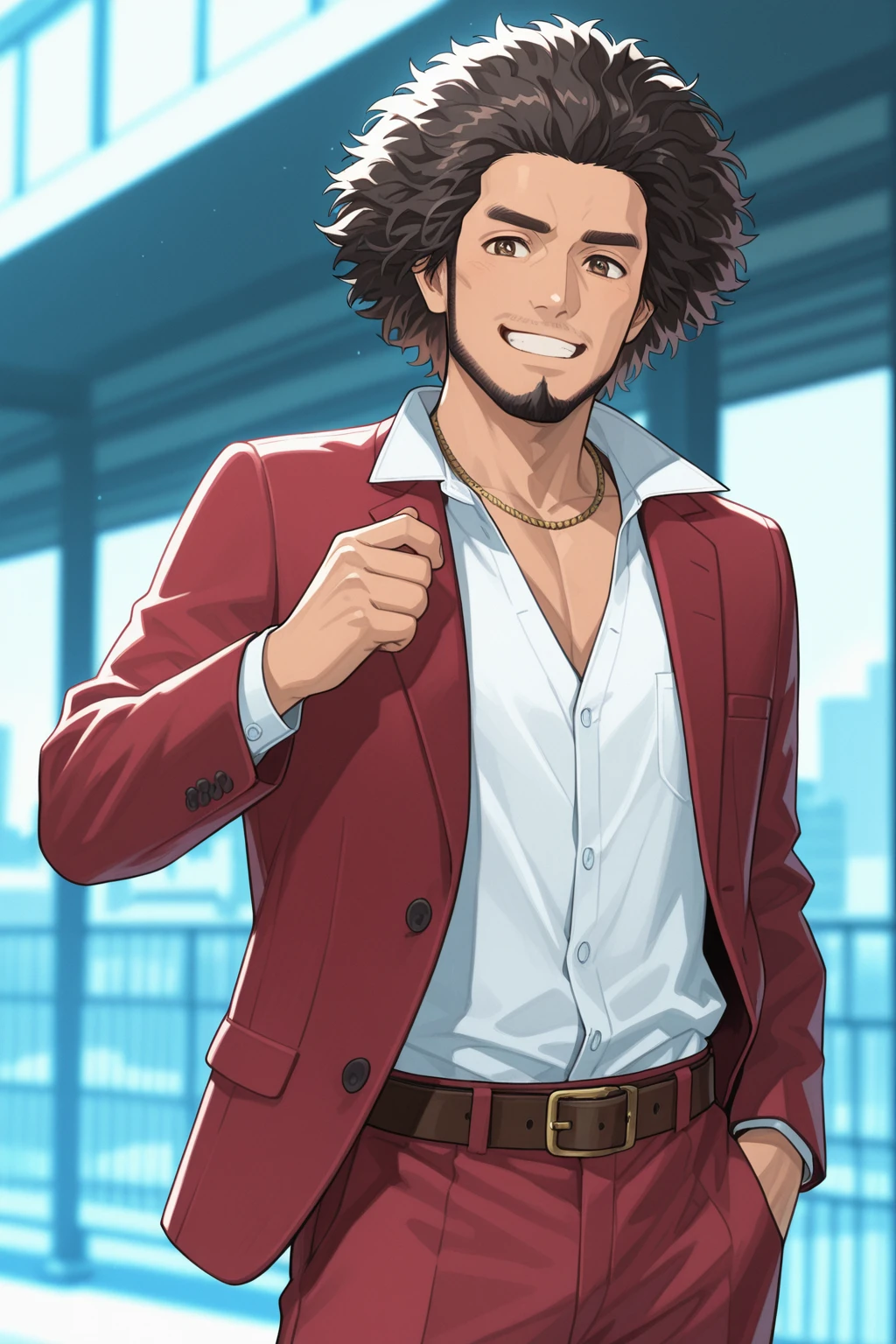 yokohama_outfit, necklace, red jacket, collared Shirt, White Shirt, suit, red suit, belt, pants