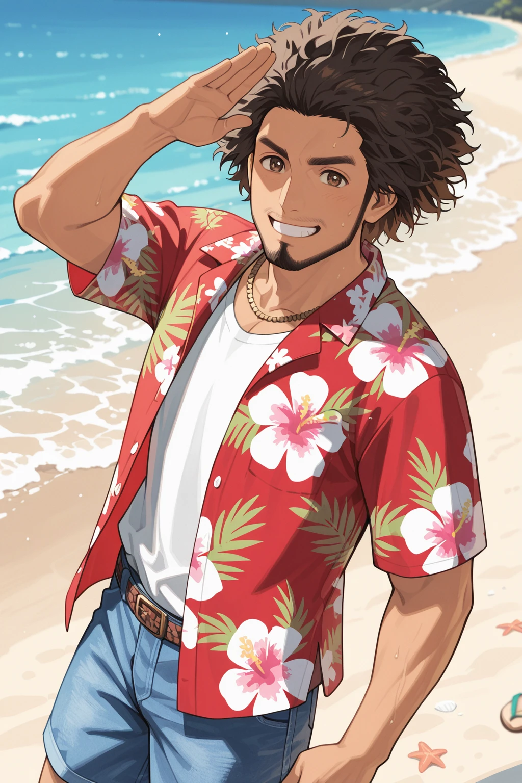 hawaii_outfit, necklace, hawaiian shirt, jeans, short pants, rolled up pants, rolled up jeans, sandals,