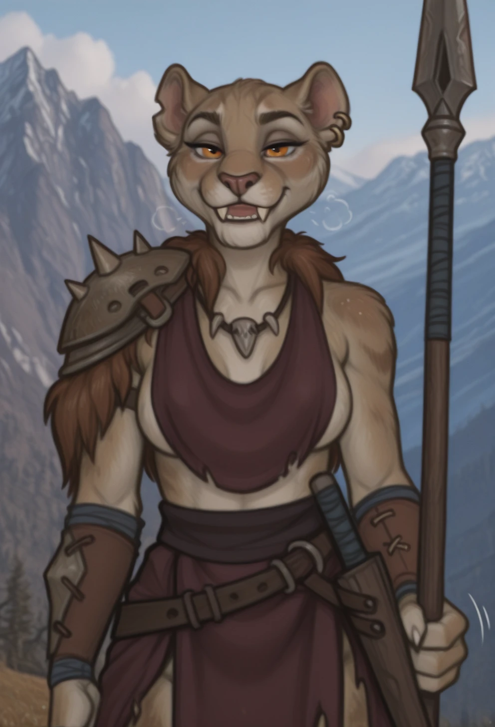 bedroom eyes, detailed eyes, perfect eyes, beautiful eyes, detailed fur, tail, realistic fur, 1girl, young, (((handsome, detailed face and eyes))), solo, anthro, girl, furry, animal ears, furry female, naughty, sexy, realistic eyes, female, eyes, anthro, fangs, eye shine, Drevonia, Drevonia_Soulcreek, sabercat, feline, short tail, orange eyes, medium breasts, tribal clothes, shoulder pad, belt, jewellery, pierced ears, underboob, sideboob, wrist wraps, sharp teeth, long teeth, shoulder armor, pauldron, armor, HDEYES, DETAILED EYES, perfect orange eyes, vibrant orange eyes,