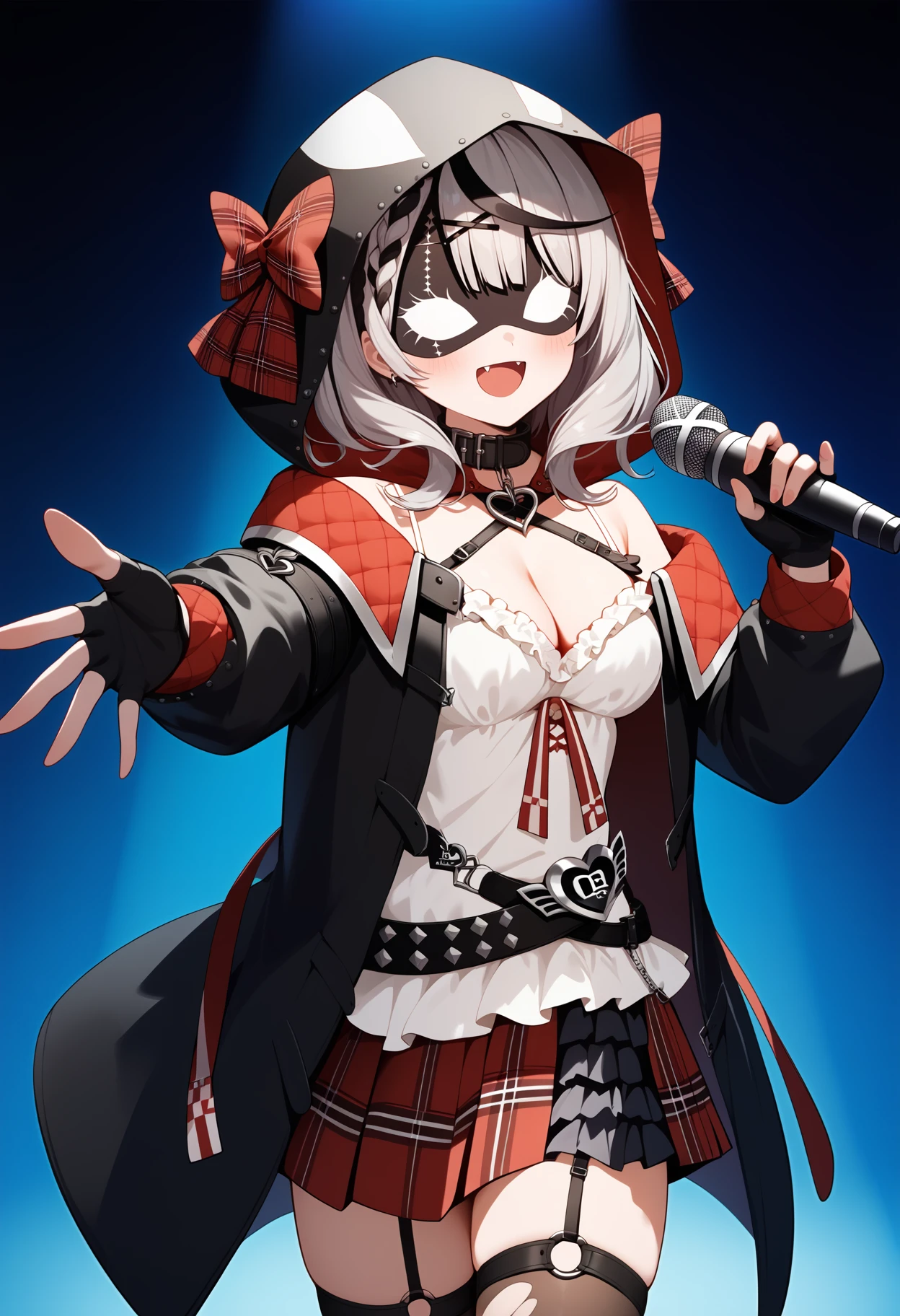 outfit1-3 (hood up, jacket, mask)aachloe, medium hair, streaked hair, grey hair, hood up, red bow, x hair ornament, braided bangs, eye mask, breasts, black collar, harness, cleavage, belt bra, white camisole, black jacket, off shoulder, long sleeves, fingerless gloves, black gloves, black belt, plaid skirt, red skirt, garter straps, torn thighhighs, black thighhighs