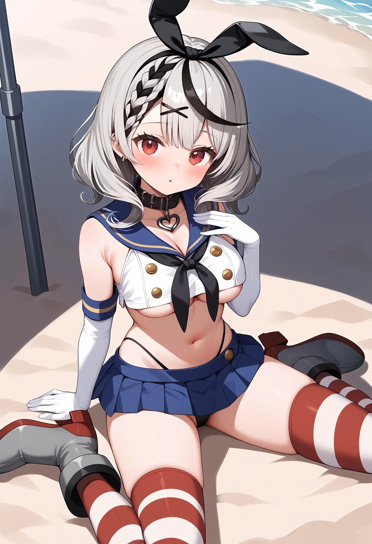 outfit7aachloe, medium hair, streaked hair, grey hair, black hairband, hair ribbon, x hair ornament, braided bangs, red eyes, breasts, cosplay, black collar, blue sailor collar, black neckerchief, cleavage, white shirt, underboob, sleeveless, elbow gloves, white gloves, midriff, microskirt, blue skirt, highleg panties, striped thighhighs