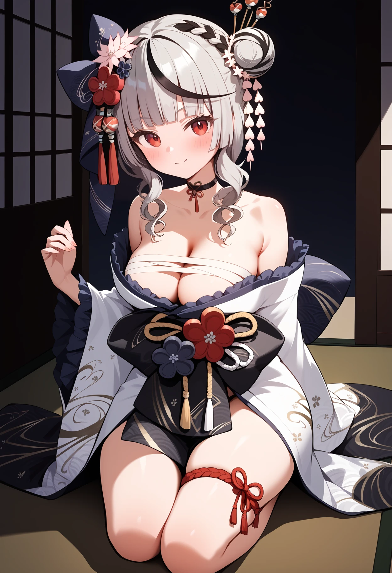 outfit2bbchloe, streaked hair, grey hair, braid, single hair bun, tassel hair ornament, hair flower, hair bow, blunt bangs, red eyes, breasts, black choker, off shoulder, cleavage, bandages, print kimono, white kimono, frilled sleeves, wide sleeves, thigh strap