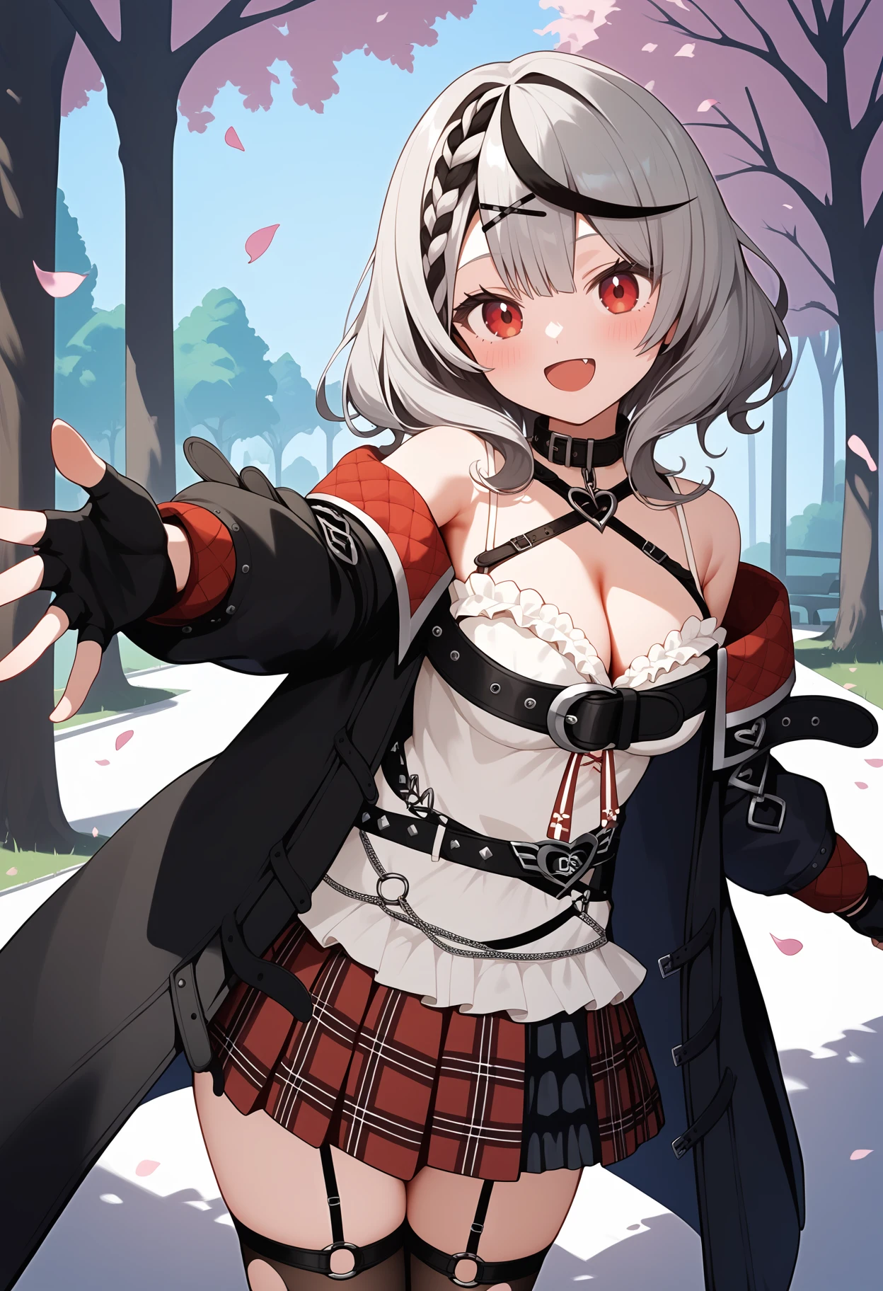 outfit1-2 (hood up, jacket)aachloe, medium hair, streaked hair, grey hair, hood up, red bow, x hair ornament, braided bangs, red eyes, breasts, black collar, harness, cleavage, belt bra, white camisole, black jacket, off shoulder, long sleeves, fingerless gloves, black gloves, black belt, plaid skirt, red skirt, garter straps, torn thighhighs, black thighhighs