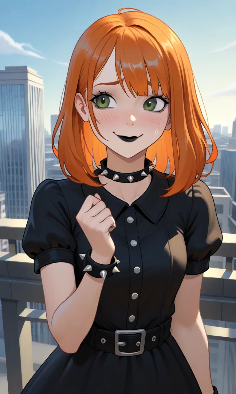 1girl,medium hair,orange hair,green eyes,goth,black lips,black choker,spiked choker,spiked bracelets,short sleeves,black dress,belt