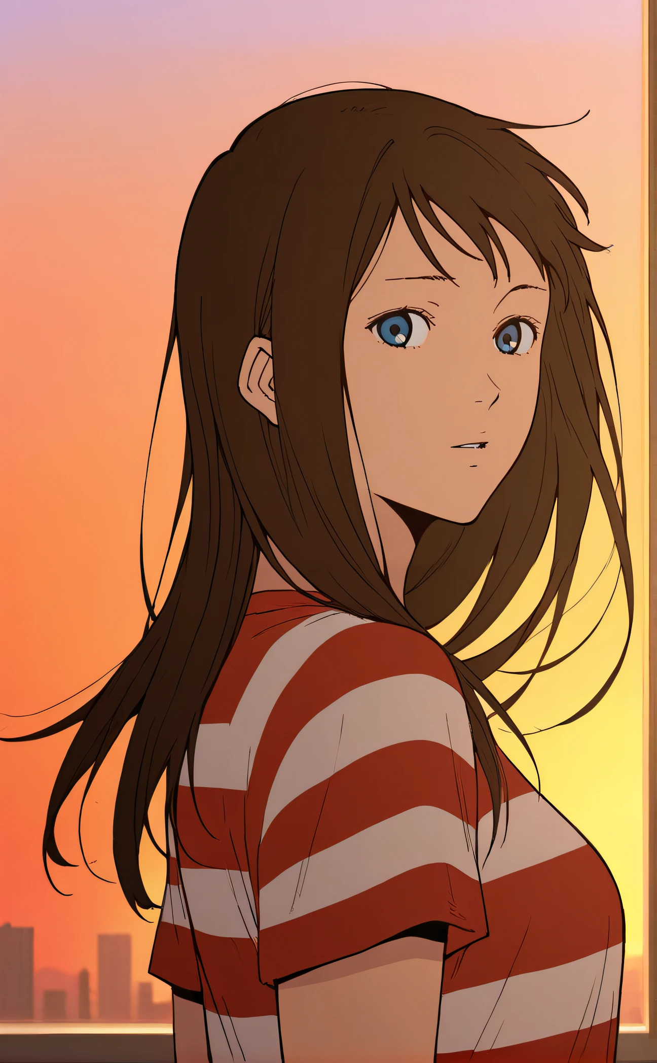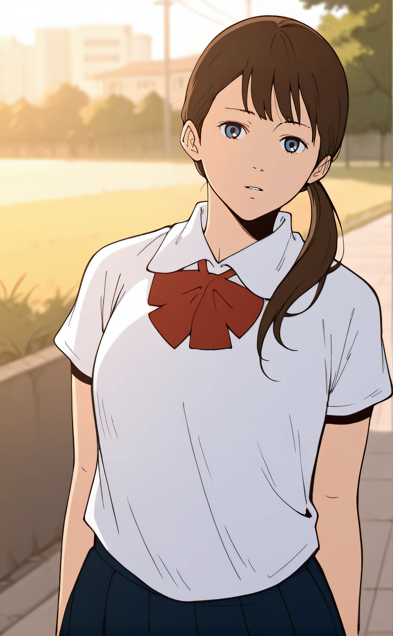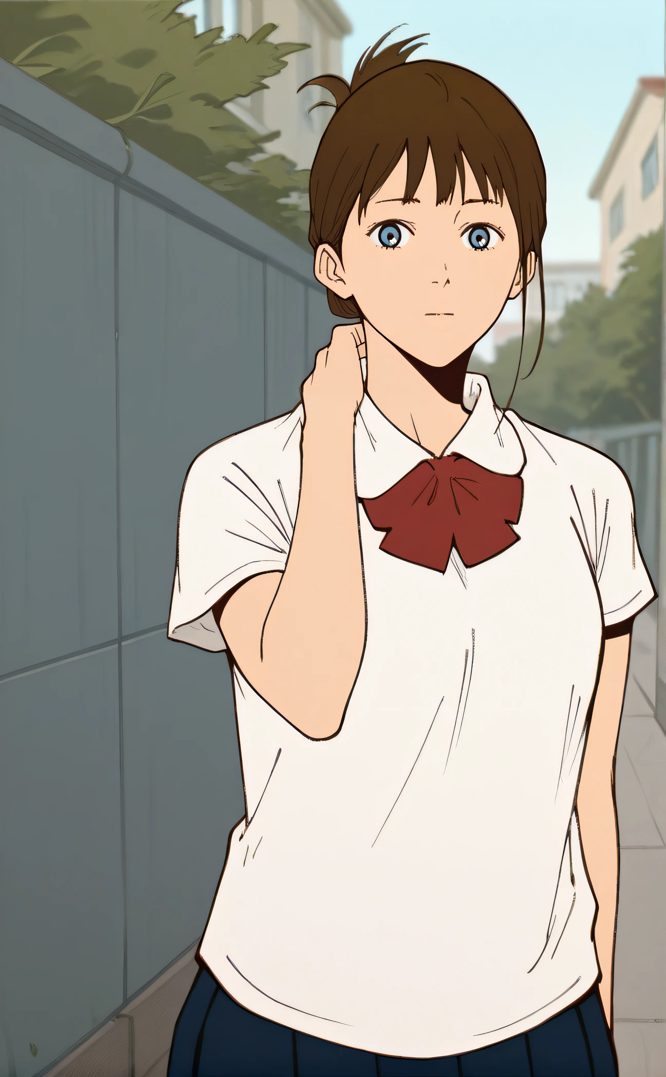 sibore, brown hair, twintails, blue eyes, school uniform, white shirt, short sleeves, red bow