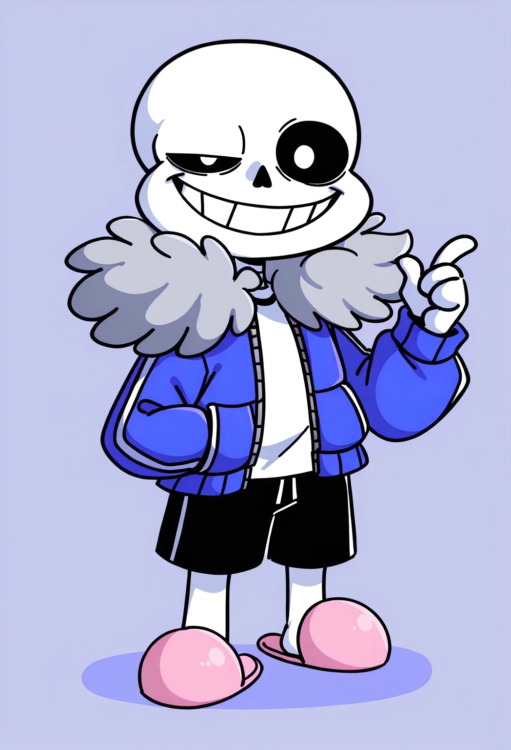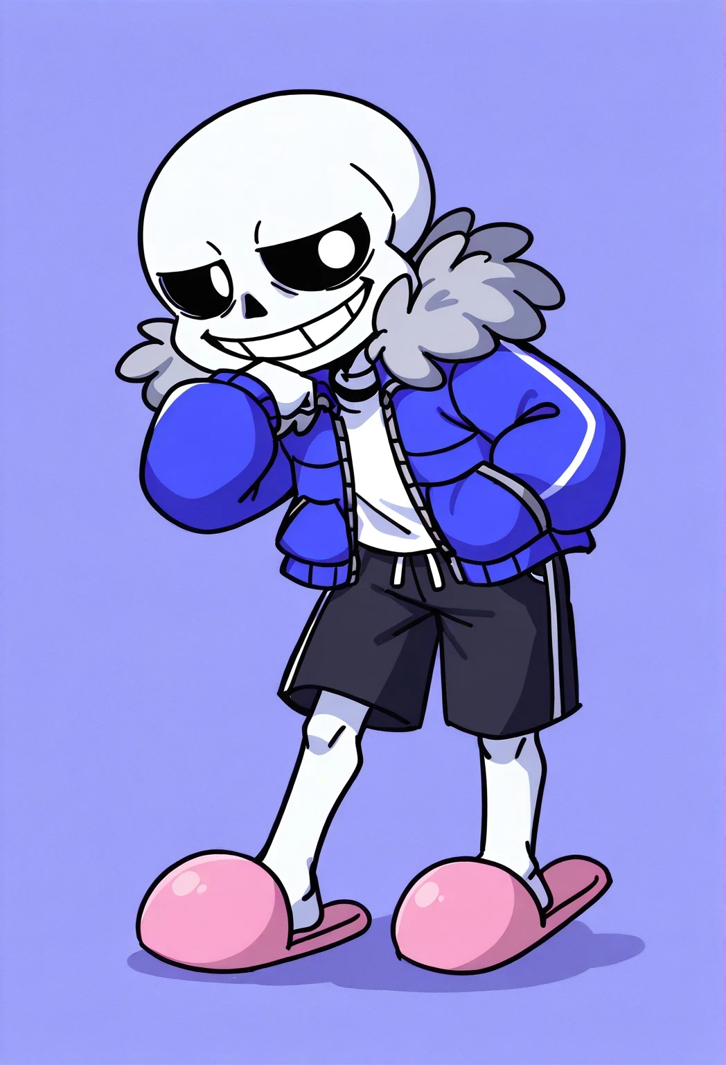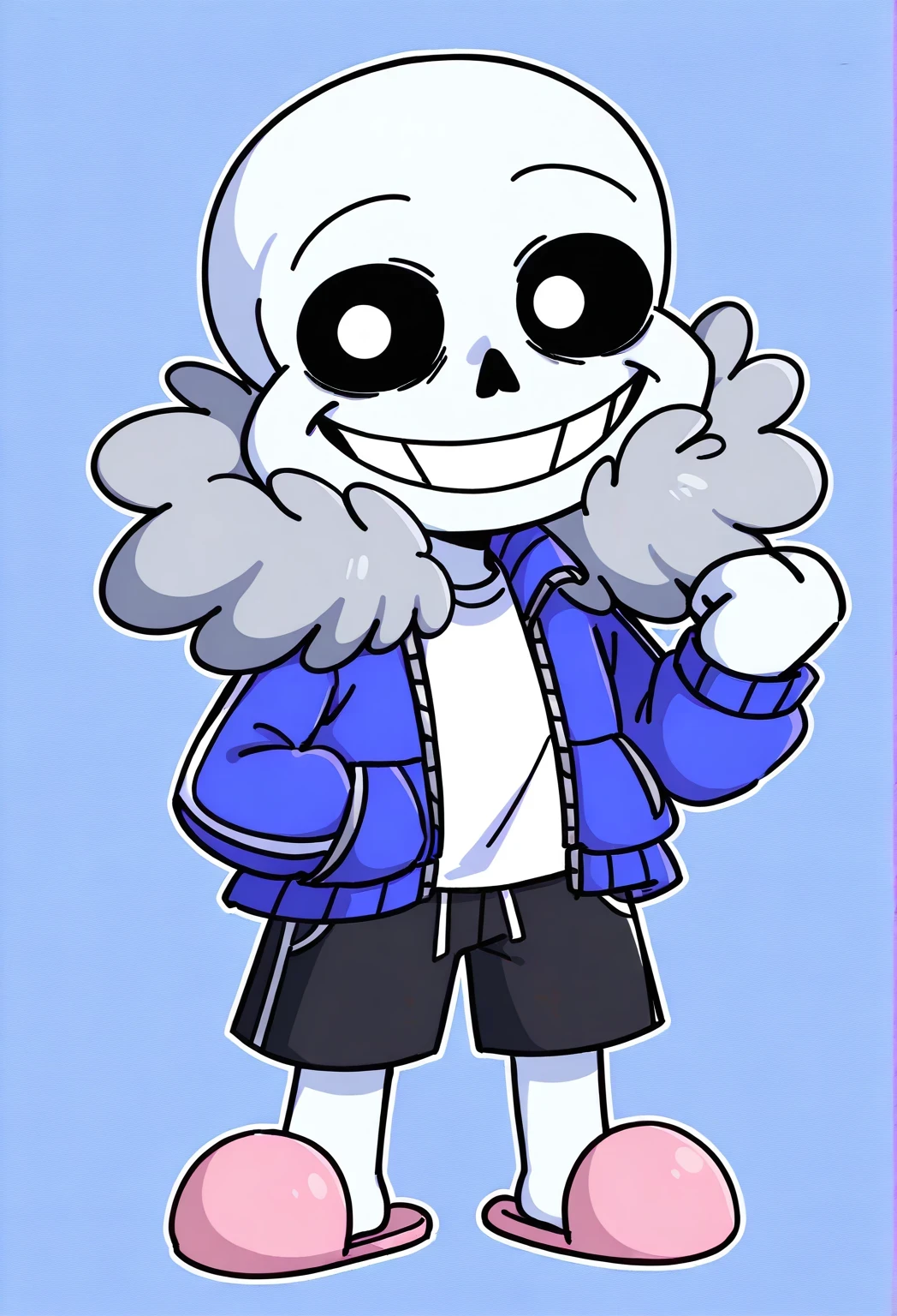 SansFNFSV, 1boy, stylized cartoon skeleton, wide grin, large white eyes, black sclera, blue jacket, white shirt, black-gray shorts, pink slippers, short, chibi, inaccurate skeleton, skeleton, white skin,