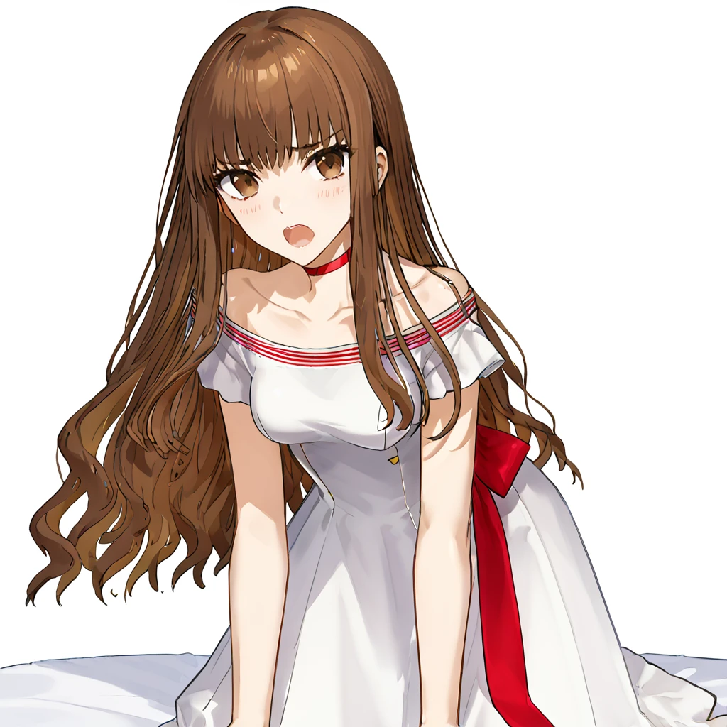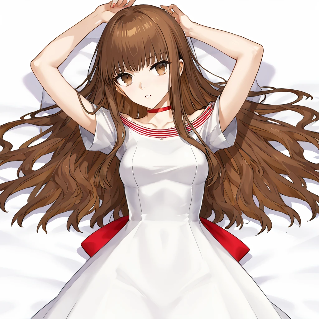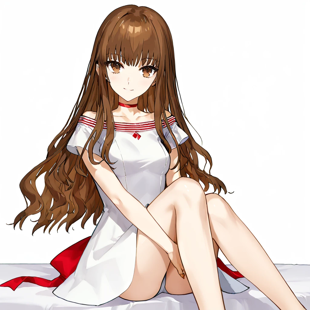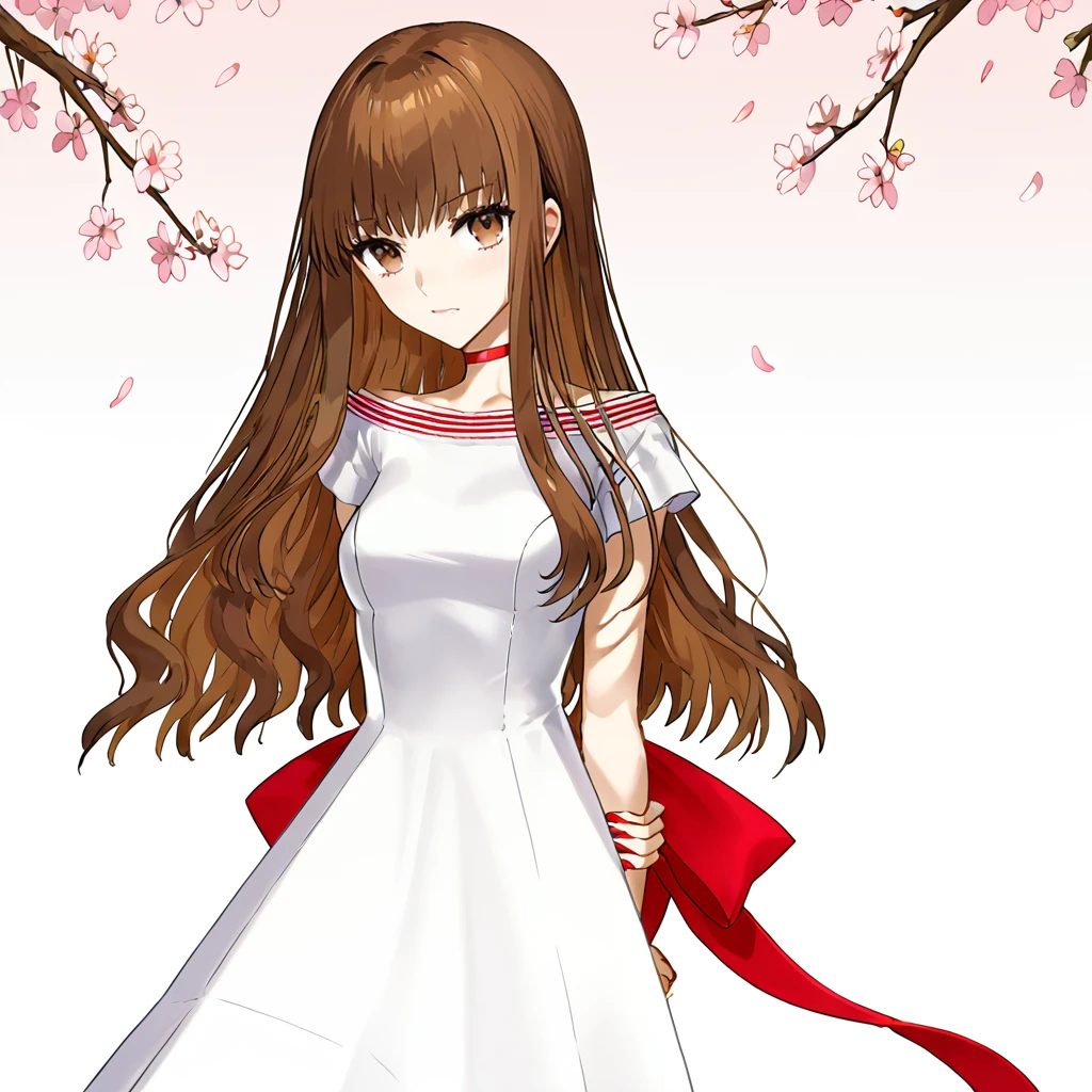 white dress, short sleeves, red choker, collarbone, off shoulder, off-shoulder dress, red bow, back bow, bare shoulders, striped collar, small breasts,
