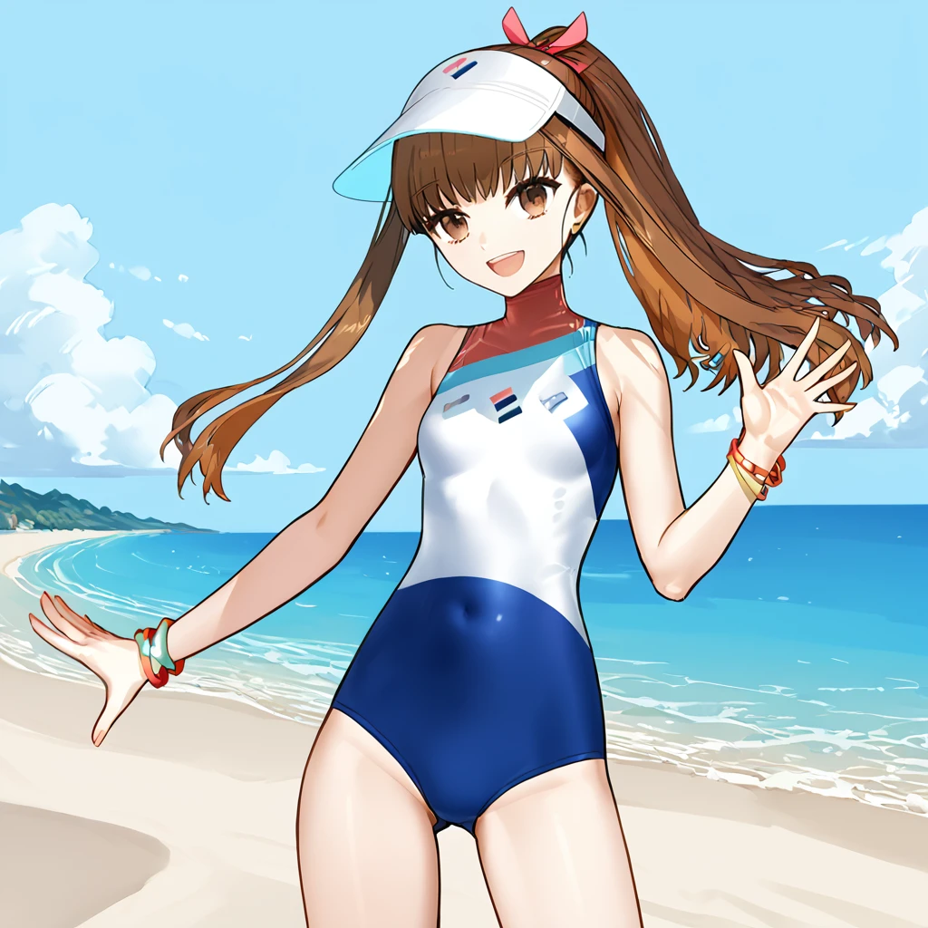 one-piece swimsuit, visor cap, ponytail, small breasts, bangs, bare shoulders, bracelet, cowboy shot, ribbon,