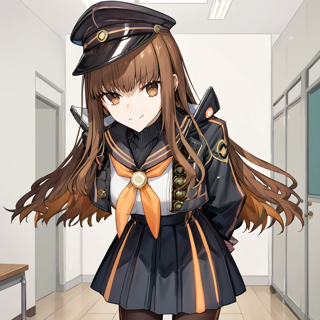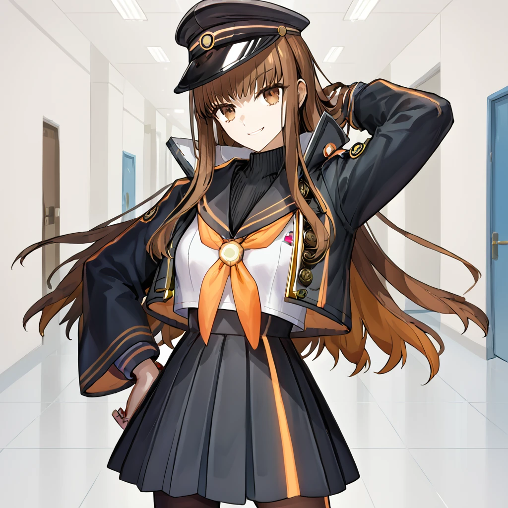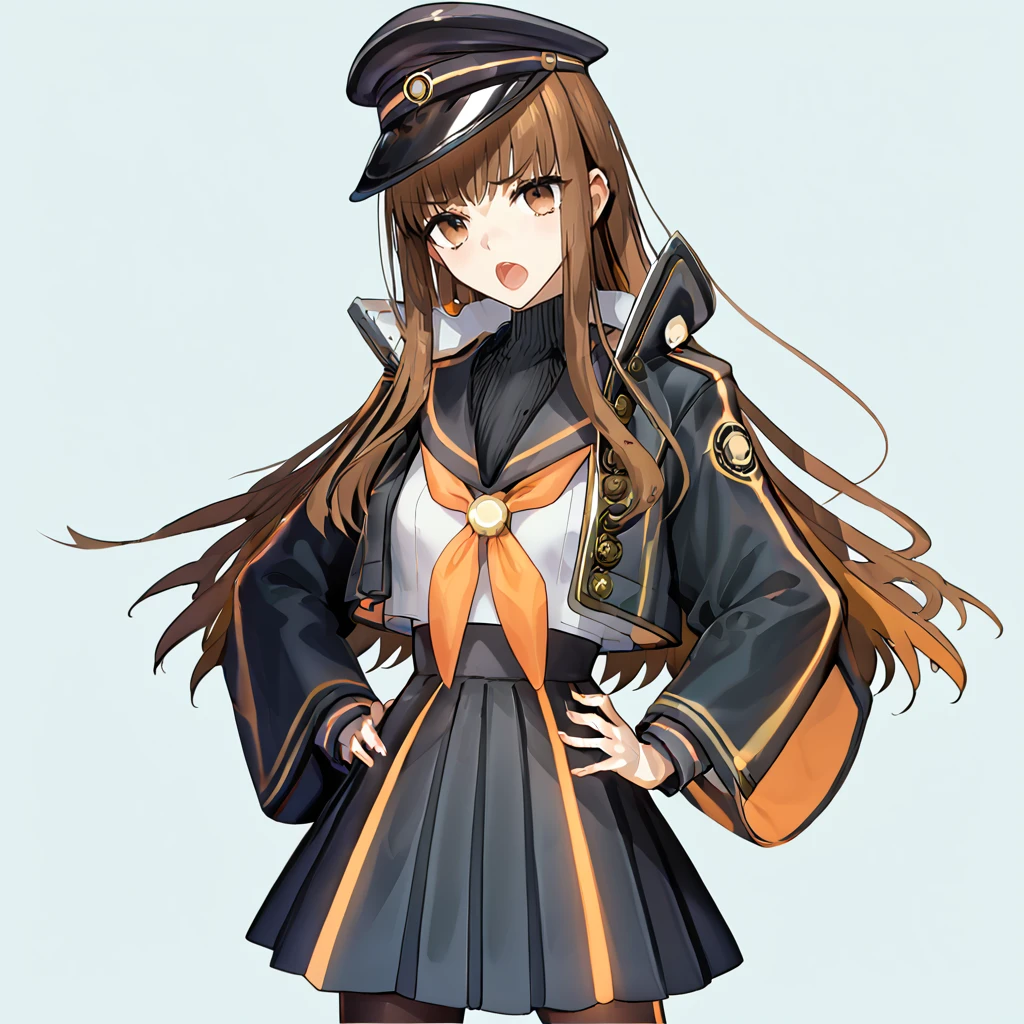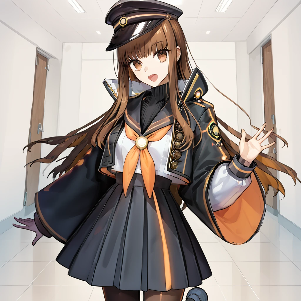 school uniform, black jacket, long sleeves, open jacket, wide sleeves, black headwear, sailor collar, orange neckerchief, peaked cap, neckerchief, black skirt, pleated skirt,  pantyhose, black sweater, jacket, skirt,