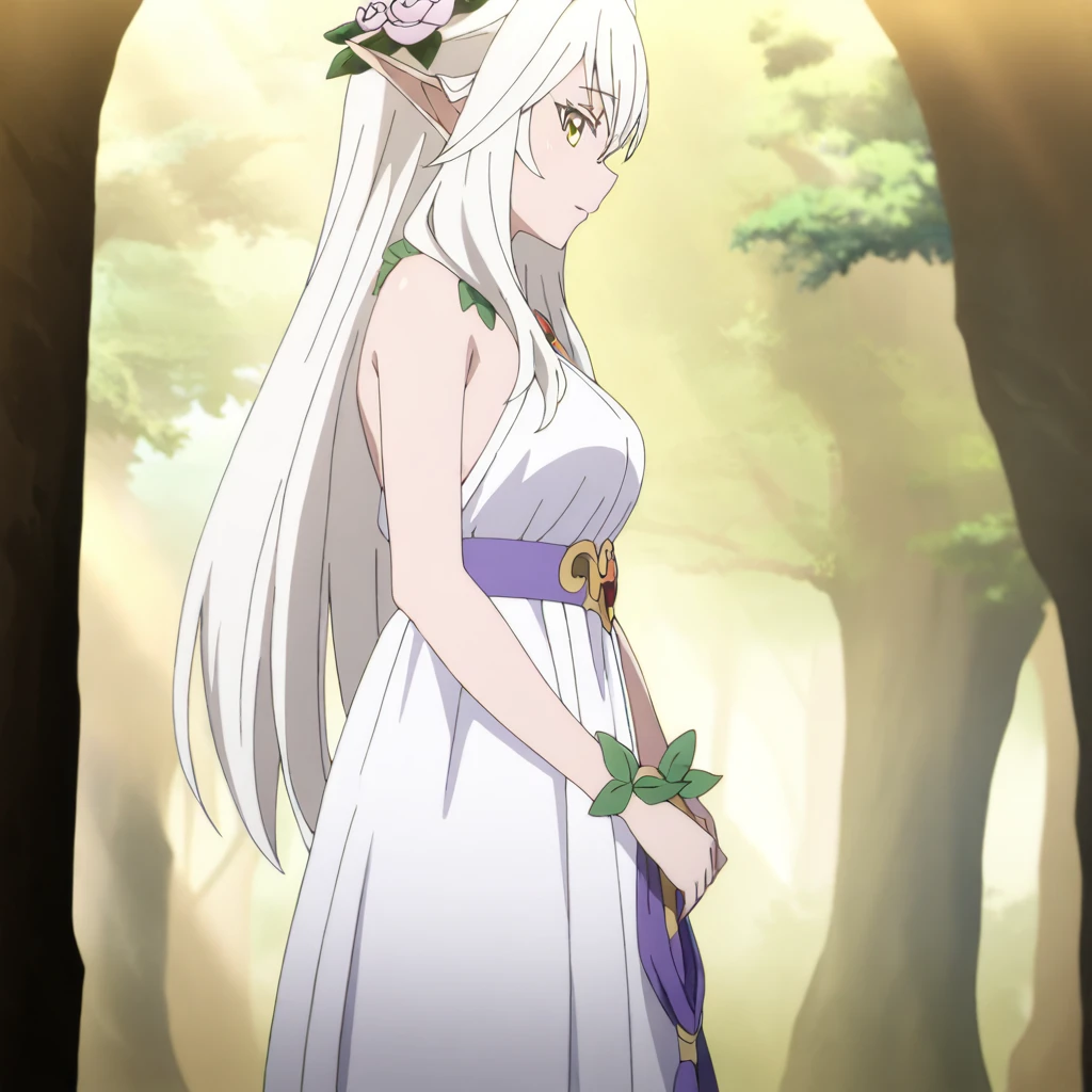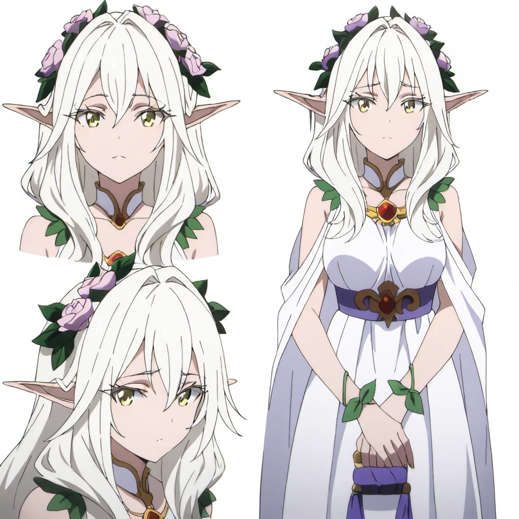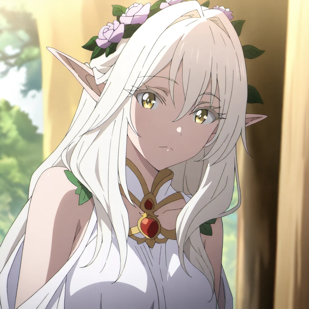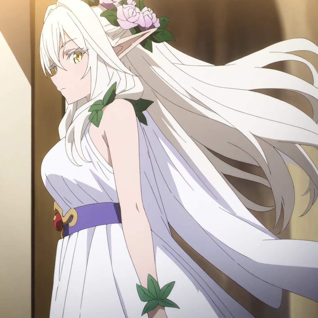 morihime, white hair, long hair, pointy ears, yellow eyes