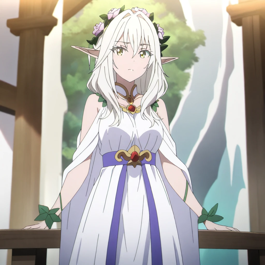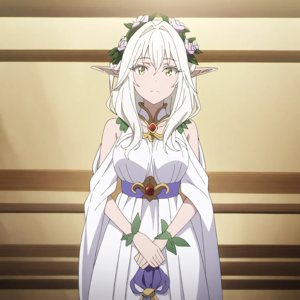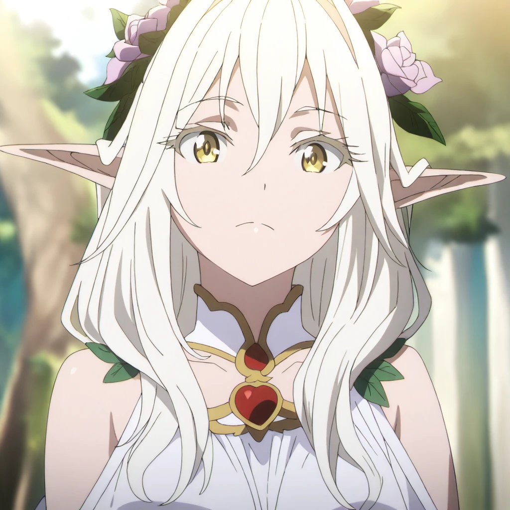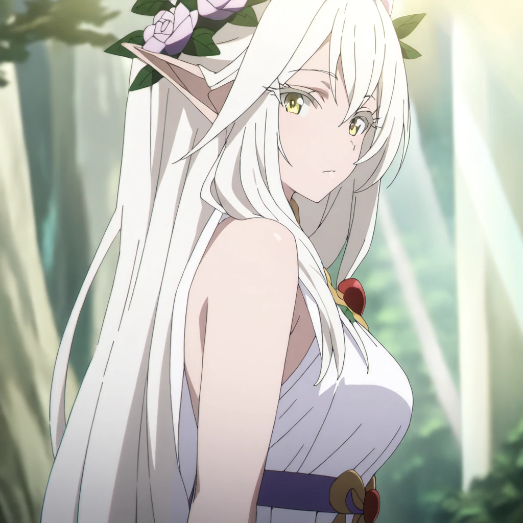 morihime, white hair, long hair, pointy ears, yellow eyes