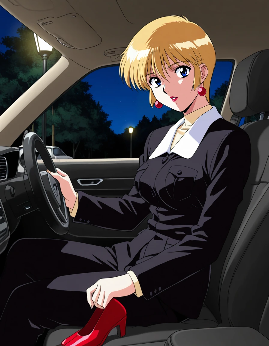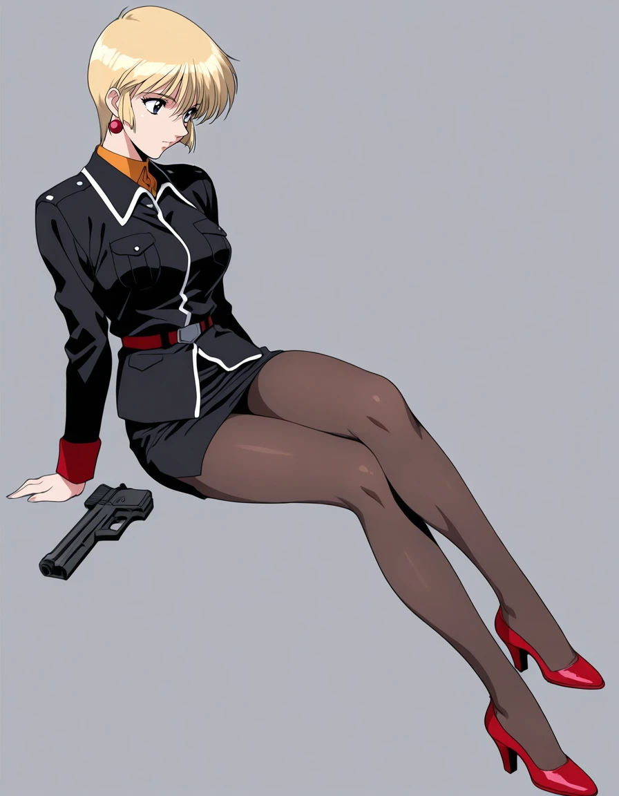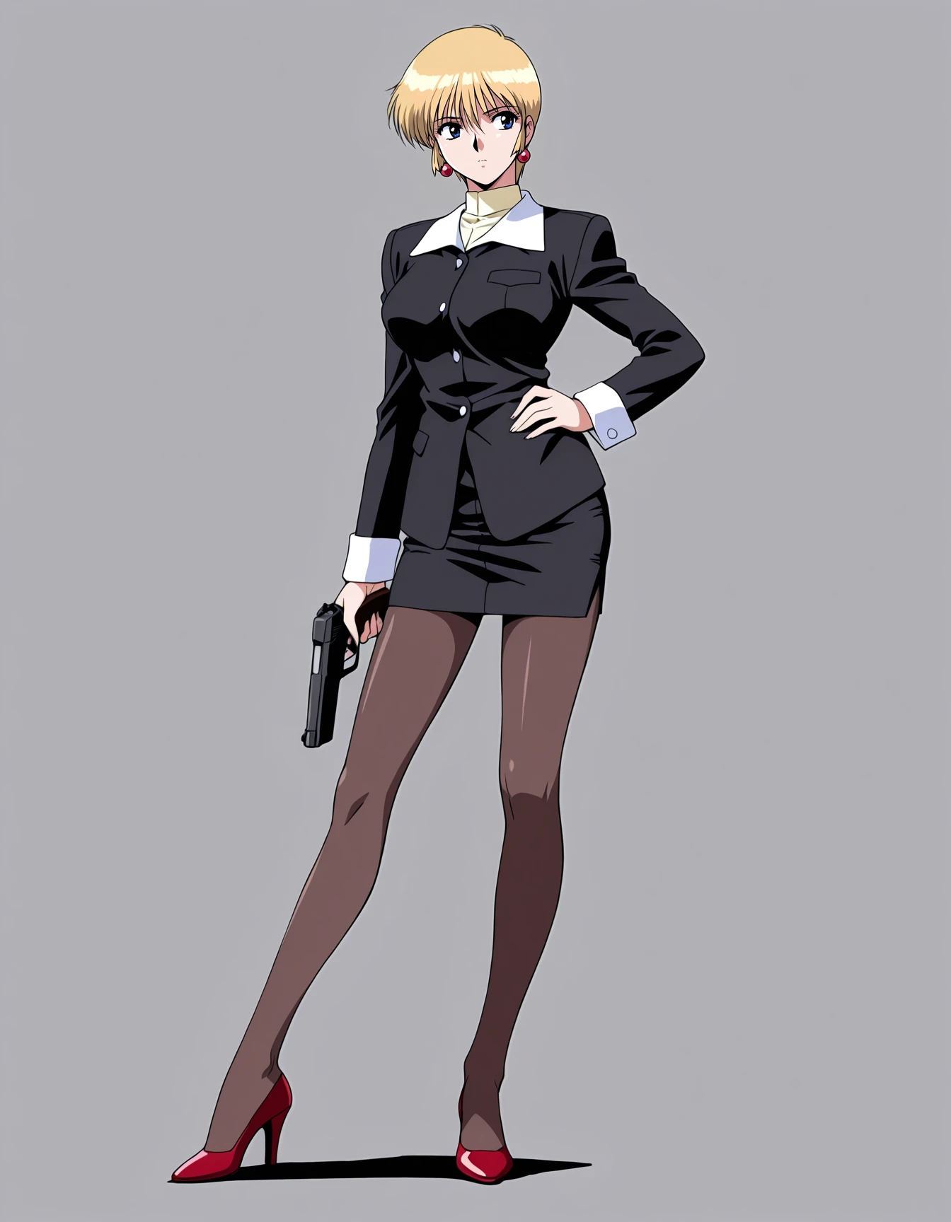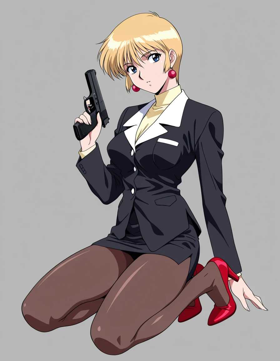 mai-heartwork-gg,retro_artstyle,1990s_(style),anime coloring,short_hair,blonde_hair,earrings,black_suit,pencil_skirt,pantyhose,red high heels,handgunRecommend preferred Strength: 0.7~1.
