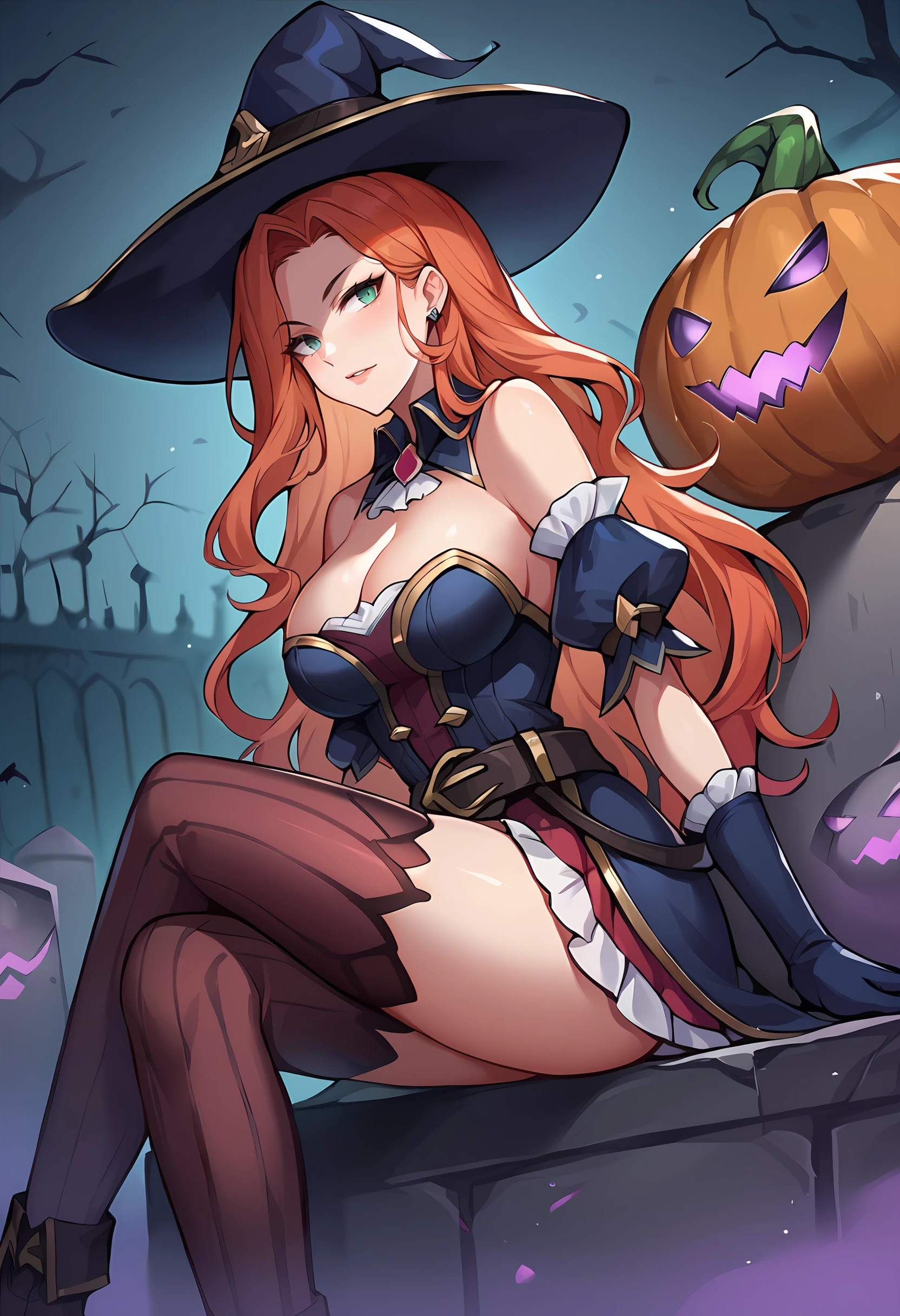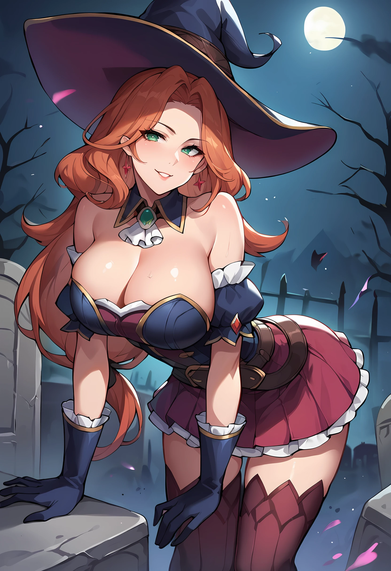 bewitchedmfxl, long hair, large breasts, hat, gloves, thighhighs, bare shoulders, belt, detached sleeves, skirt