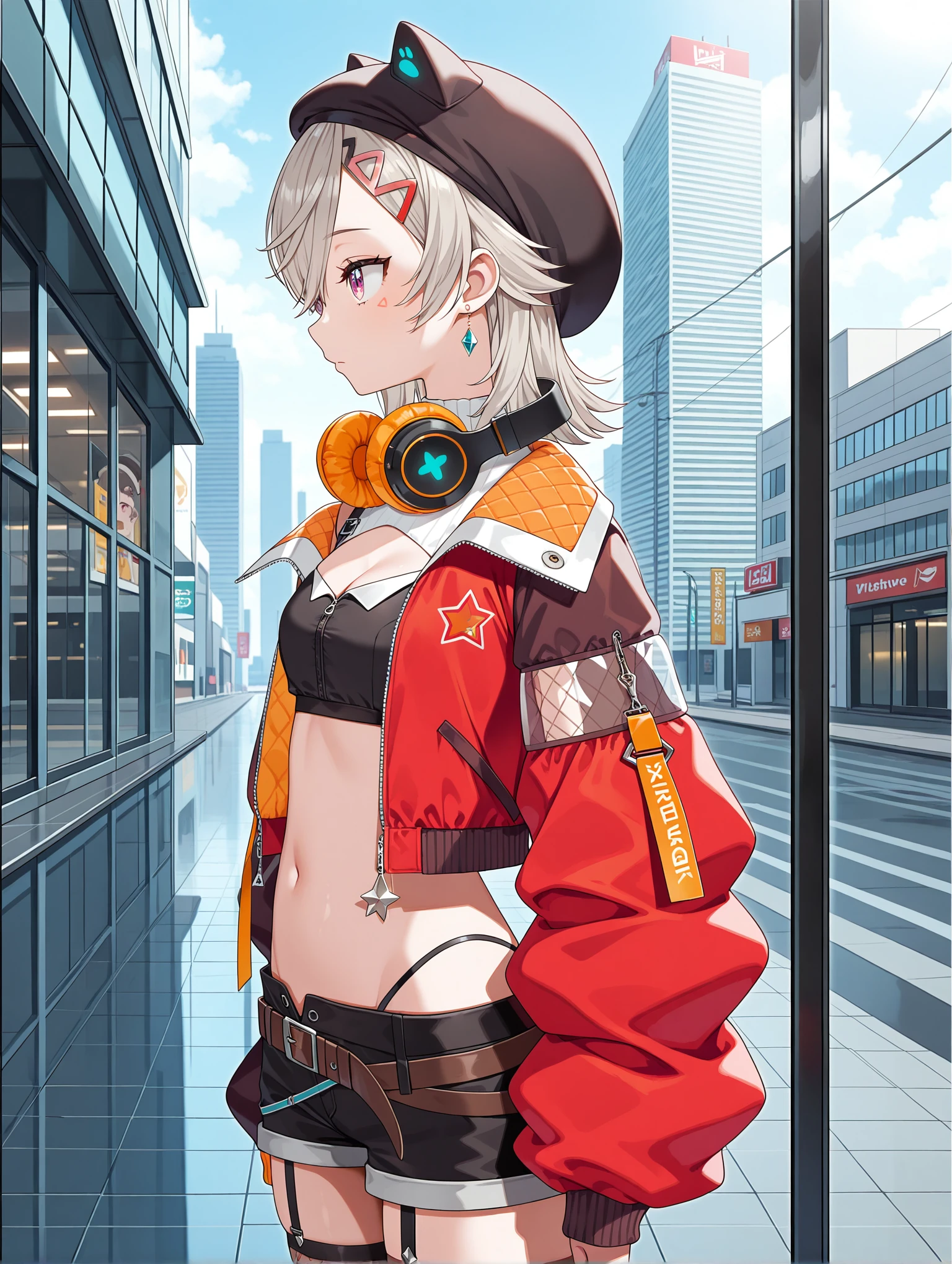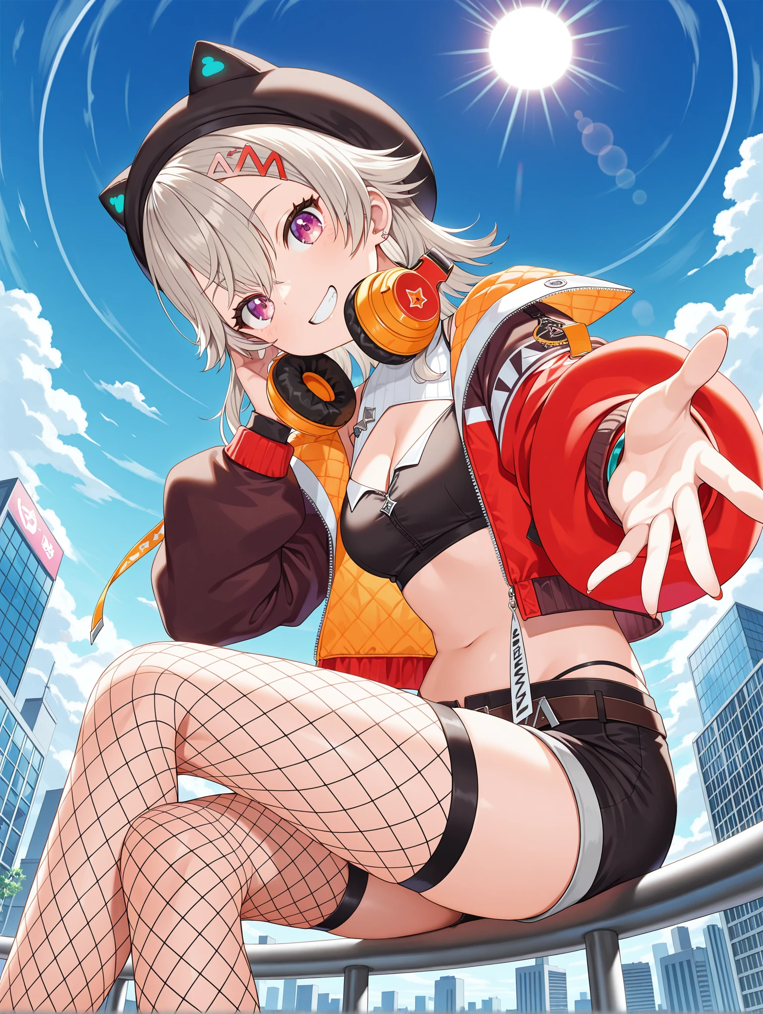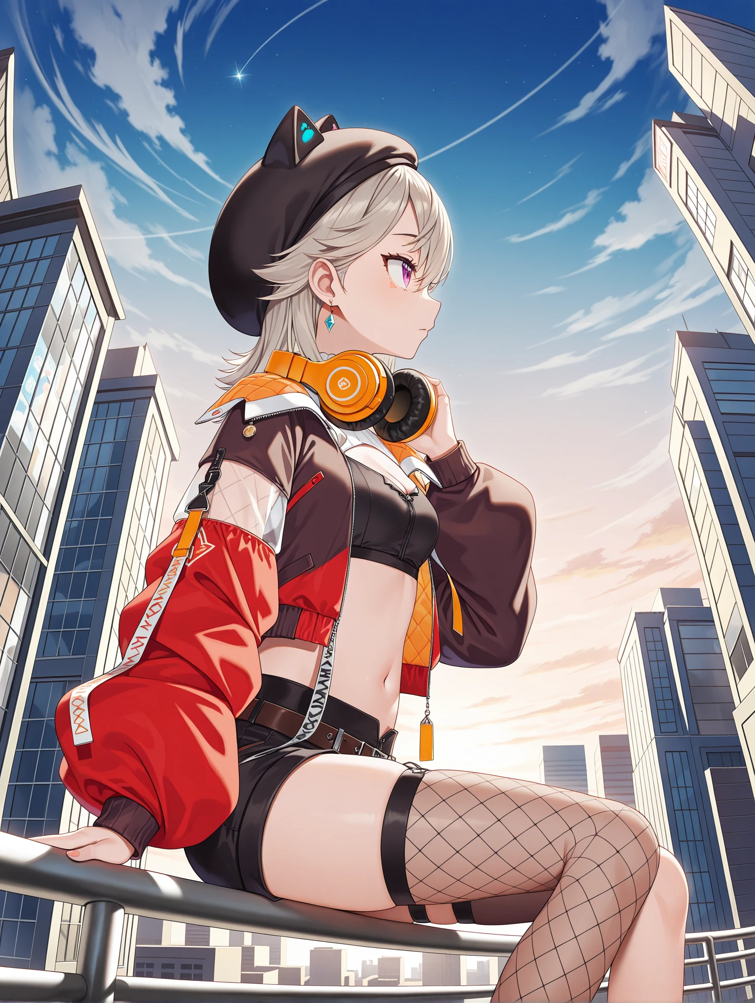 m_i_clothes,white turtleneck,cleavage cutout,black crop top,single glove,partially fingerless gloves,fishnet thighhighs,single thighhigh,