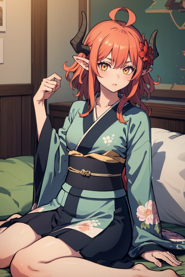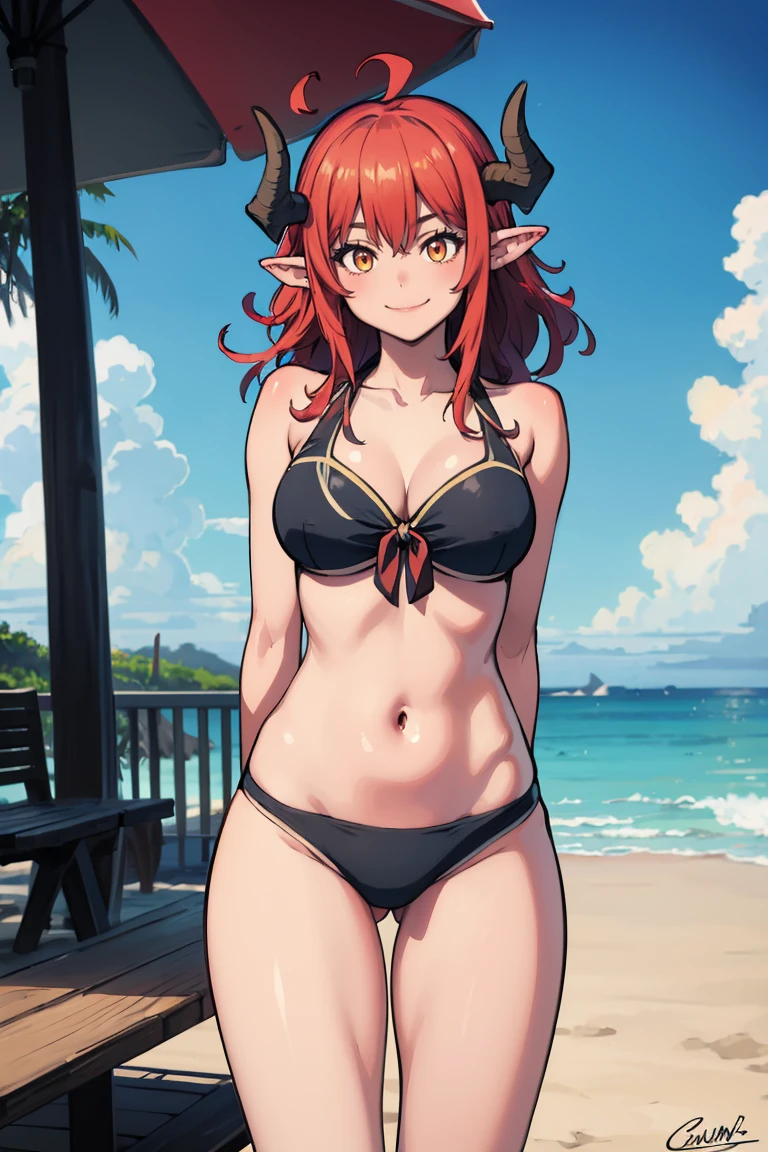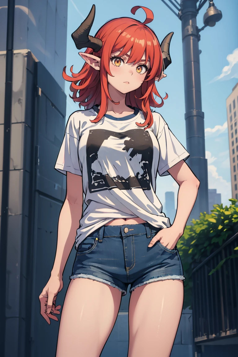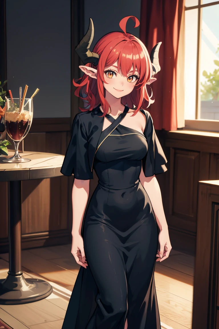 Curran, horns, medium hair, red jacket, cropped jacket, black leotard, red gloves, black belt, brown pants, thigh bootsLet me know if you have any issues.
