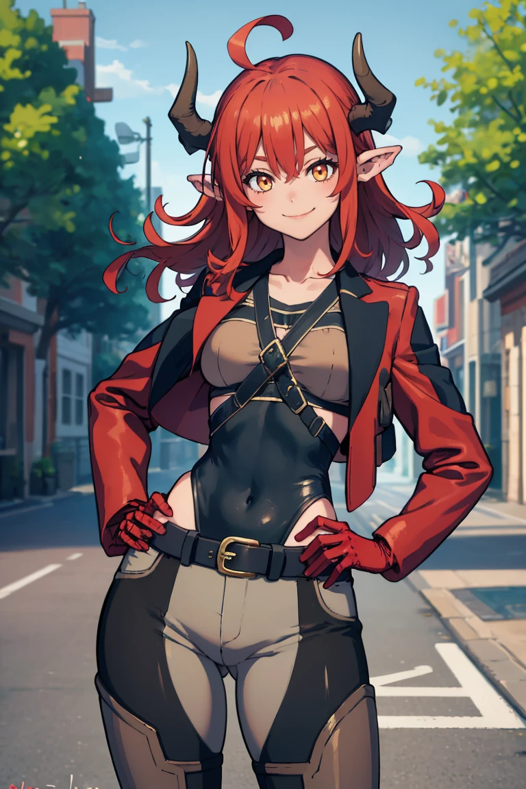 Curran, horns, medium hair, red jacket, cropped jacket, black leotard, red gloves, black belt, brown pants, thigh boots