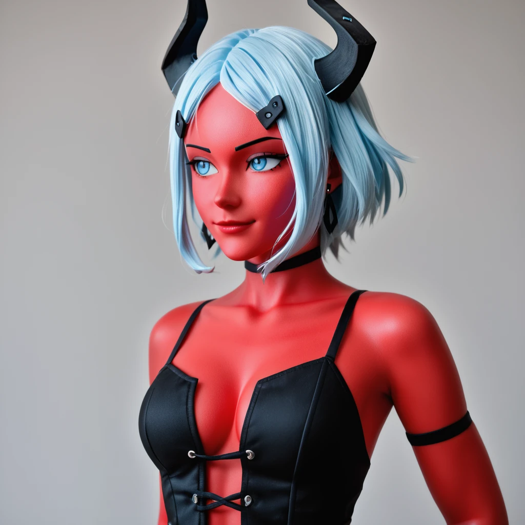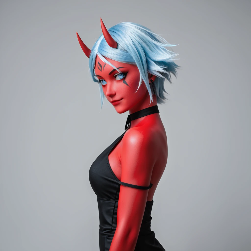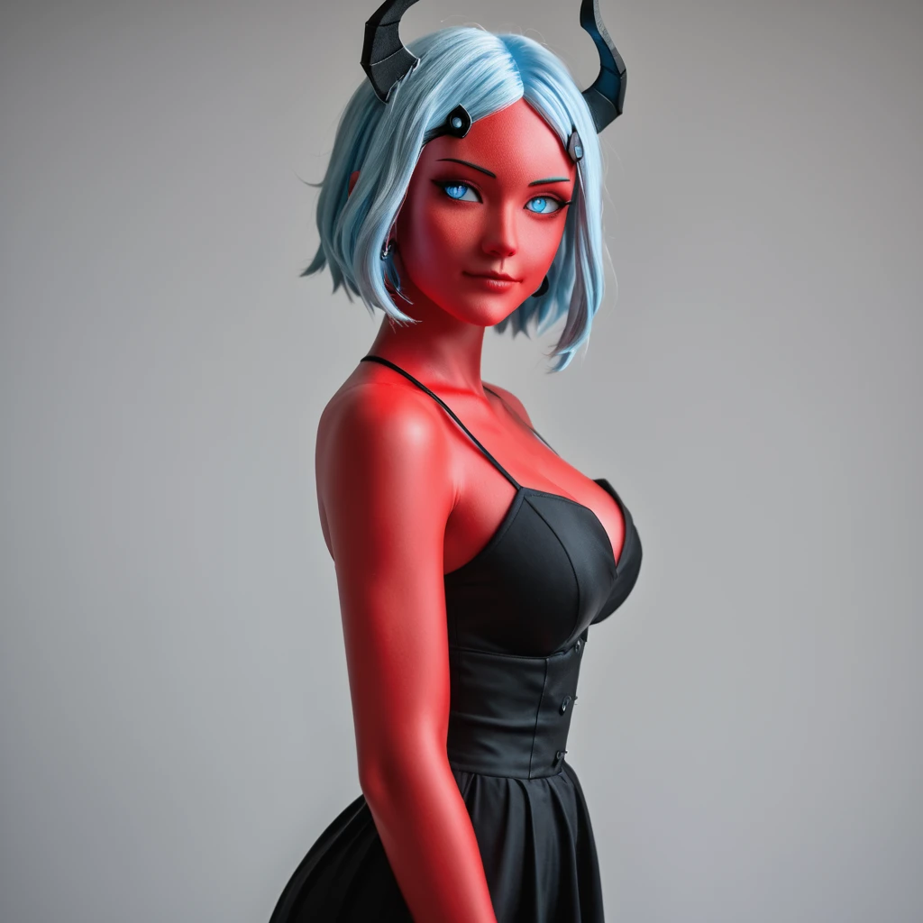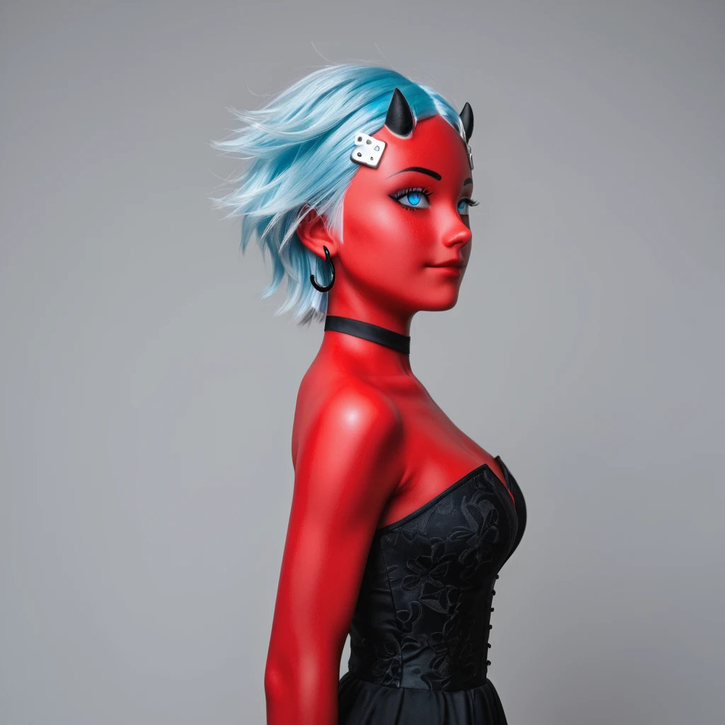 black gown,strapless gown, skin tight gown, icy blue hair, spikey hair,sharp bangs, vibrant blue eyes, medium length hair, sharp bangs, black nail paint, painted nails, red skin, colored skin, skin-covered oni horns, black devil tail