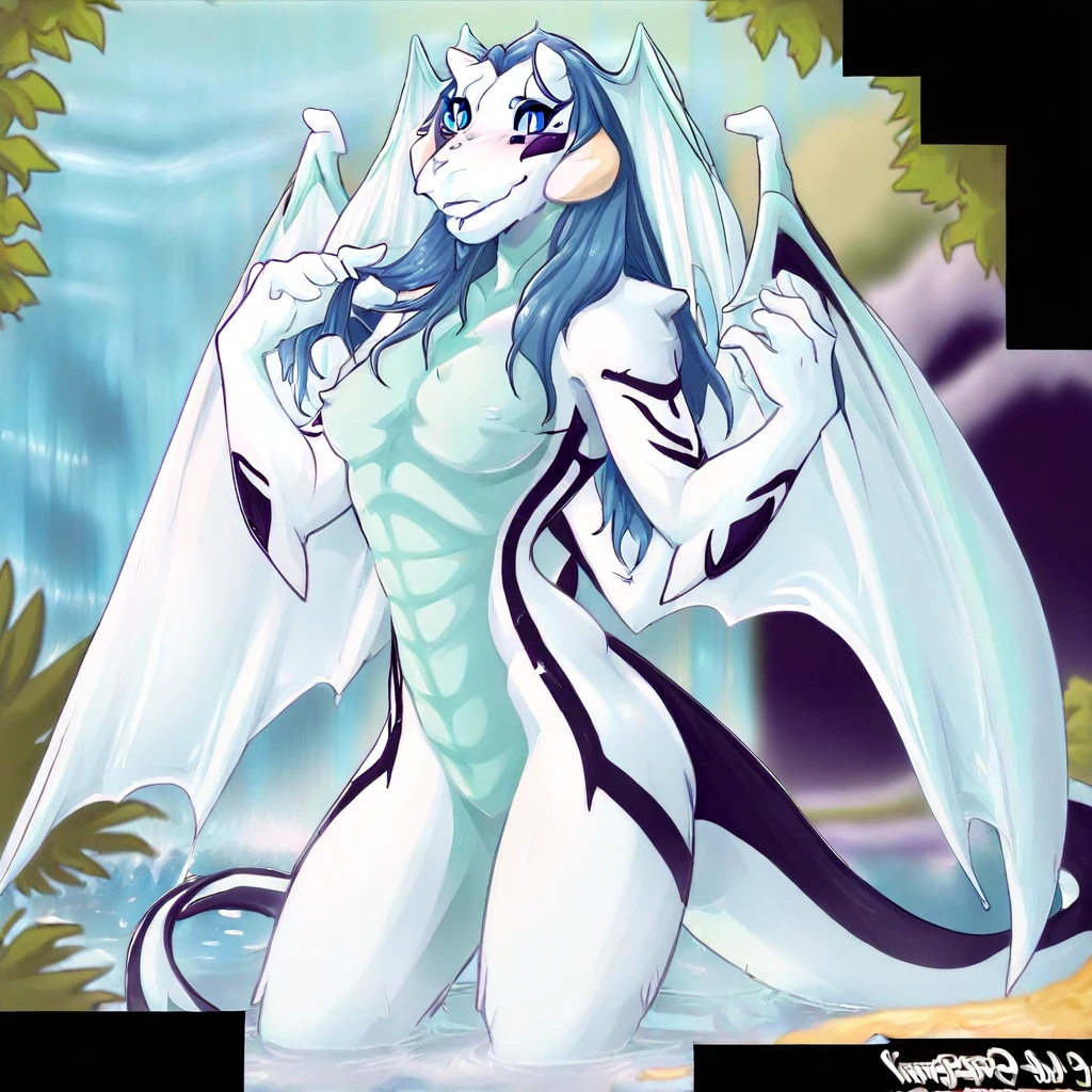 Ivryss, Anthro, Anthro Dragon, Dragon Girl, Scalie, Scalie Female, Blue Hair, Long Hair, Head Wings, Small Horns, Snout, Yellow Side Horns, Blue Eyes, White Body, Two-tone Body, Black Markings, Dragon Wings, Membranous Wings, Dragon Tail