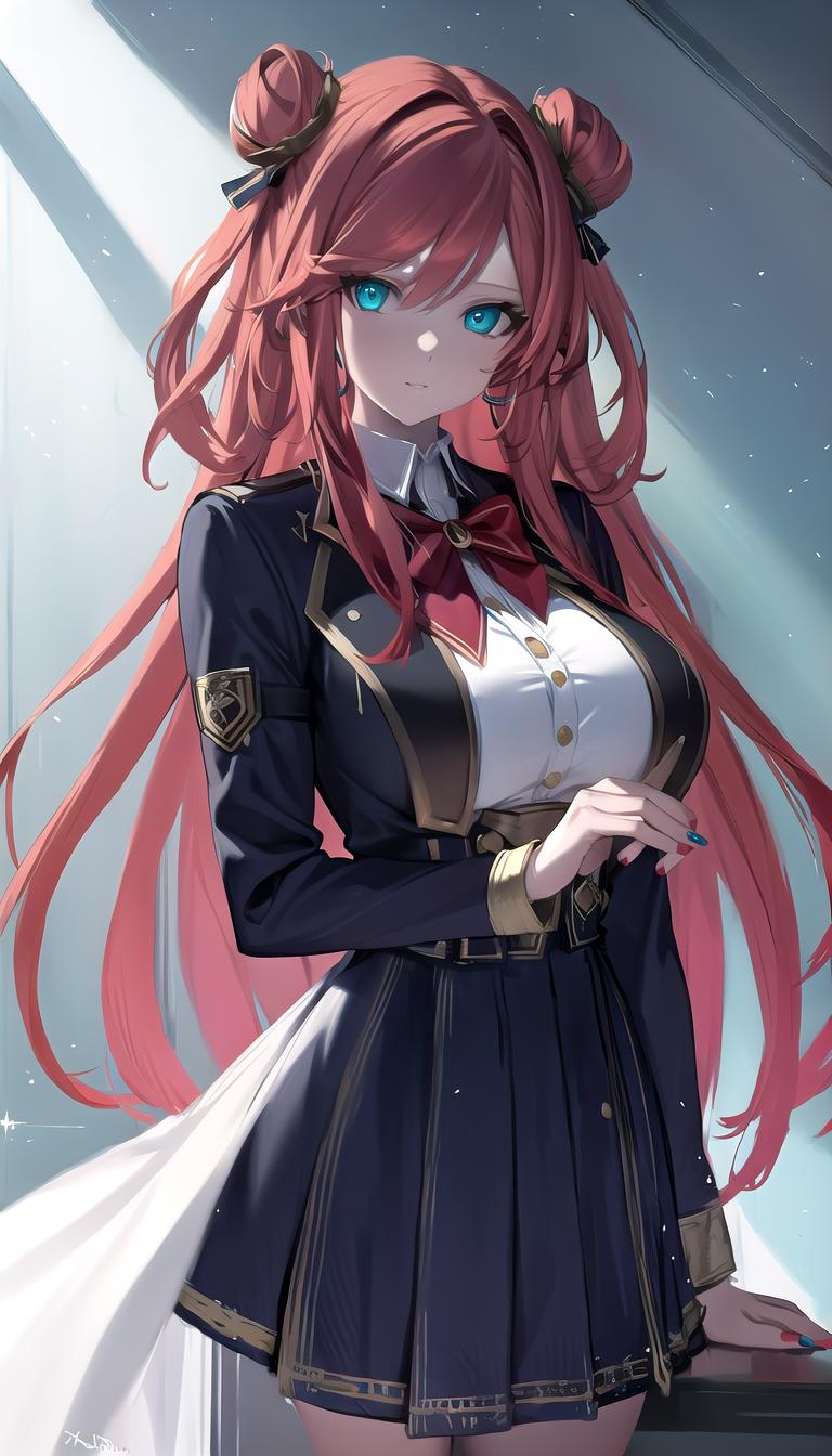 hair rings,red hair,double bun,aqua eyes,very long hair,1girl,