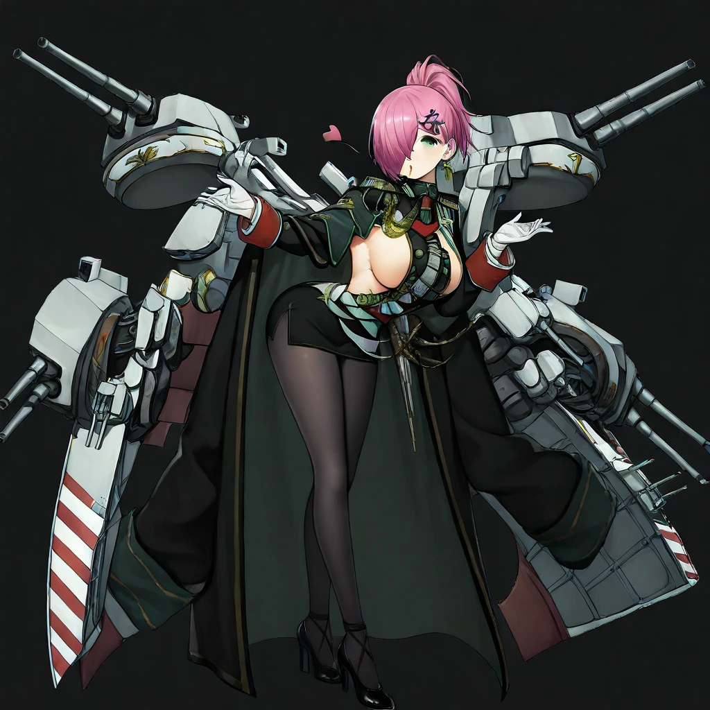 trieste \(azur lane\), magenta hair, long hair, hair over one eye, folded ponytail, hairclip, green eyes, military uniform, skirt, cape, pantyhose, heels, sideboob, large breasts, 1girl, solo