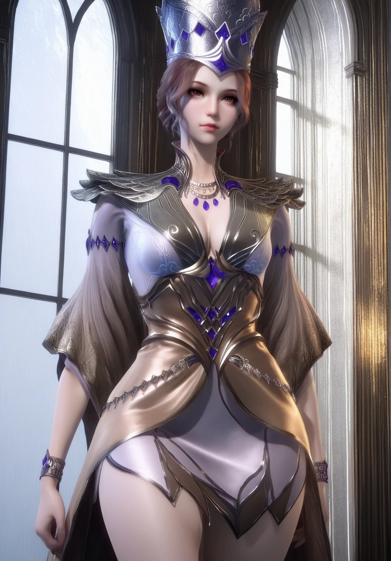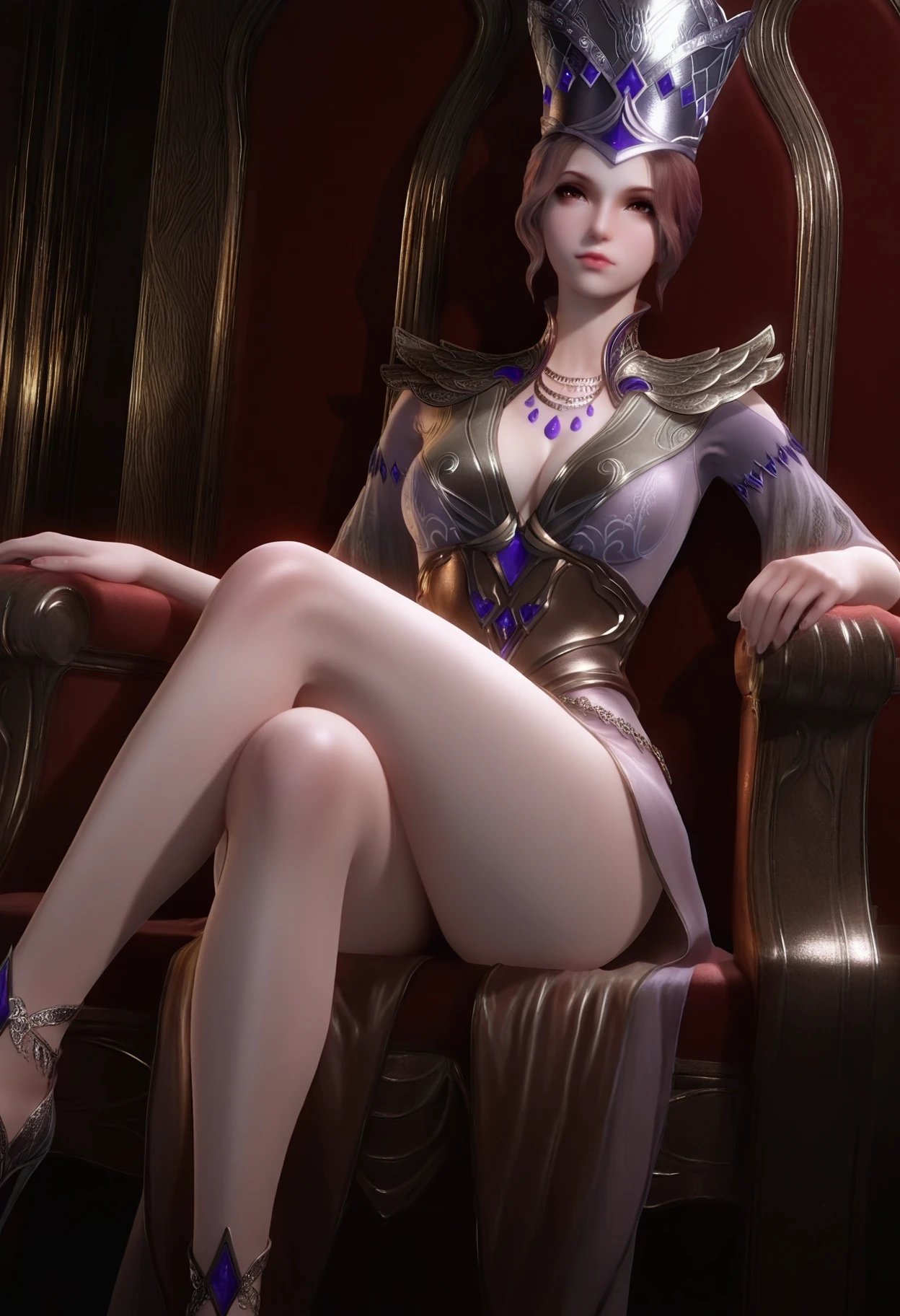 bibidong, solo, 1girl, simple background, jewelry, gem, hat, breasts, dress, lips, crown, brown hair, medium breasts, necklace, long hair, brown eyes, realistic