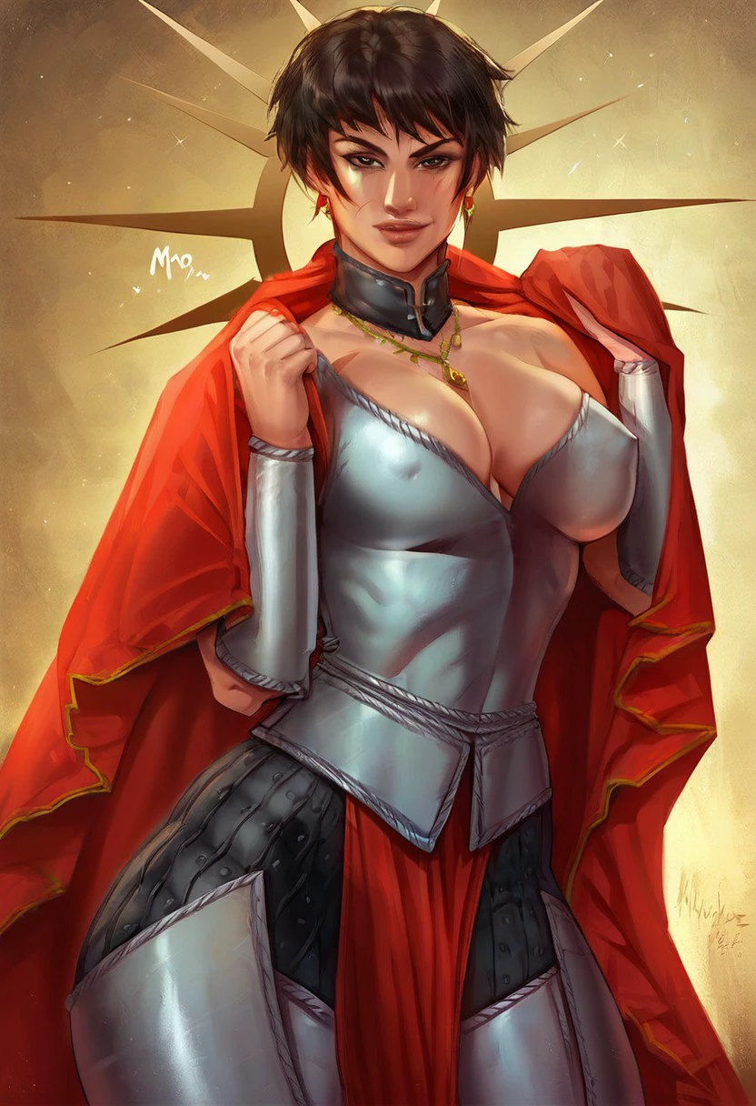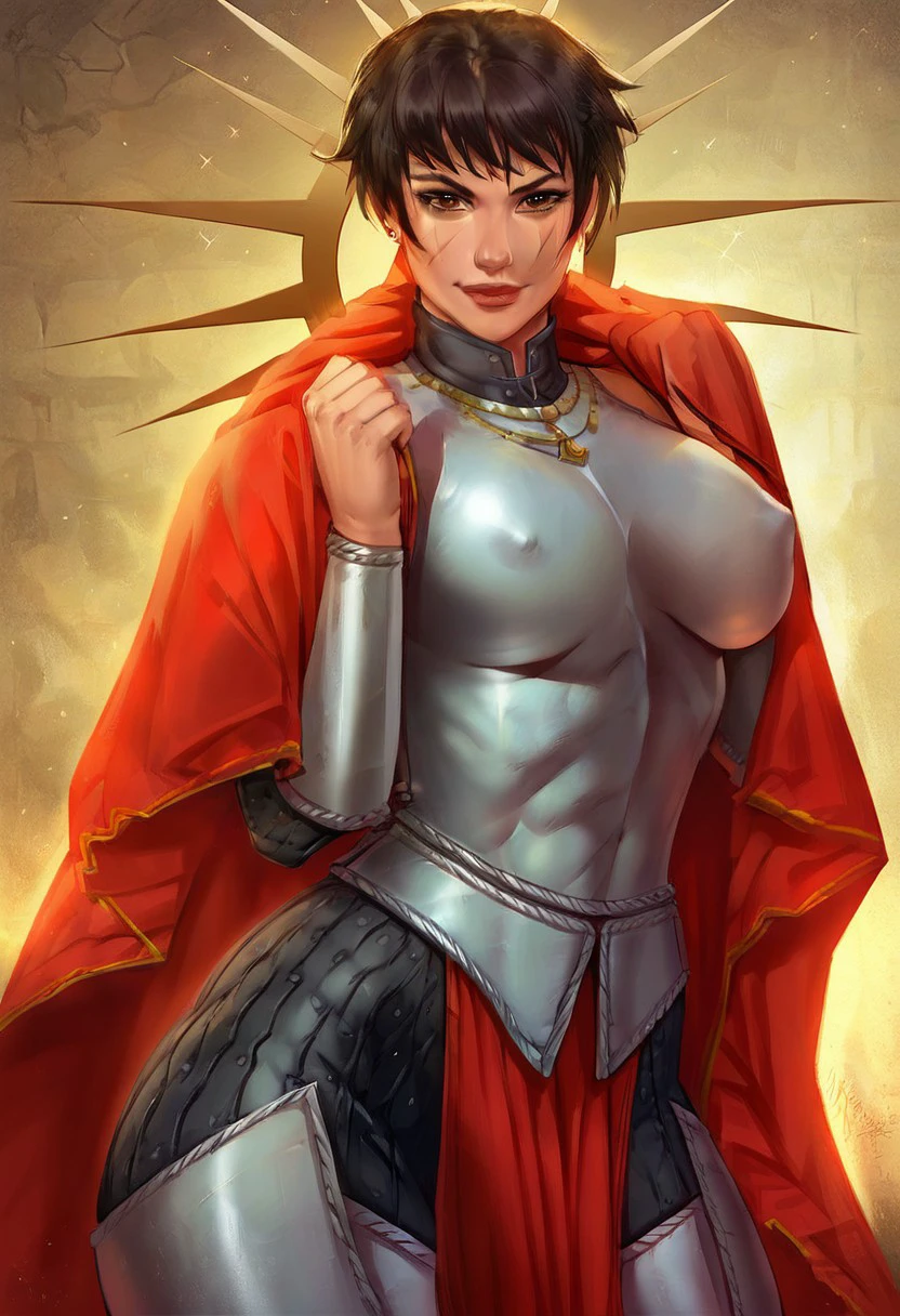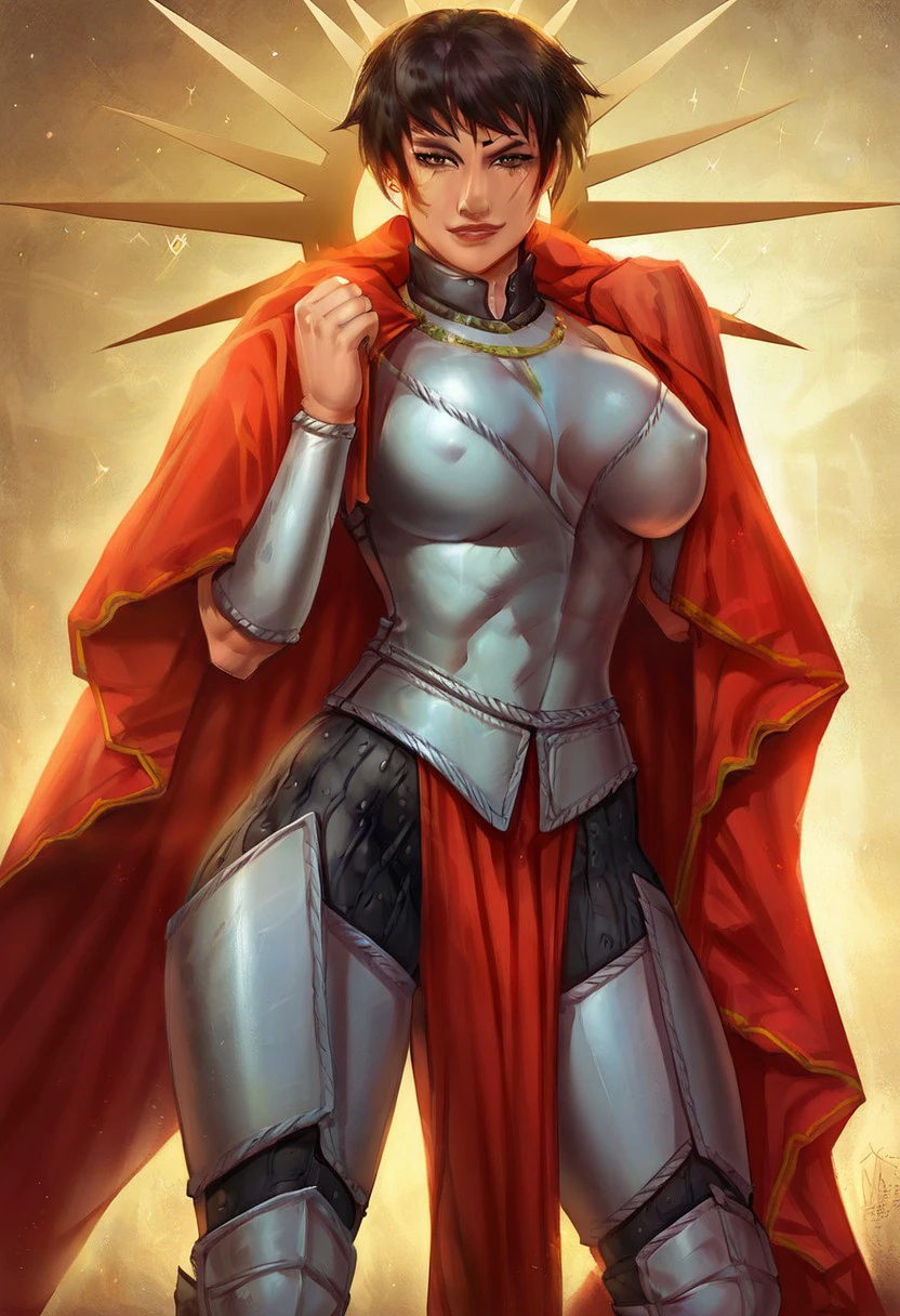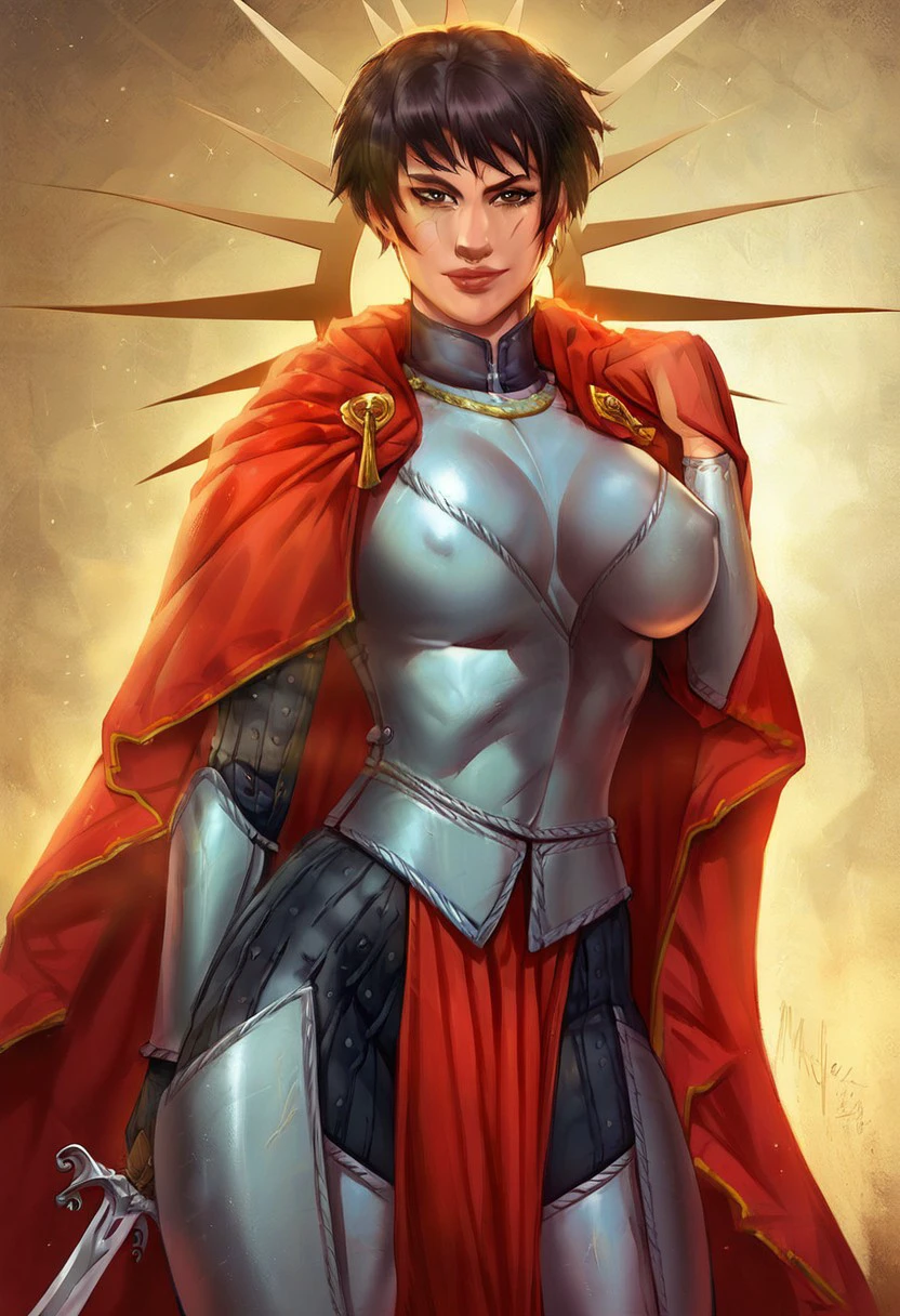 IomedaePathfinder, 1girl, solo, black hair, short hair, large breast, armor, full armor, silver armor, knight armor, shoulder armor, breastplate, pauldrons, gloves, vambraces, greaves, boots, high heels, pelvic curtain, sword, lips, armor ornament, cape, shield, brown eyes, scars, red cape, jewelry, earrings,