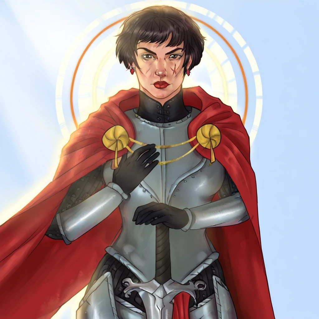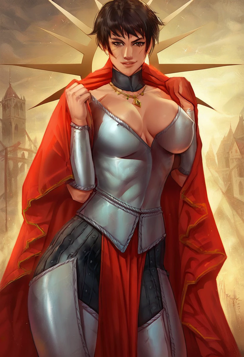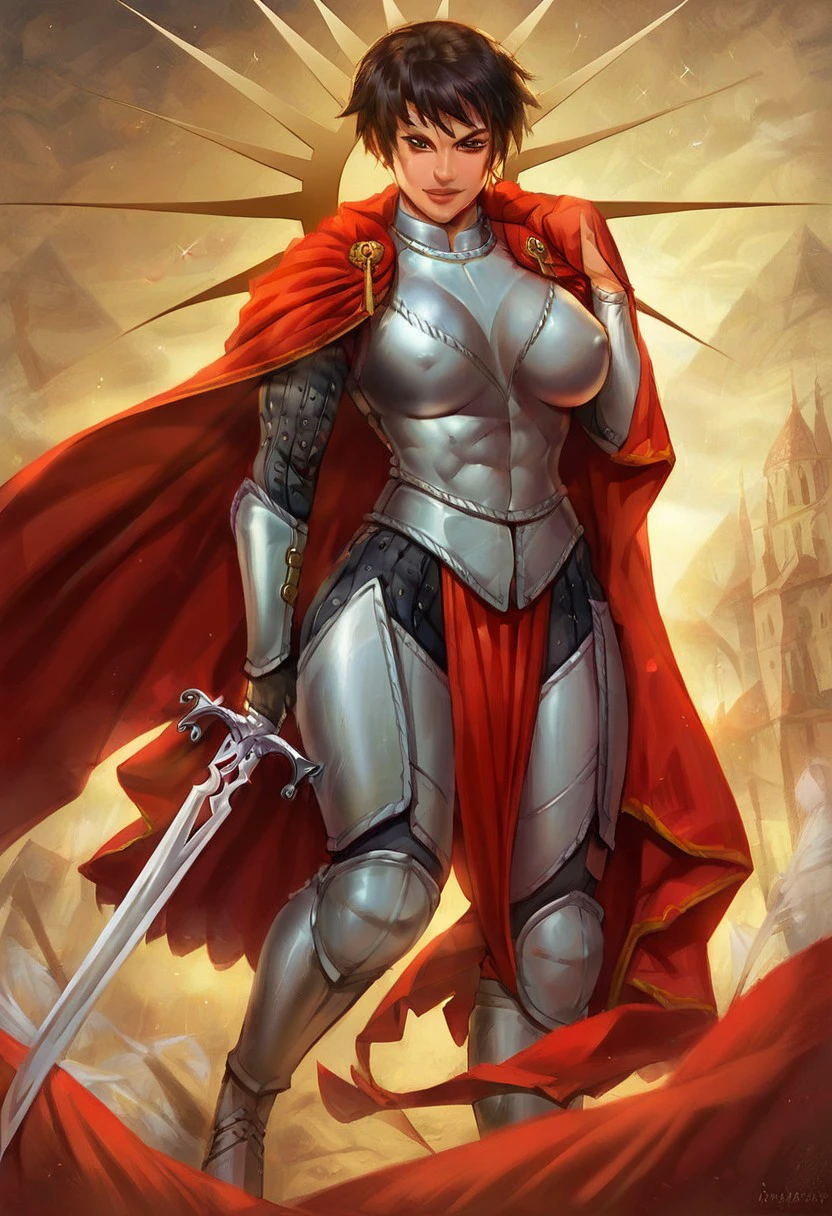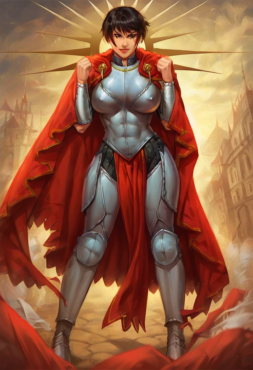 IomedaePathfinder, 1girl, solo, black hair, short hair, large breast, armor, full armor, silver armor, knight armor, shoulder armor, breastplate, pauldrons, gloves, vambraces, greaves, boots, high heels, pelvic curtain, sword, lips, armor ornament, cape, shield, brown eyes, scars, red cape, jewelry, earrings,