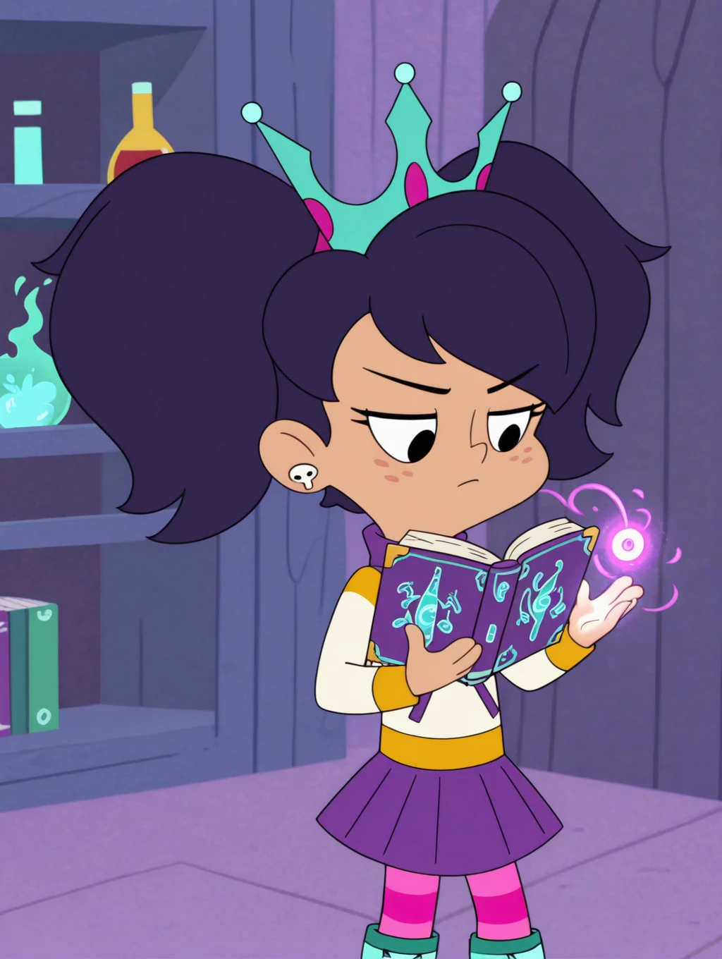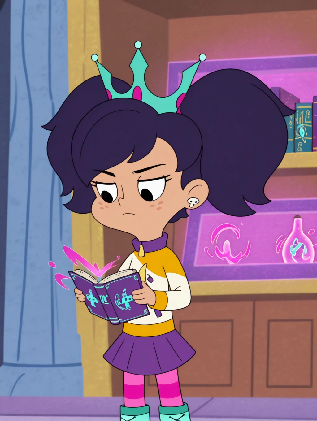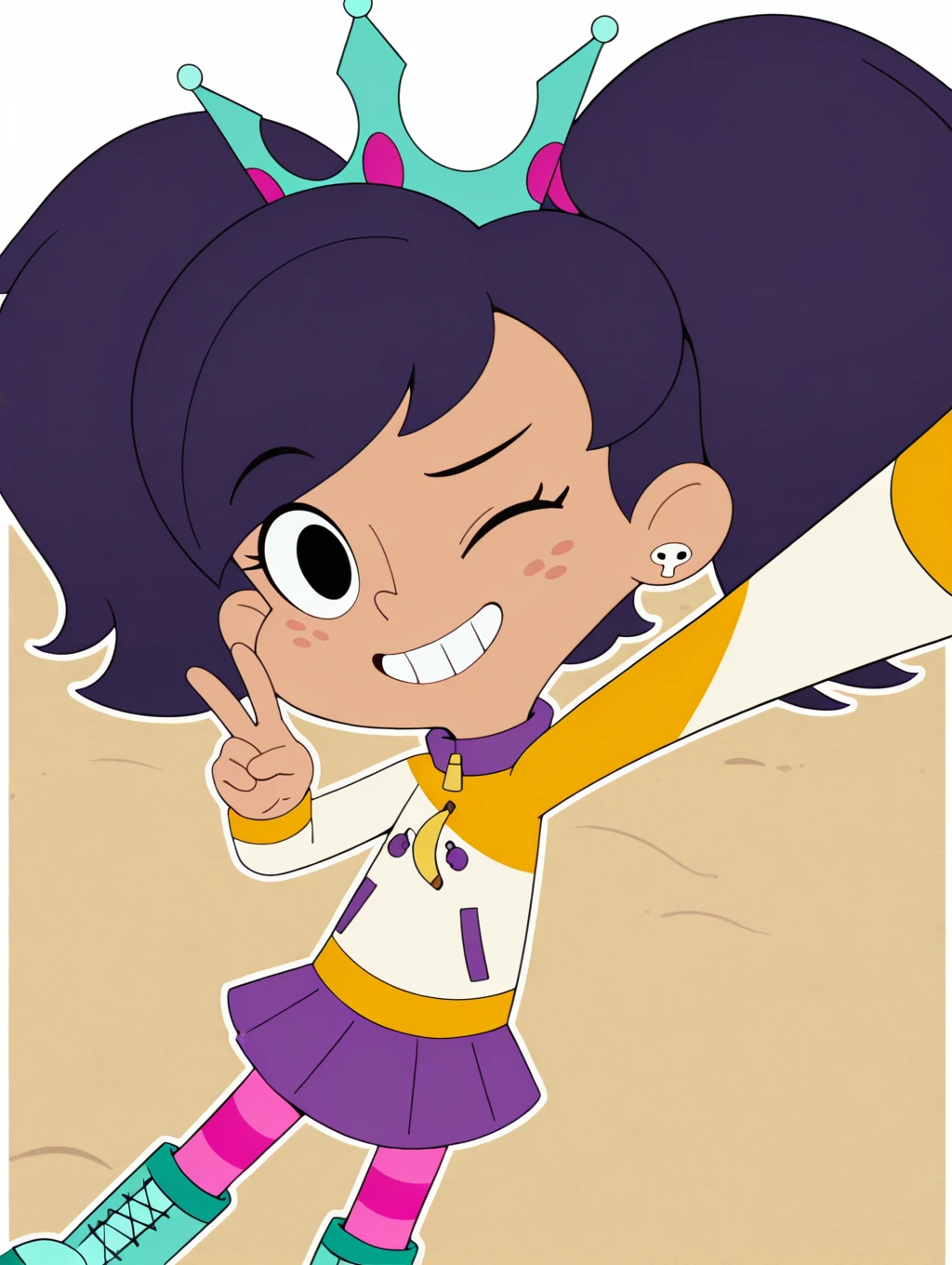Recommend prompt: "MariaZYN, black eyes, twintails, dark purple hair, tan skin, jewelry, earrings, crown,"