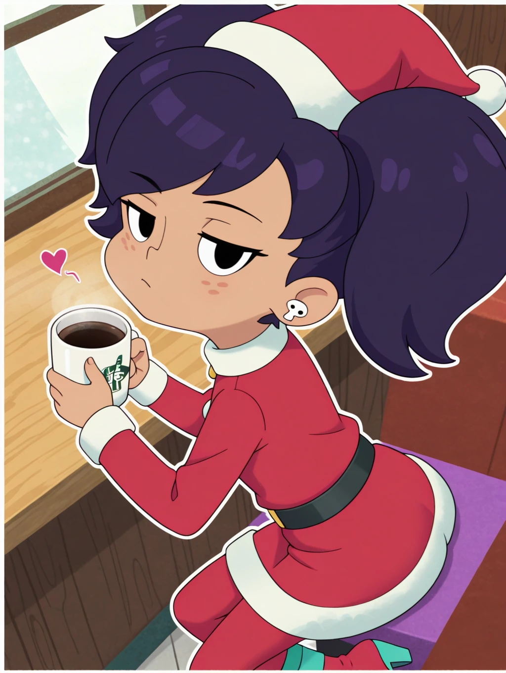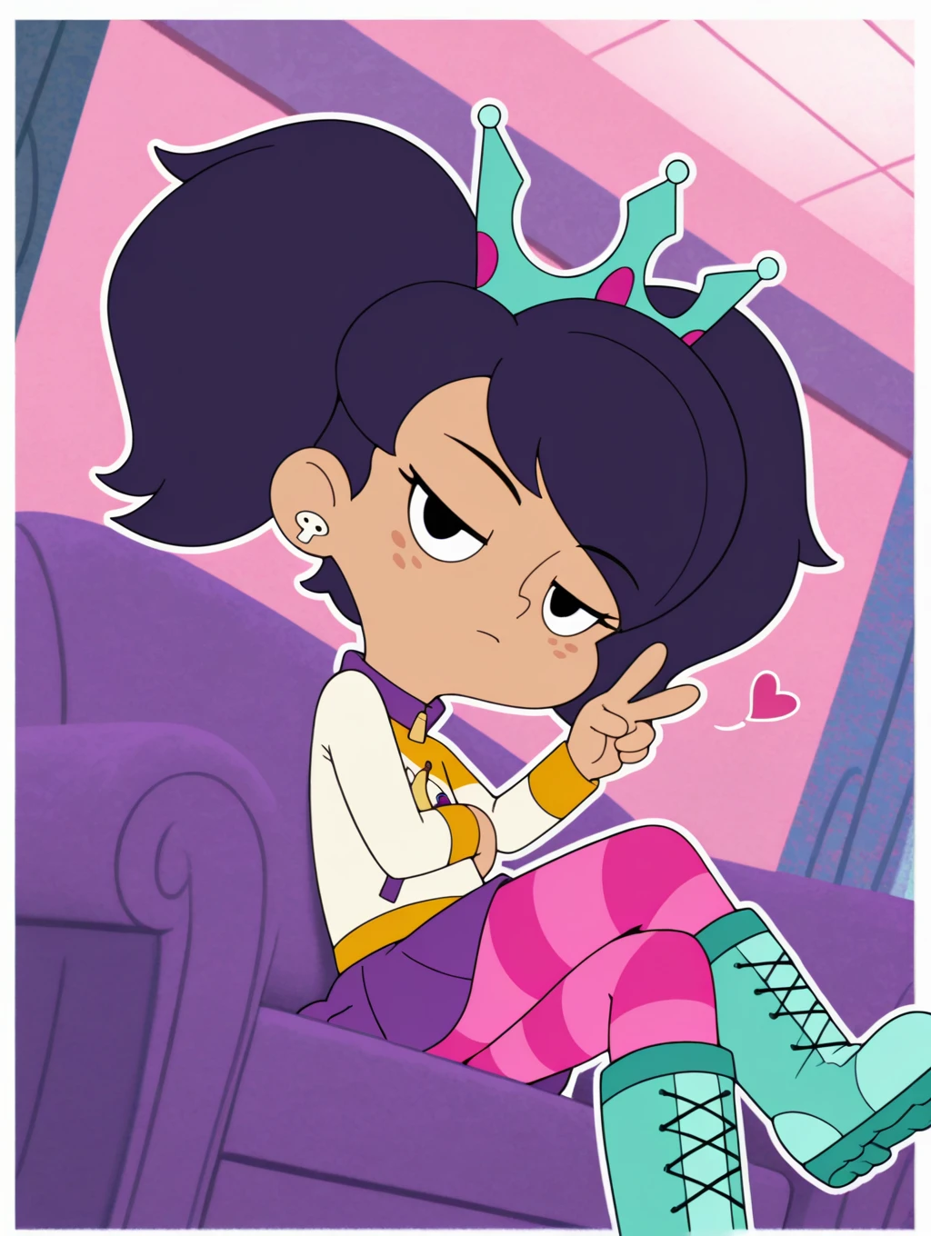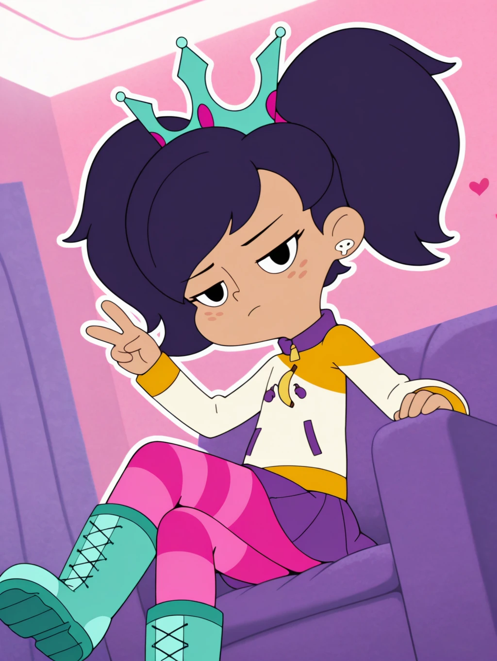 Recommend prompt: "MariaZYN, black eyes, twintails, dark purple hair, tan skin, jewelry, earrings, crown,"