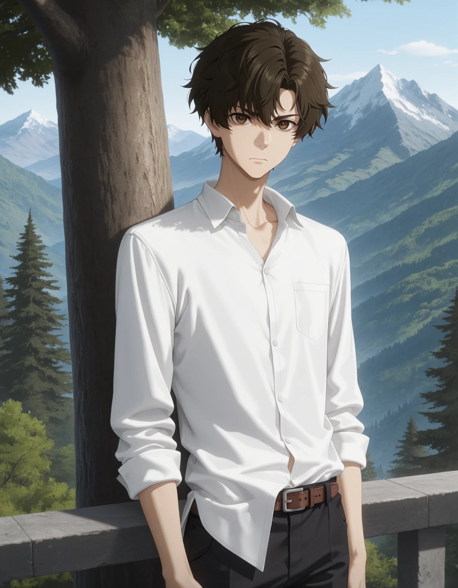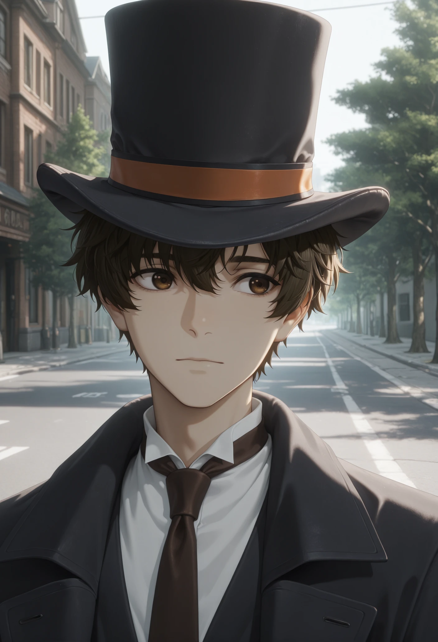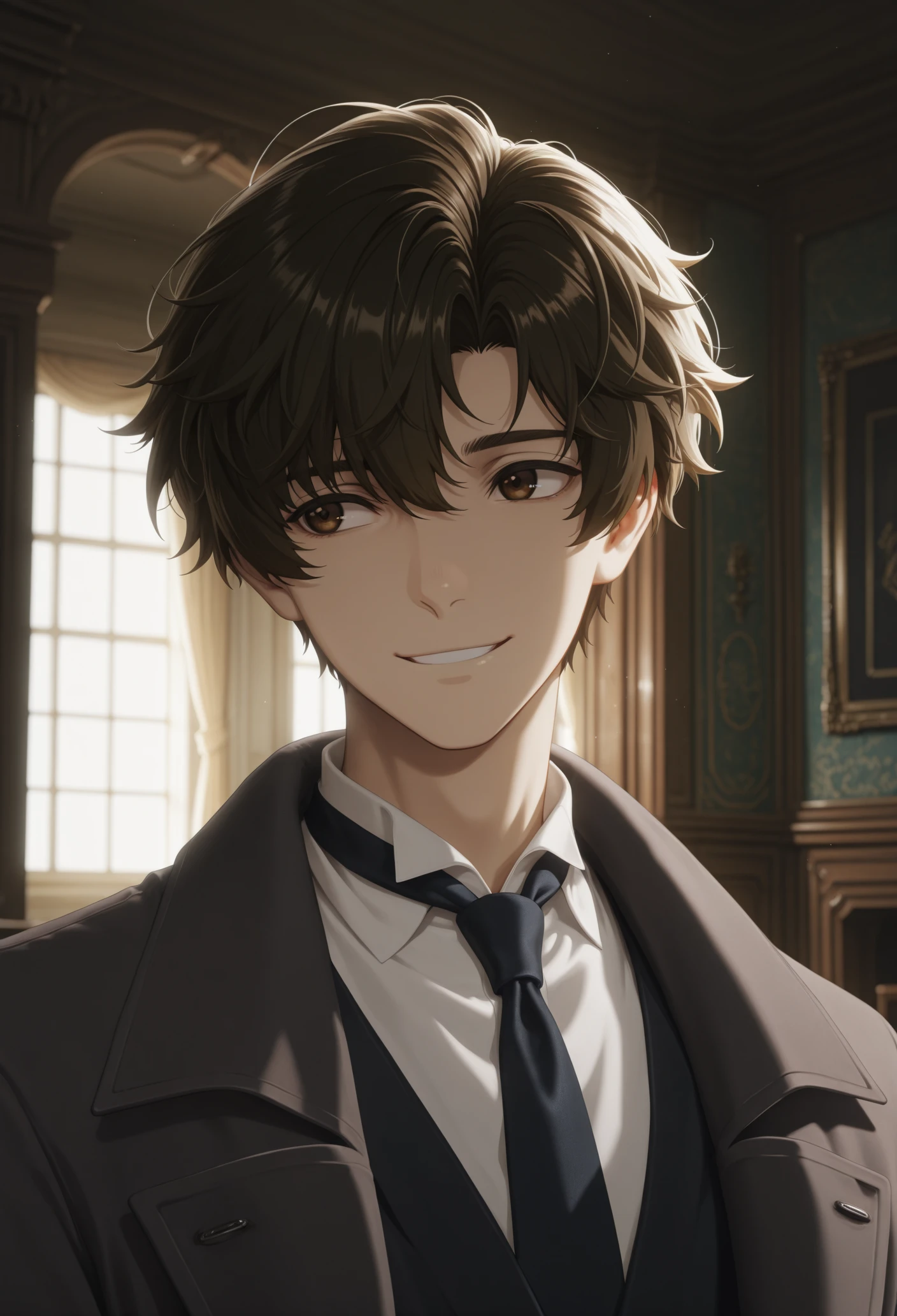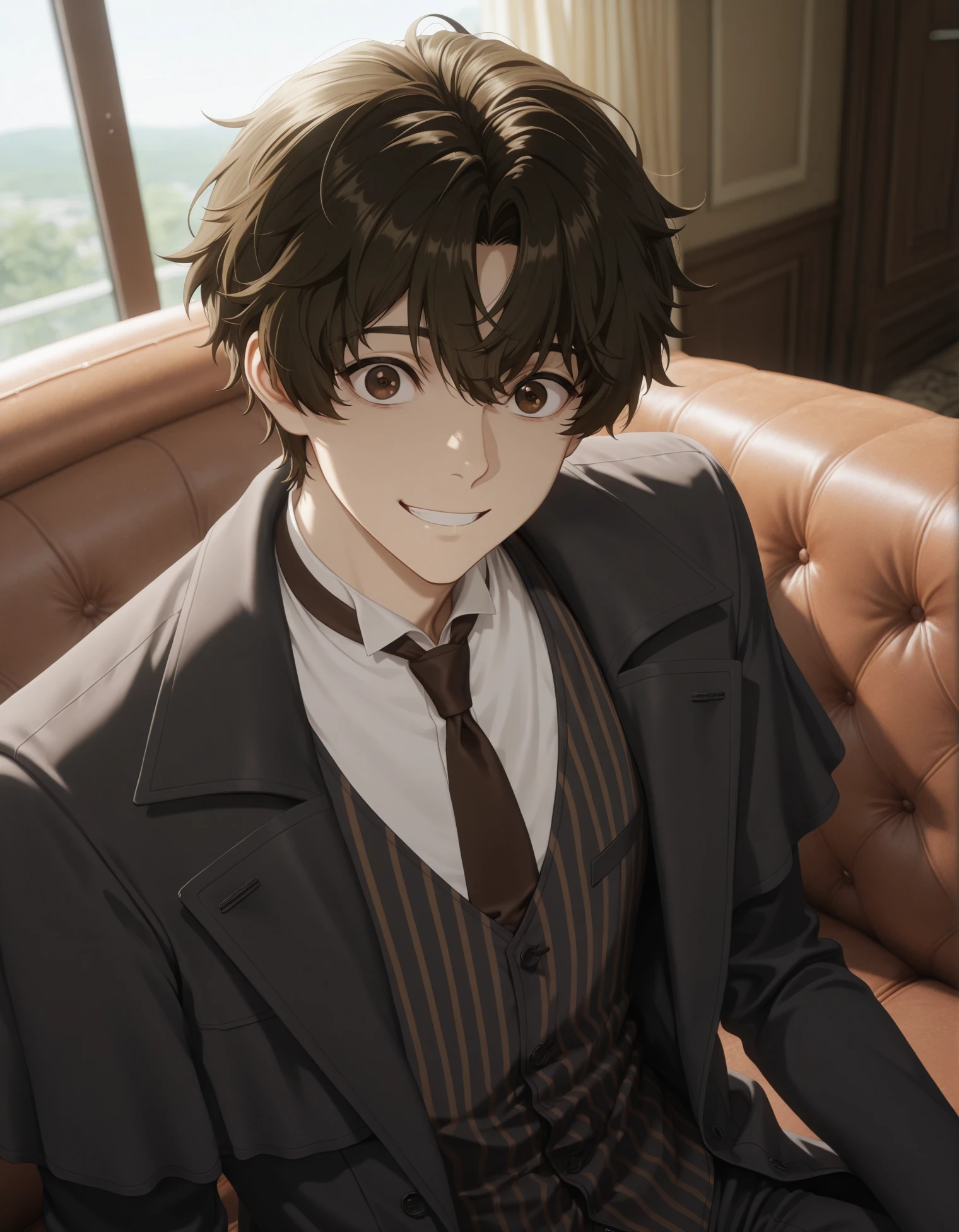 kl3in, 1boy, solo,slim, anime, half body, short brown hair, brown eyes, smiling, short wavy brown hair, suit, overcoat, white shirt, necktie, vest, striped vest,sitting on sofa,interior,day time,surprise expression,look at viewer