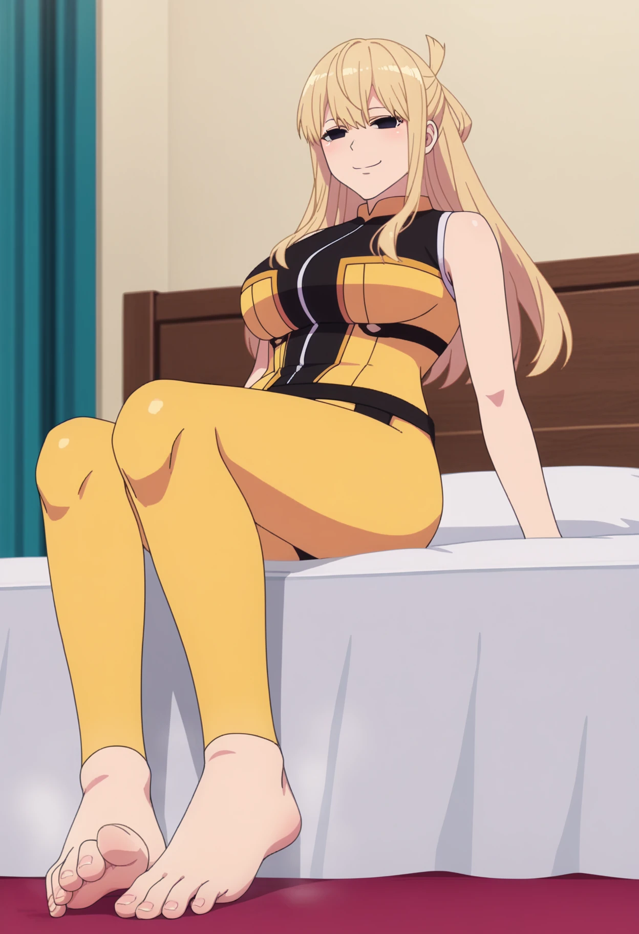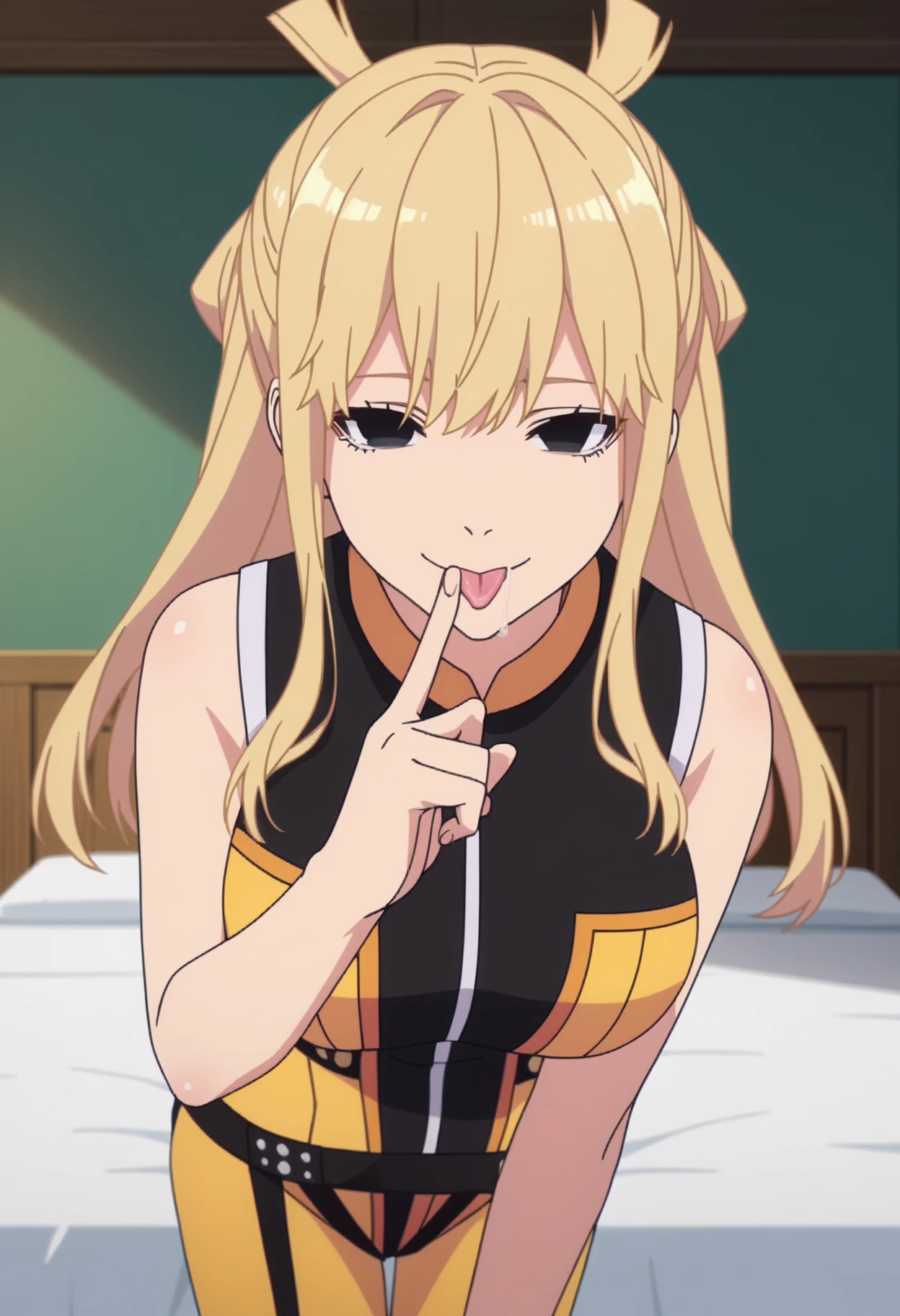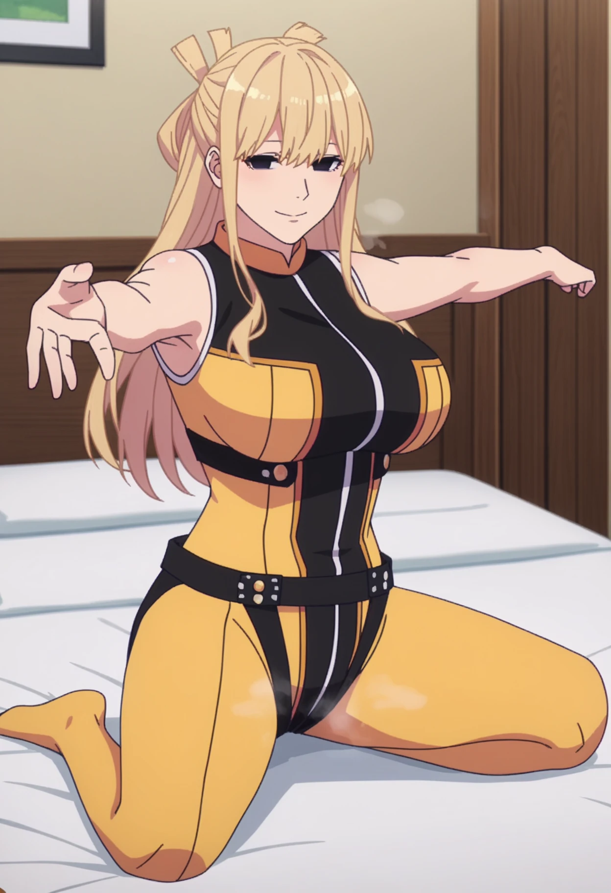 shigiridef, long hair, blonde hair, black eyes, empty eyes, sidelocks, large breasts, bare shoulders, yellow bodysuit, belt, sleeveless,
