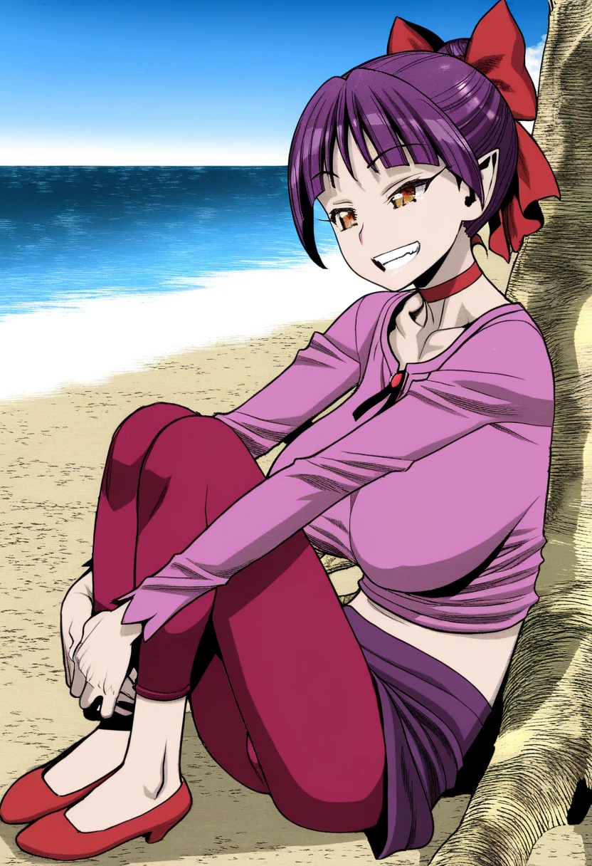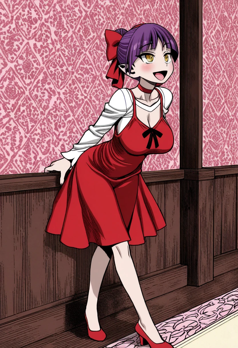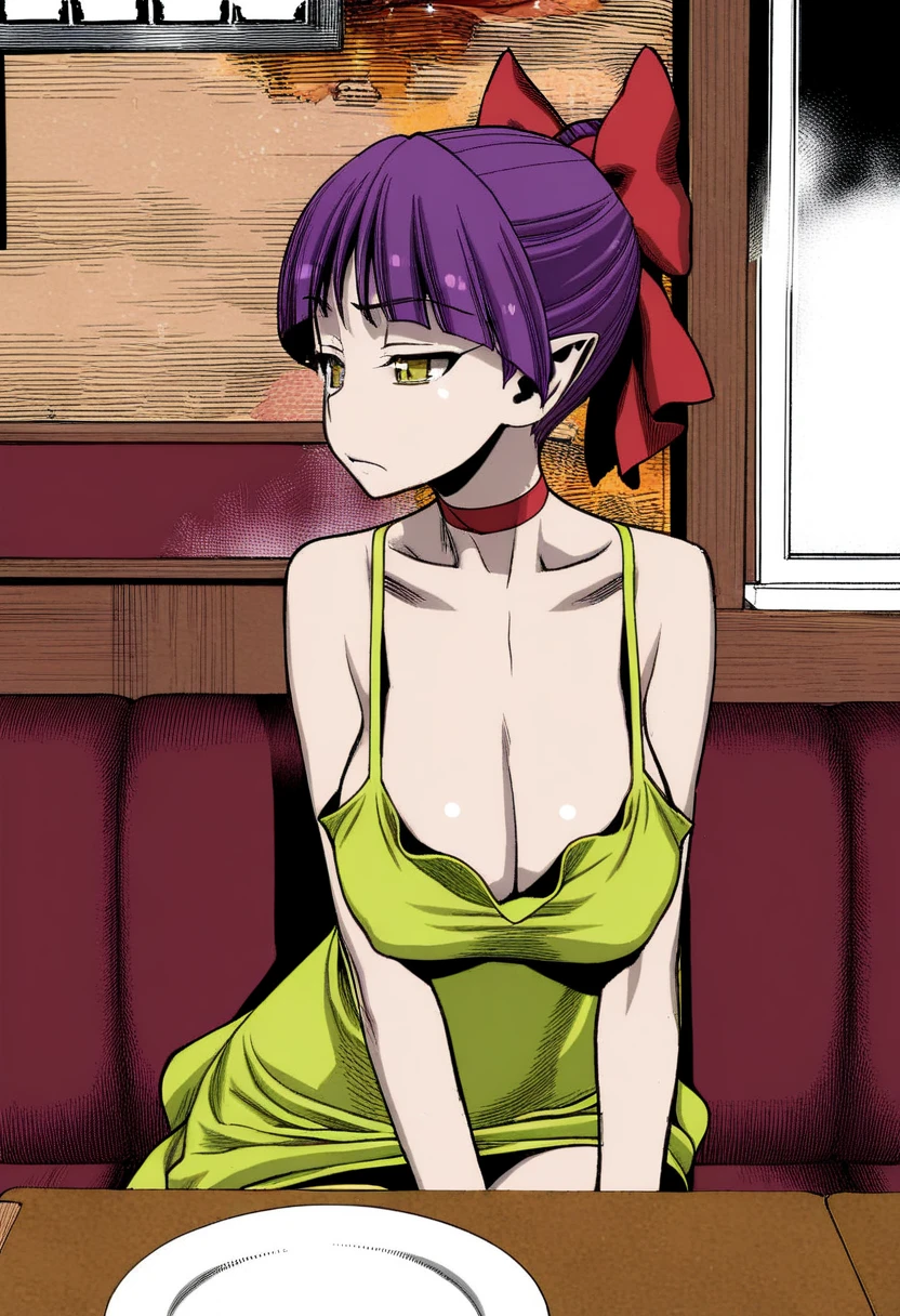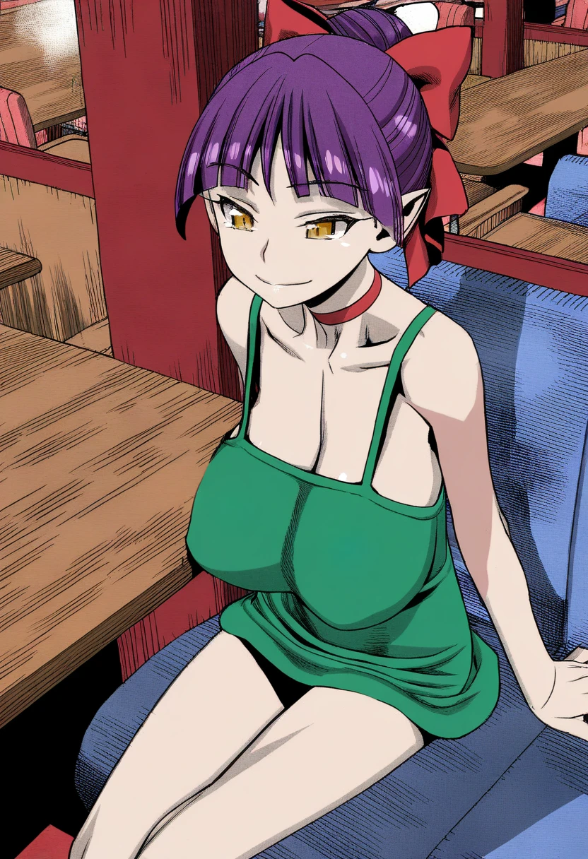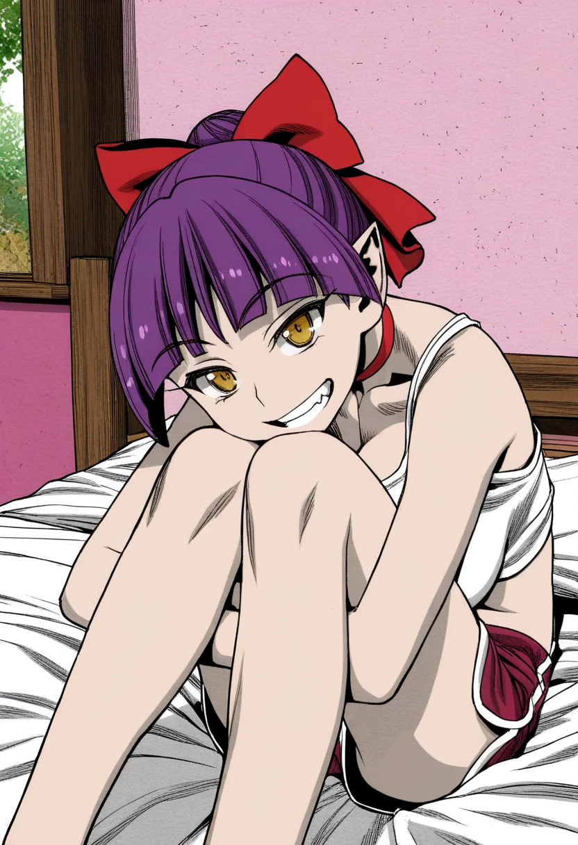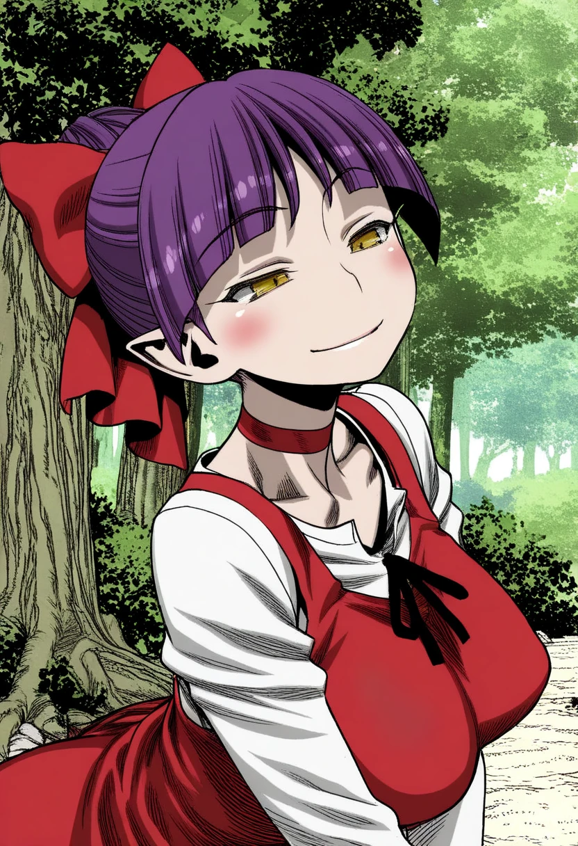 Nekomusume_Gerupin, purple hair, pointy ears, bangs, red bow, bow, ribbon, hair bow,