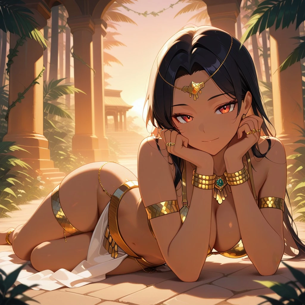 Basic & Accessory Tags: Apsara, silk and bronze bra, silk and bronze skirt, gold waist chains, hip chains, gold thigh chains, gold bangles, gold necklace, gold bracelets, gold anklets, gold tassles, gold rings, Indian aesthetics,