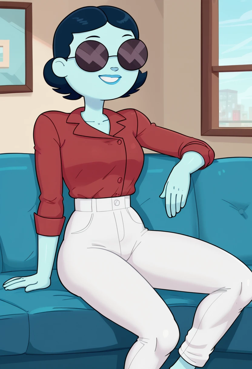 1girl, blue skin, s4intp1m, sunglasses, short hair, black hair, pants, red shirt