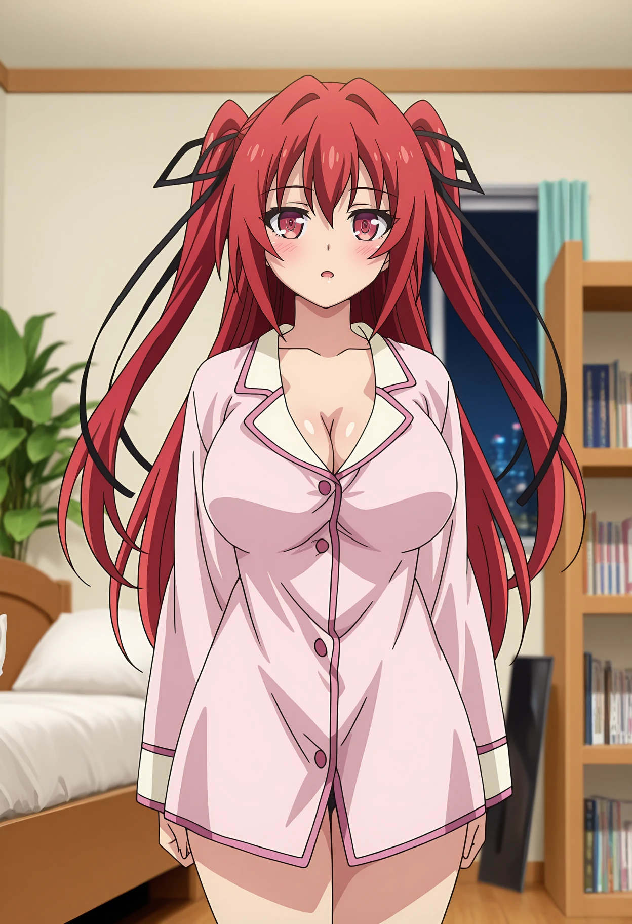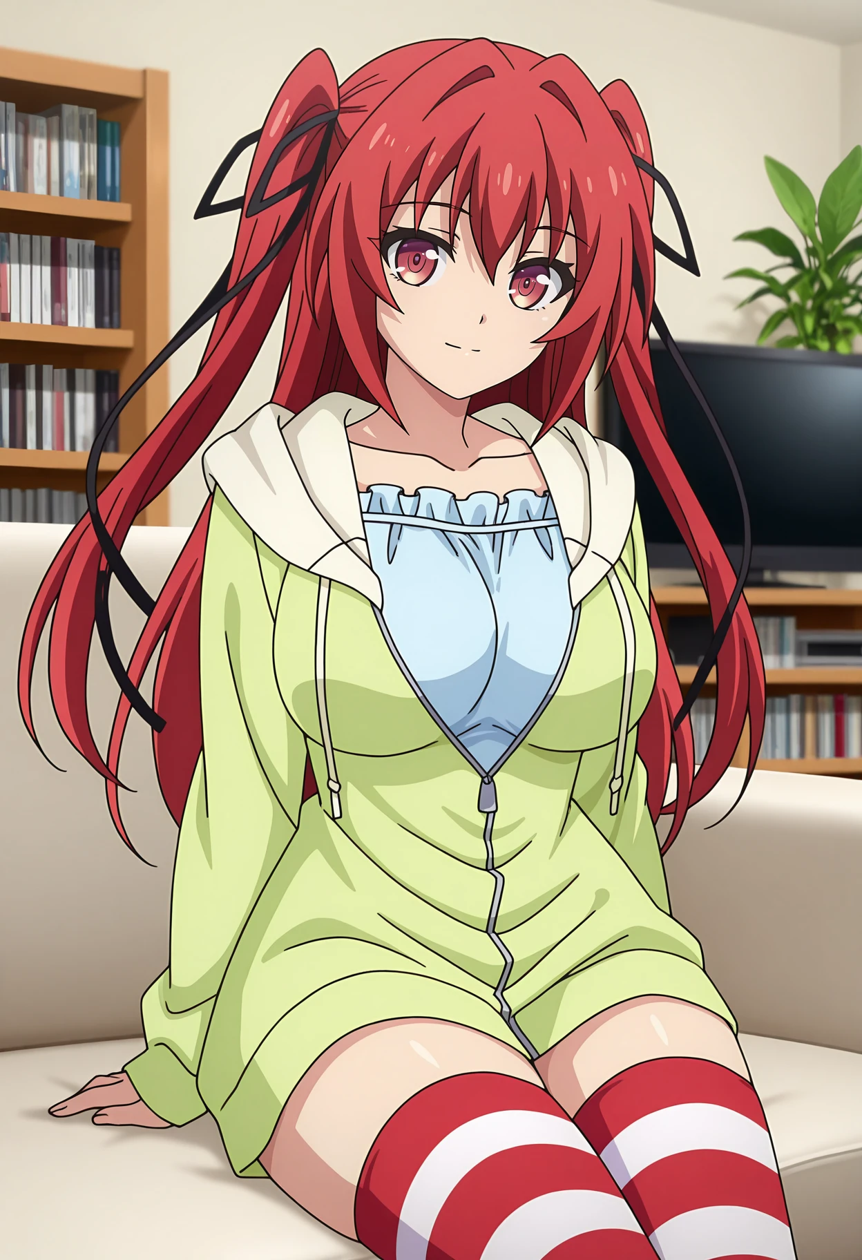 two side up, hair between eyes, long hair, red hair, multicolored eyes, hair ribbon, black ribbon