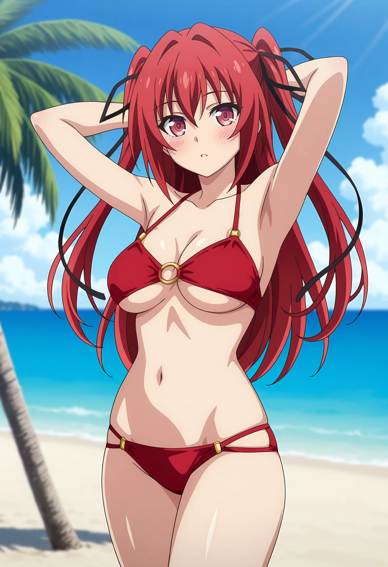 high ponytail, hair between eyes, long hair, red hair, multicolored eyes, hair ribbon, black ribbon