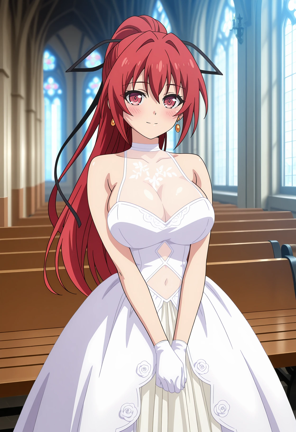 bare shoulders, earrings, white choker, wedding dress, white dress, see-through, large breasts, navel cutout, white gloves