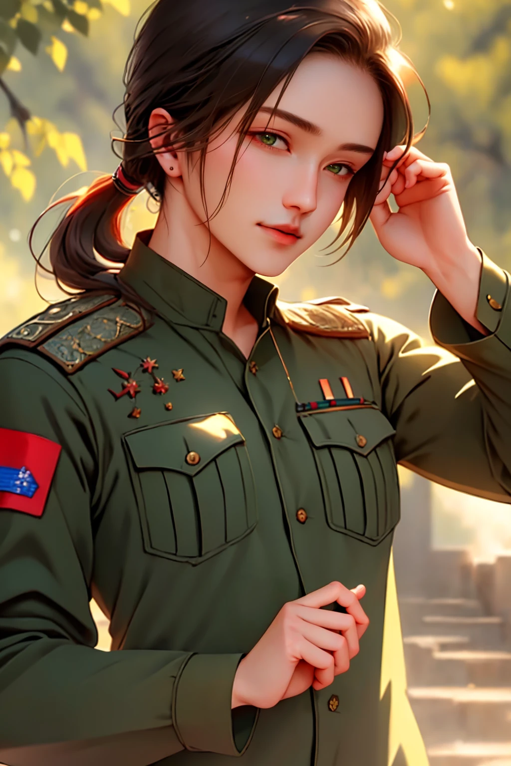 For his main outfit use: "NSChinaHetalia, brown hair, low ponytail, green military uniform, male focus"